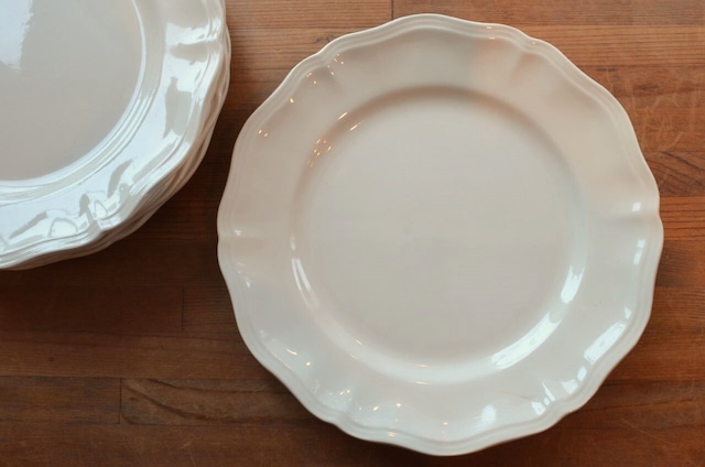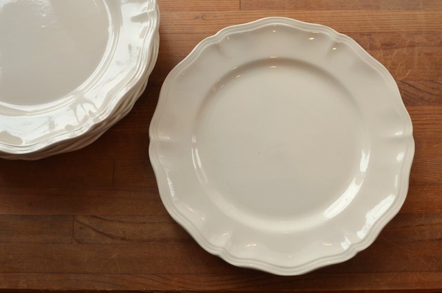 サイズ : φ25.7cm カラー : アイヴォリー地に花リム コンディション : 経年による、シミ、キズ、汚れ、貫入などありますが、窯キズ以外に目立ったカケなどはありません。尚、表面にブラウンの線(写真4〇)が付いています。全体的には大変綺麗で良好です。 ※バックスタンプはありません ※こちらはバックスタンプがないので、年代はわかりかねます フランス製