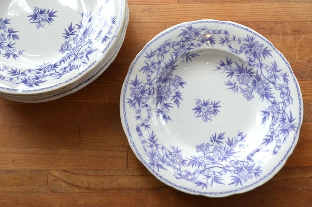 SARREGUEMINES EPINE(サンザシ) U&C 年代 : 1920年代 サイズ : φ22.3×h3.4cm カラー : ホワイト地に、パープルのリボンにサンザシの花と実がからんでいます コンディション : 経年による、キズ、汚れ、貫入などほとんどなく、目立ったカケもありませんが、リムに黒いシミ(写真7,8〇)がありますが、それ程気にならないと思います。全体的には大変綺麗で良好と思います。 フランス製