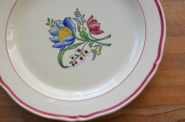 Gien Savoieシリーズ ハンドペイント 年代 : 1940年代 サイズ : φ24.8cm カラー : 薄いベージュ地にブルー、ダークピンク、イエローのフラワー柄、葉はグリーン、リムはダークピンクのラインで花リム コンディション : 経年による、シミ、キズ、汚れ、貫入などあります。又、表面に極小さなカケ(写真4)があり、リムにもカケ(写真5左から2番目〇と一番右〇の左側)があり、因みに一番左〇と一番右〇の右側は窯キズで、右側の窯キズの周りにも小さなカケが見られます。全体的には大変綺麗で良好と思います ※バックスタンプ有ります ※フランス製