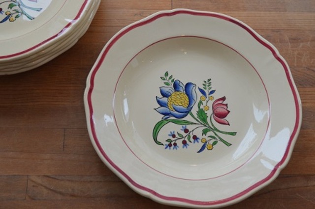 Gien Savoieシリーズ ハンドペイント 年代 : 1940年代 サイズ : φ24.9×h3.5cm カラー : 薄いベージュ地にブルー、ダークピンク、イエローのフラワー柄、葉はグリーン、リムにダークピンクのラインで花リム コンディション : 経年による、シミ、キズ、汚れ、貫入などあります。写真4は窯キズで、写真はありませんがもう1か所あります。尚、写真2は製造時に付いたものです。全体的には大変綺麗で良好と思います ※フランス製