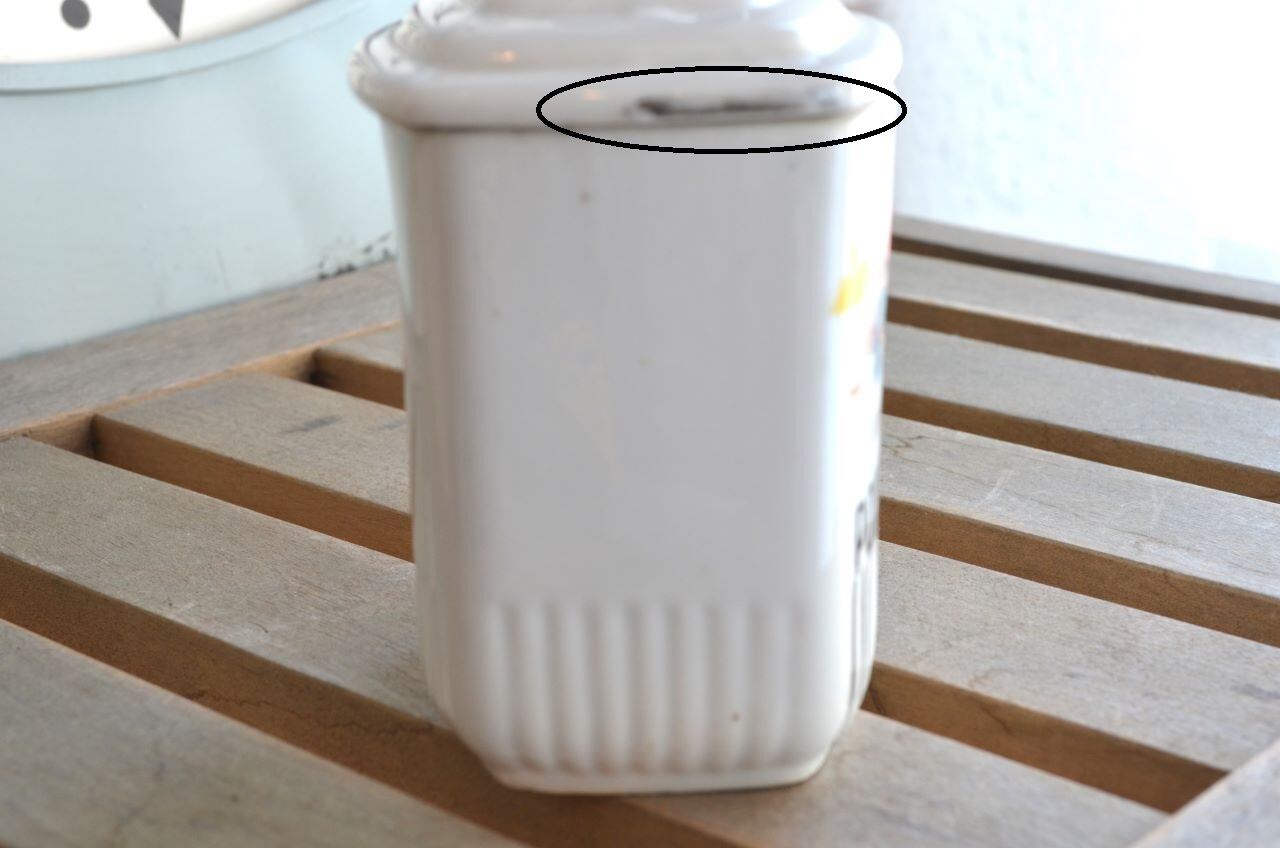 コンディション : 経年による、シミ、キズ、汚れなど若干ありますが、本体には目立ったカケなどありませんが、蓋の裏側に1か所極小さなカケ(写真10)があります。又、蓋のつまみ部分に製造時に付いた極小さな穴(写真3△)があります。全体的には大変綺麗で良好と思います。尚、蓋前方のリムのシルバー部分が若干剥げ(写真3,7,8)ています。