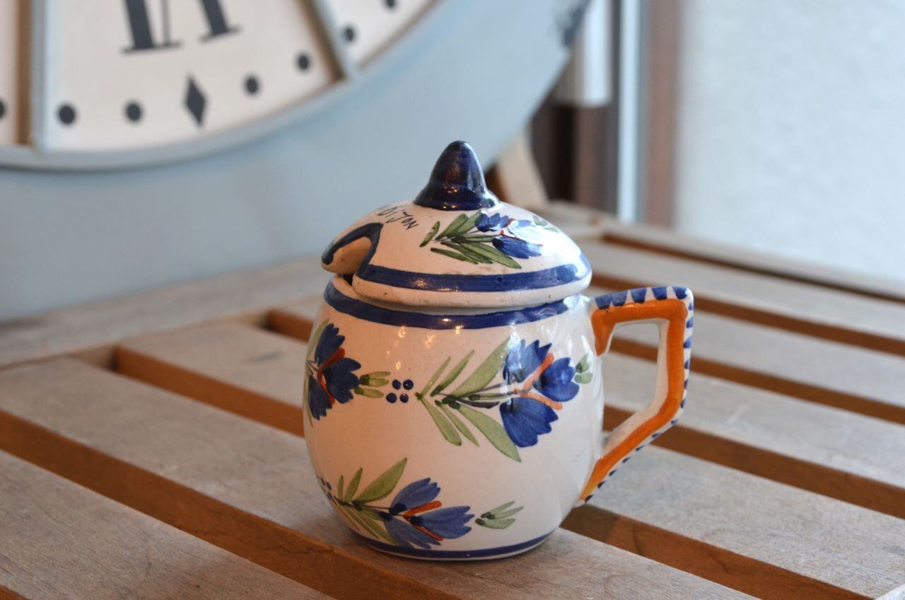 コンディション : 経年による、シミ、キズ、汚れ、貫入などあります。又、目立ったカケはありませんが、本体と蓋のリムに擦れ感(写真4)があります。又、内側底に製造時に付いた凹み(写真4左〇があります。全体的には大変綺麗で良好でかわいらしいポットと思います。