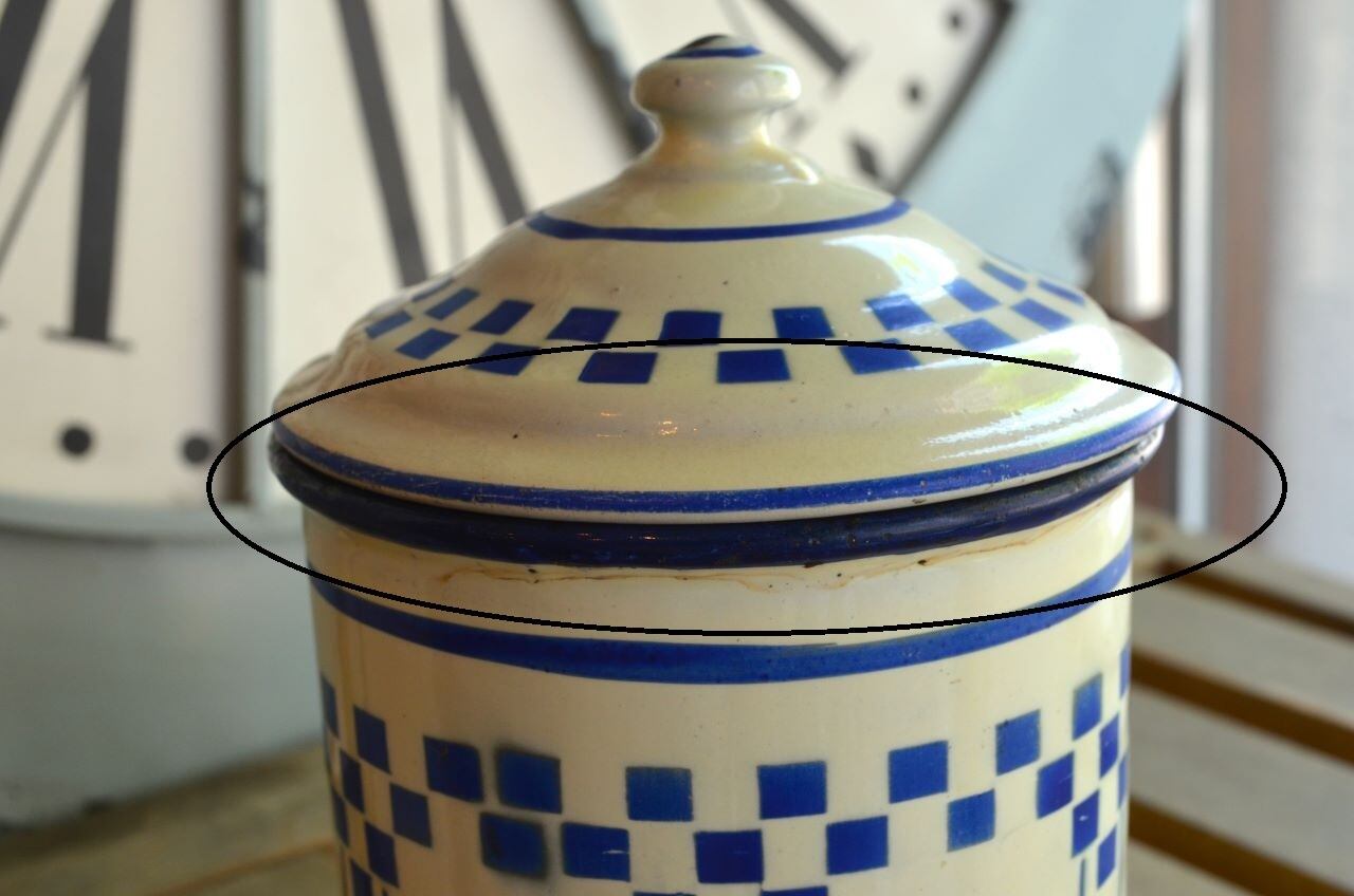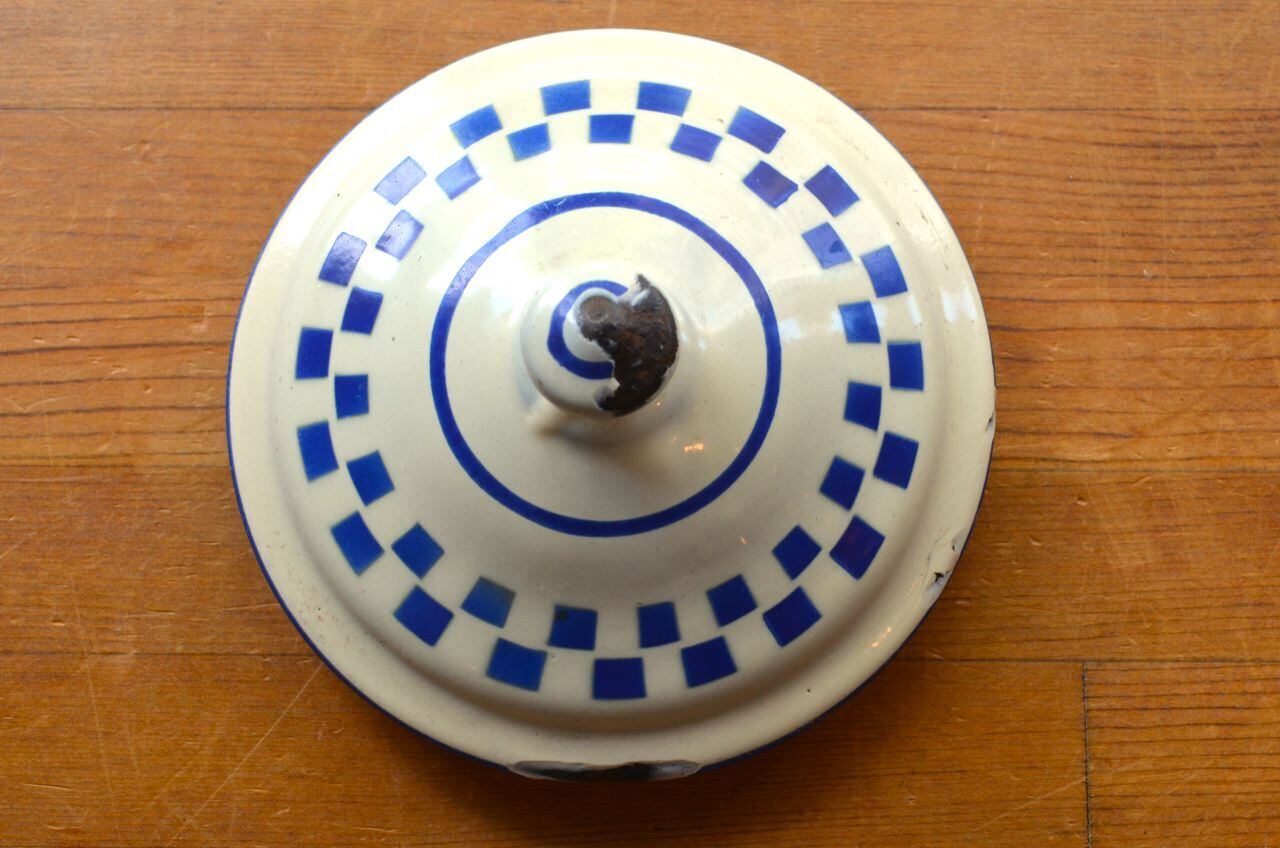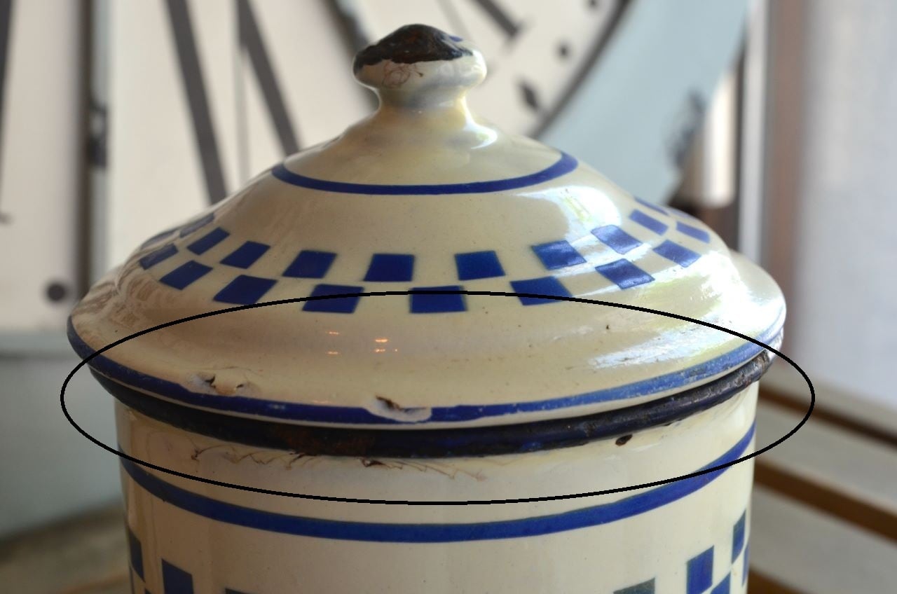 コンディション : 経年による、シミ、キズ、汚れ、サビなどあり、本体上部リムにシミのライン(写真2,6)があります。エナメルがカケて剥がれてる(写真8~16)部分があります。全体的には悪くないと思いますが、カケなど気になる方はご遠慮ください。