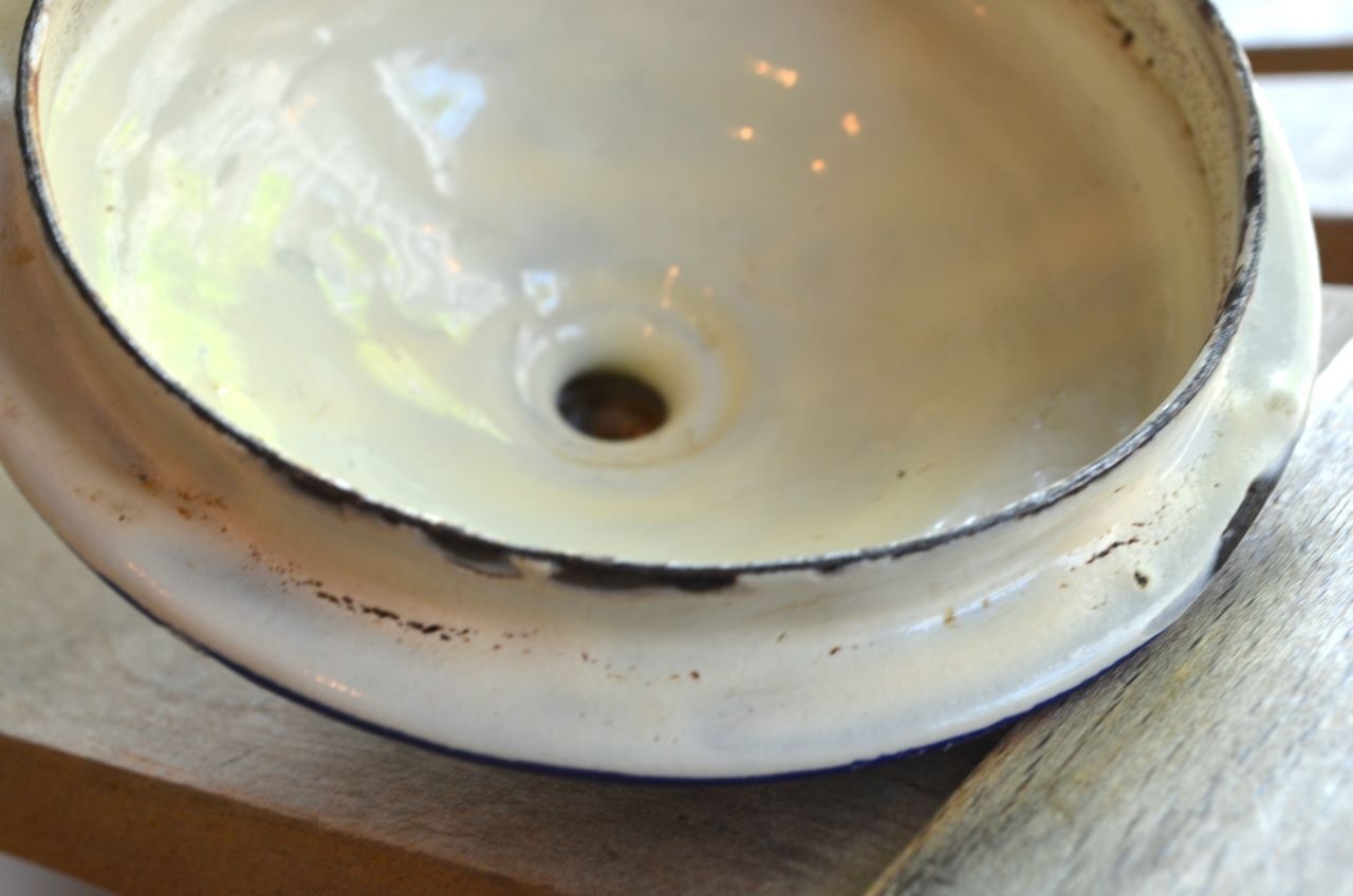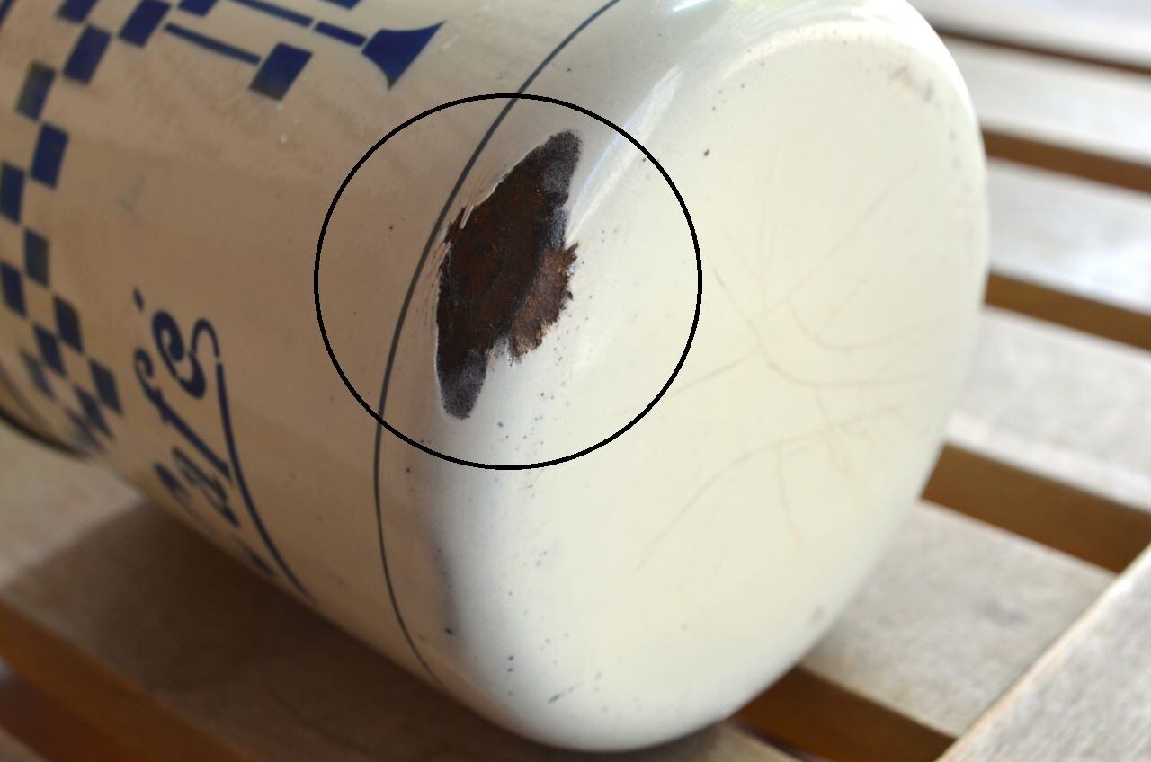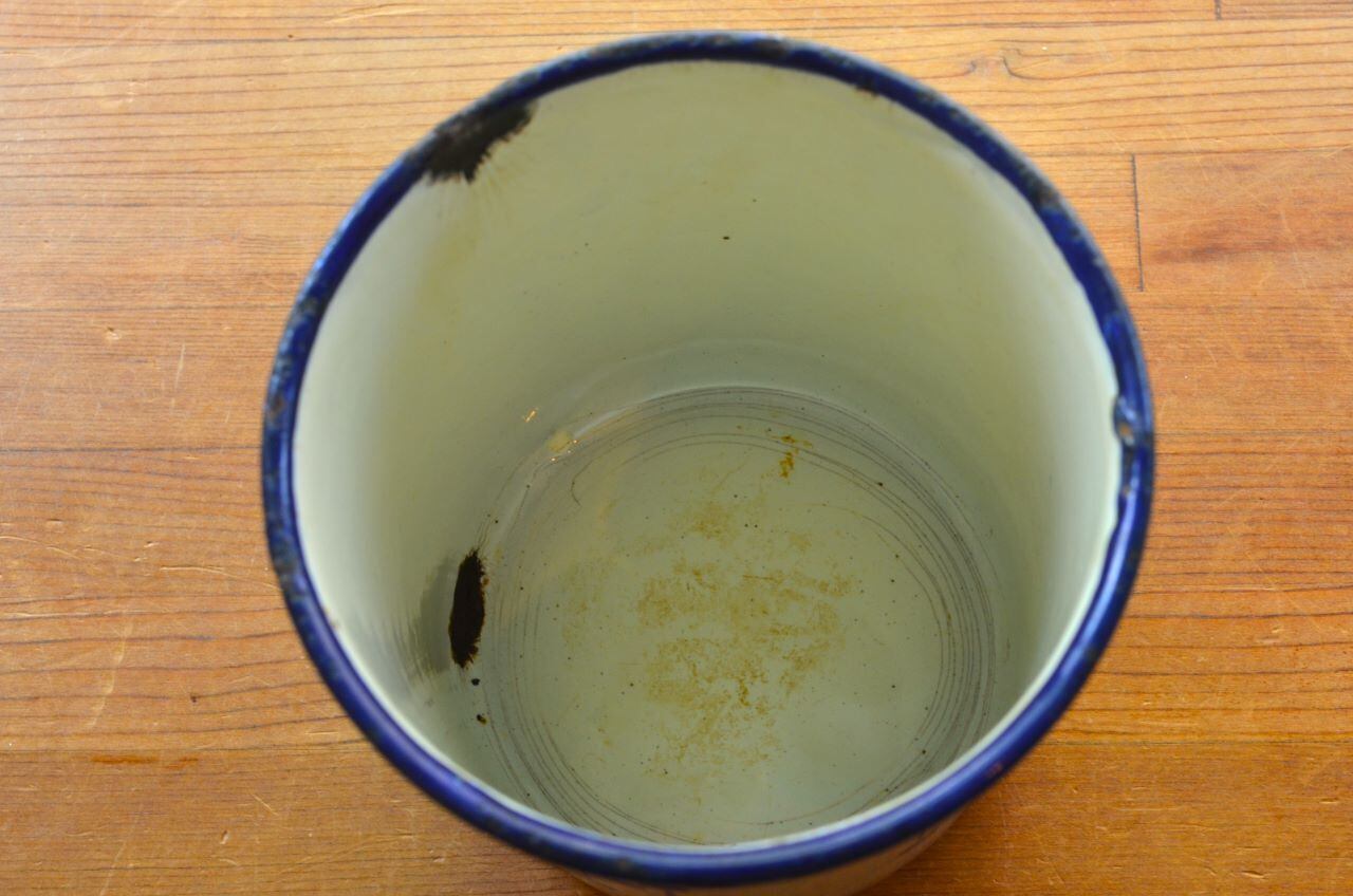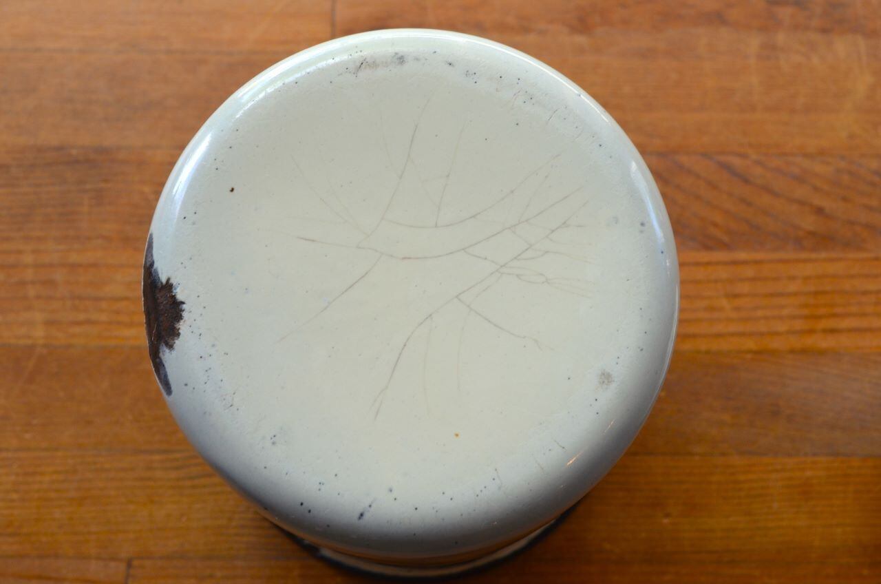 コンディション : 経年による、シミ、キズ、汚れ、サビなどあり、本体上部リムにシミのライン(写真2,6)があります。エナメルがカケて剥がれてる(写真8~16)部分があります。全体的には悪くないと思いますが、カケなど気になる方はご遠慮ください。