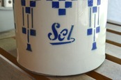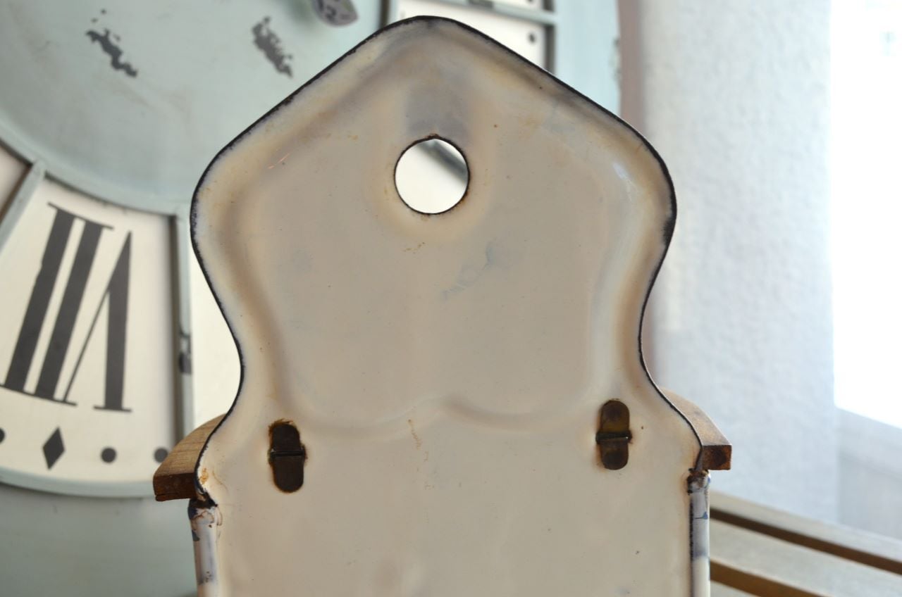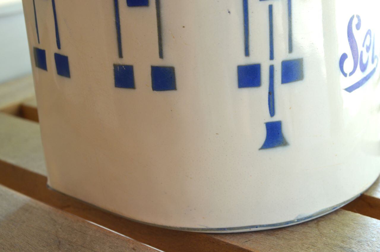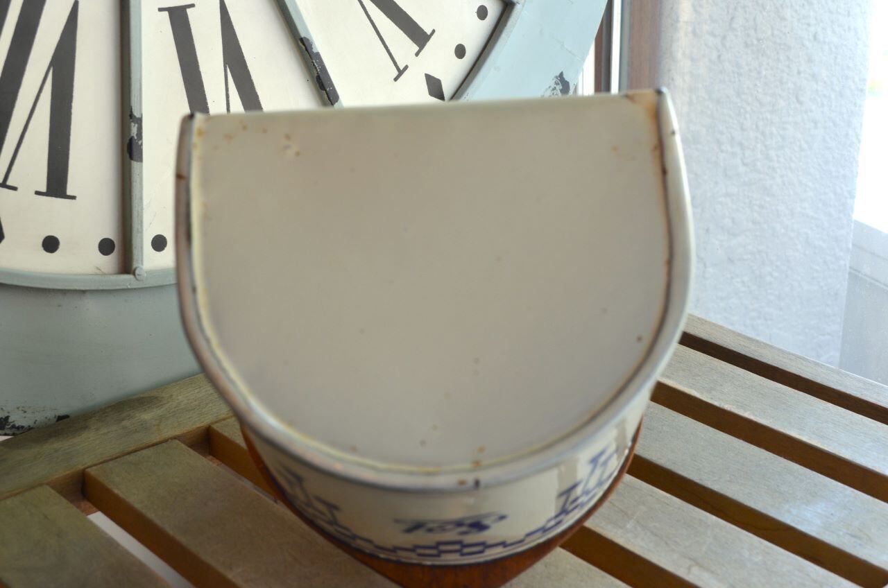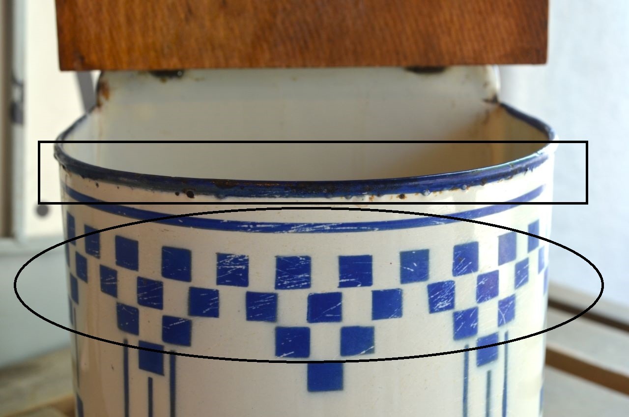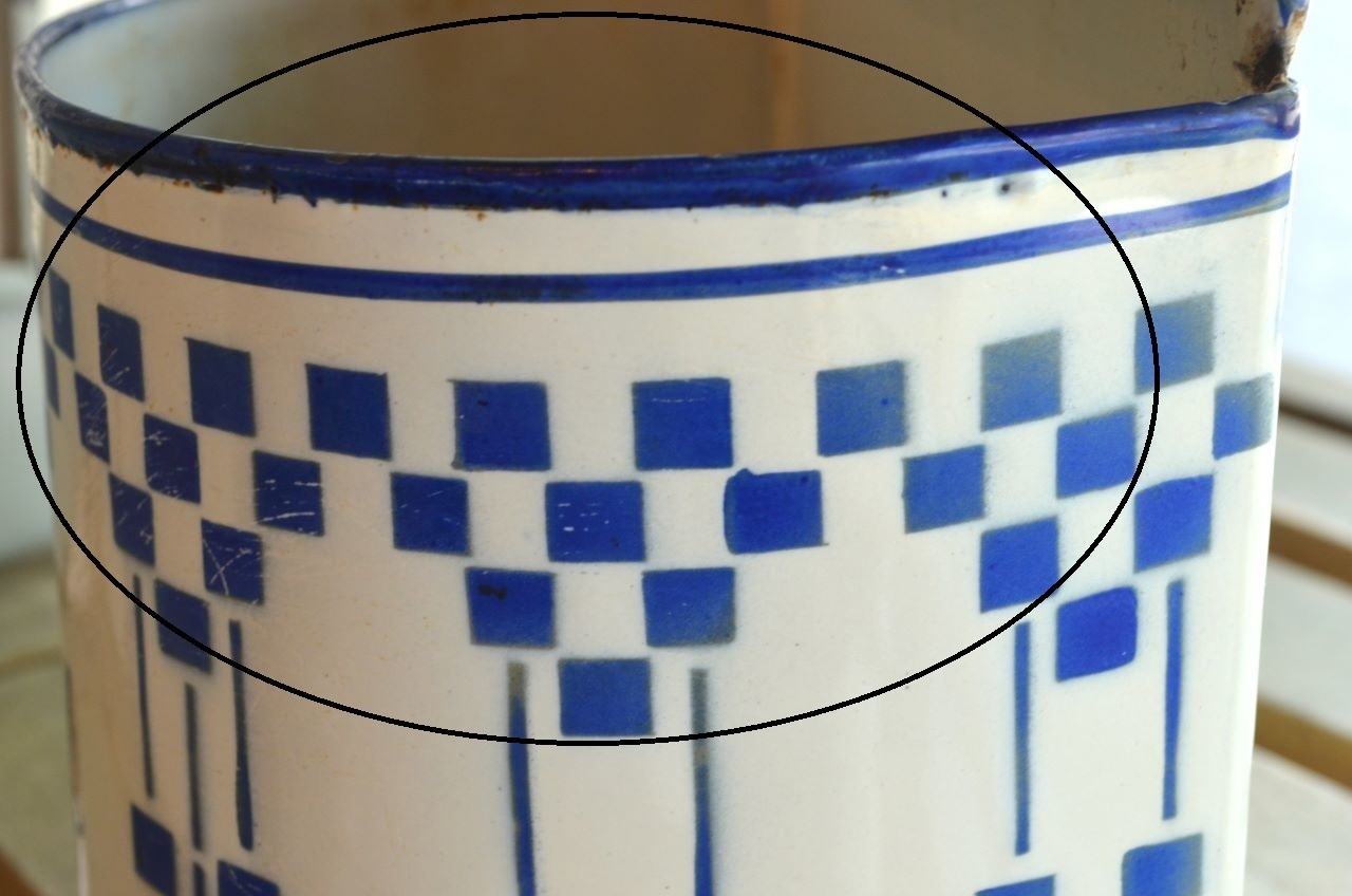 コンディション : 経年による、シミ、キズ、汚れ、サビなどあり、カケてエナメルが剥がれ(写真6の△)ている部分がありますが、目立たないと思います。又、正面の市松模様のブルーの部分にキズ(写真4,6,8の〇)が結構見られます。尚、写真4の▭は製造時に塗ったブルーの色の厚く固まった部分が、剥がれて錆になったり、そのまま付いていたりします。全体的には蓋の使用感なども見られますが、大変良好と思います。