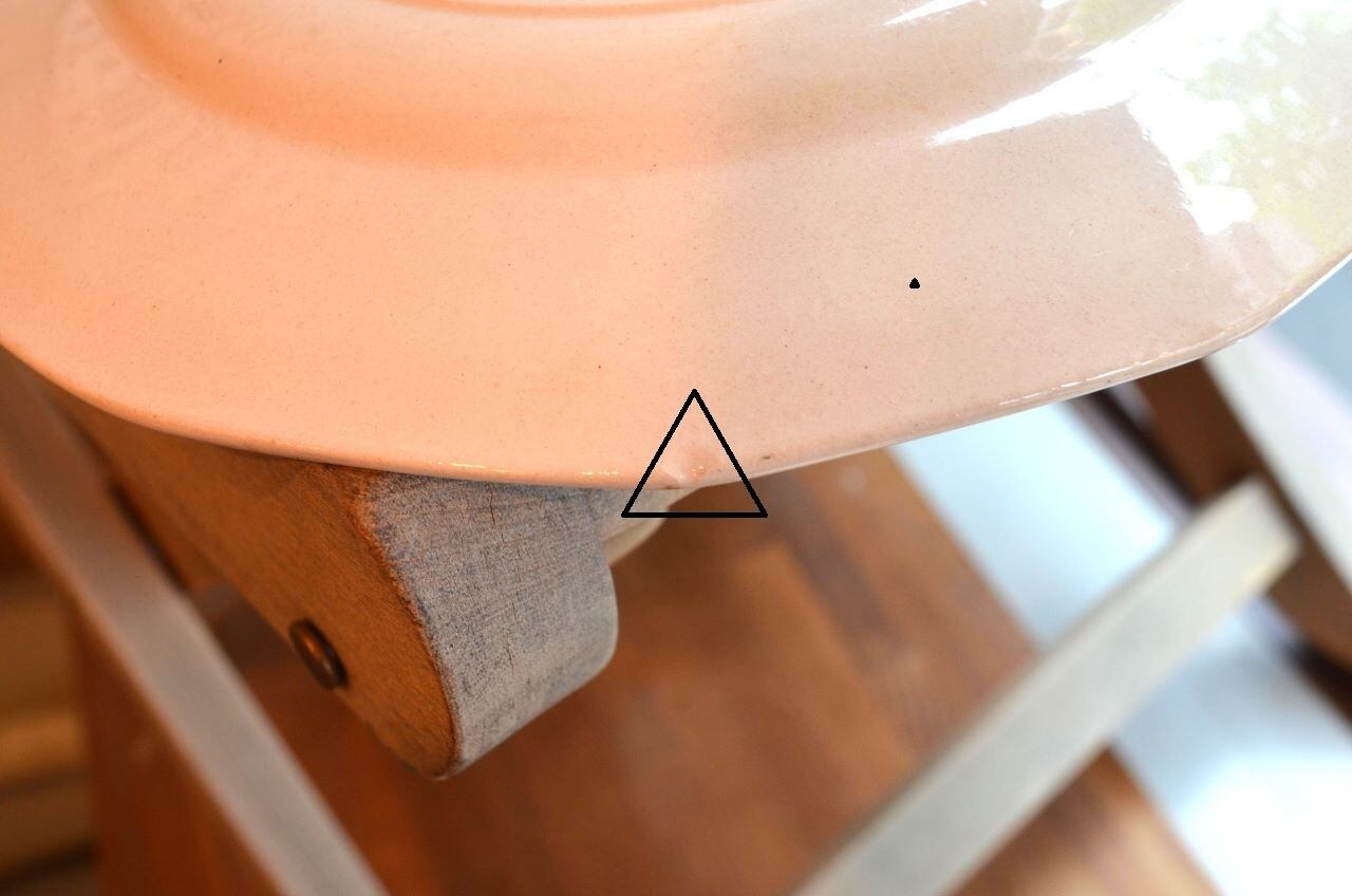 コンディション : 経年による、シミ、キズ、汚れ、貫入などあり、窯キズの右横に極小さなカケ(写真6)が2か所あり、裏側リムにも極小さなカケ(写真7の〇)があります。尚、写真7の△は製造時に付いた凸で、写真8は製造時に付いたカケに釉薬を塗ったものです。全体的には大変良好と思います。