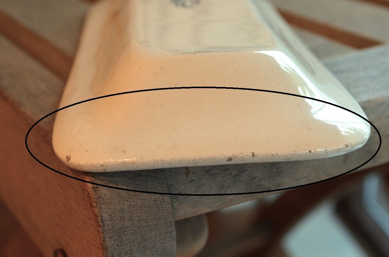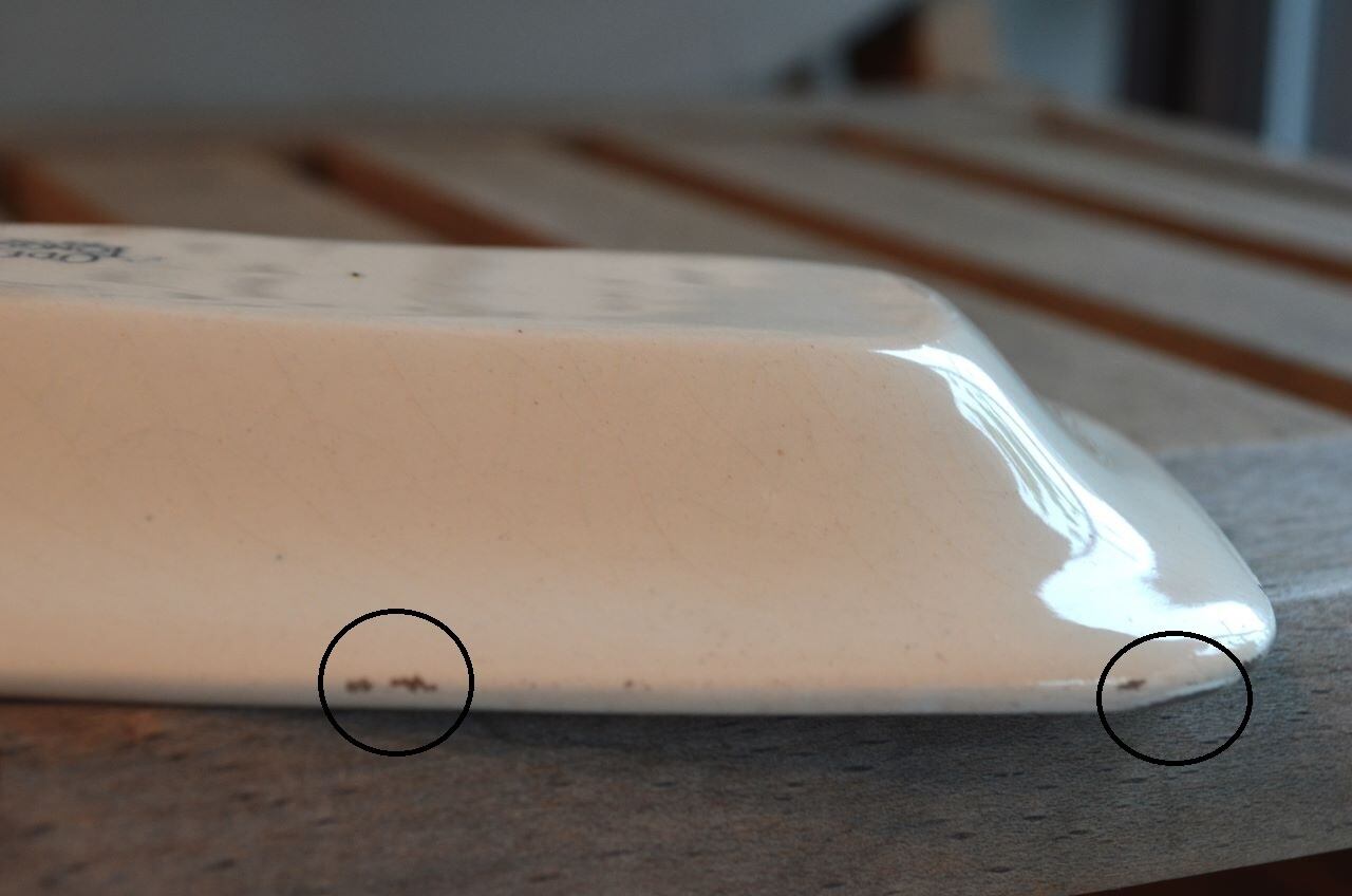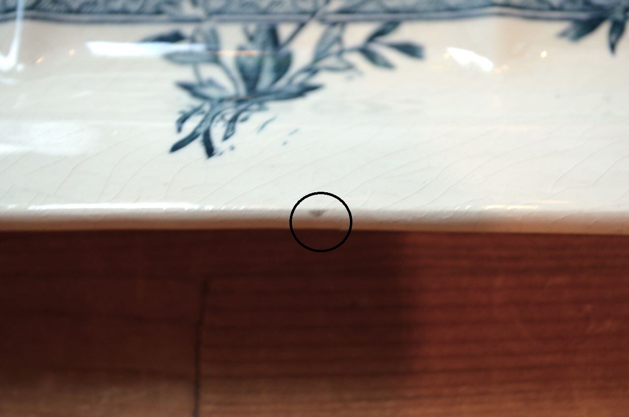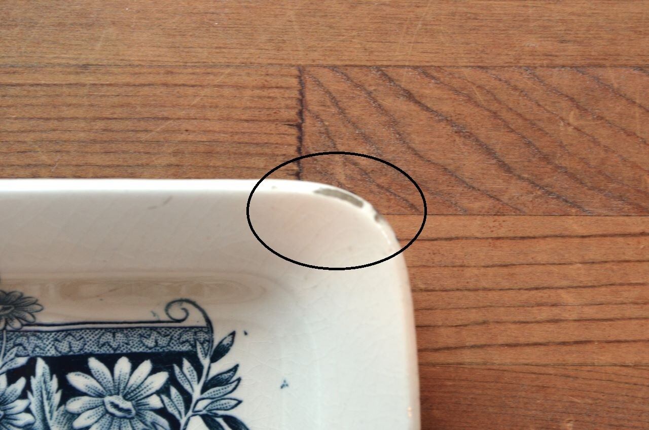 コンディション : 経年による、シミ、キズ、汚れ、貫入などあり、リムに数か所カケ(写真6,7,8)があり、写真6のカケは0.3×1.0cmと0.3×0.3cm程あります。又、裏側リムにもカケとブルーの色が飛んだ部分(写真9,10,11,12,13)が結構ありますが、全体的に良好でかわいらしい歯ブラシトレイと思います。アクセサリー入れにいかがでしょうか。