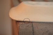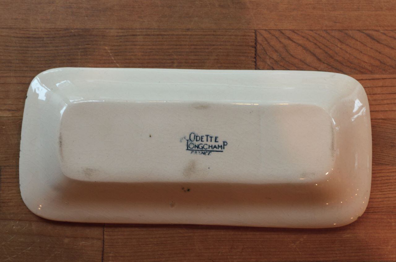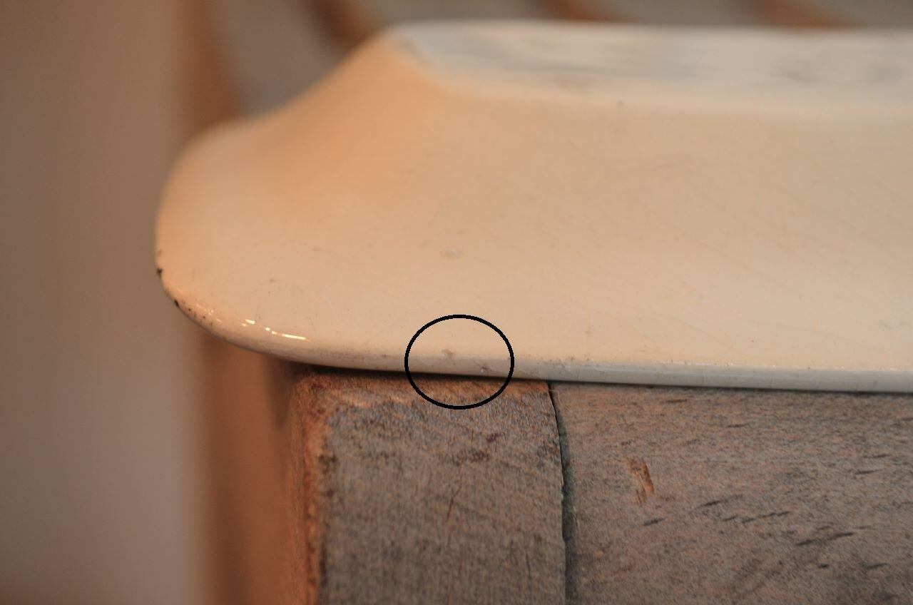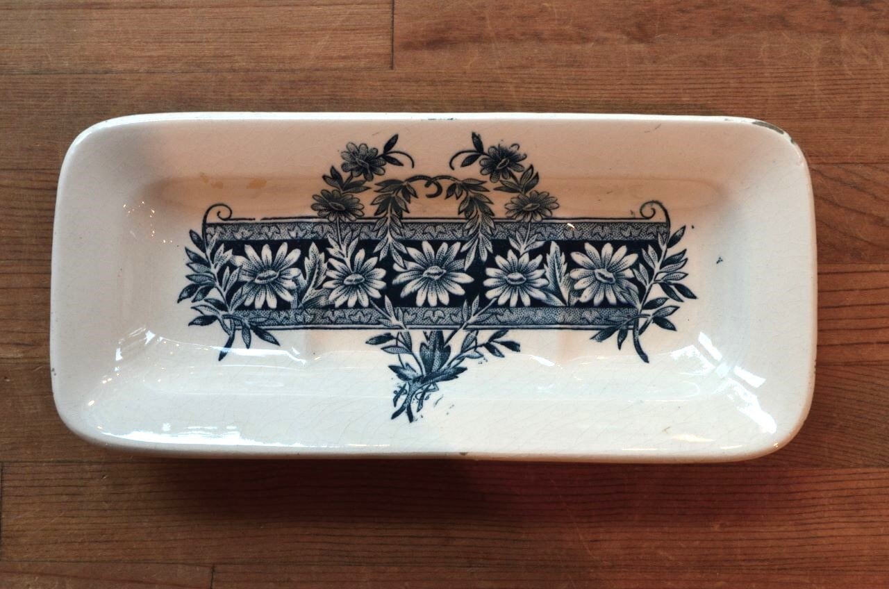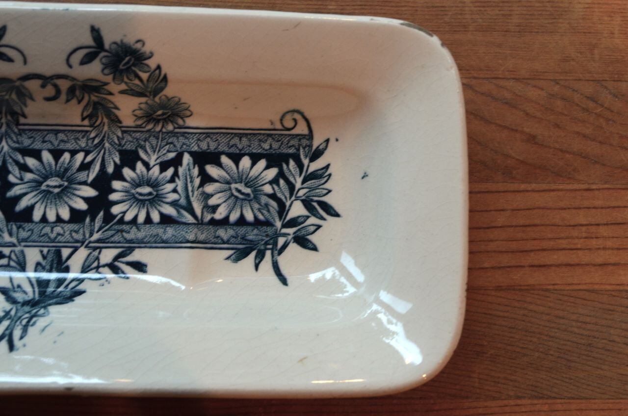 コンディション : 経年による、シミ、キズ、汚れ、貫入などあり、リムに数か所カケ(写真6,7,8)があり、写真6のカケは0.3×1.0cmと0.3×0.3cm程あります。又、裏側リムにもカケとブルーの色が飛んだ部分(写真9,10,11,12,13)が結構ありますが、全体的に良好でかわいらしい歯ブラシトレイと思います。アクセサリー入れにいかがでしょうか。