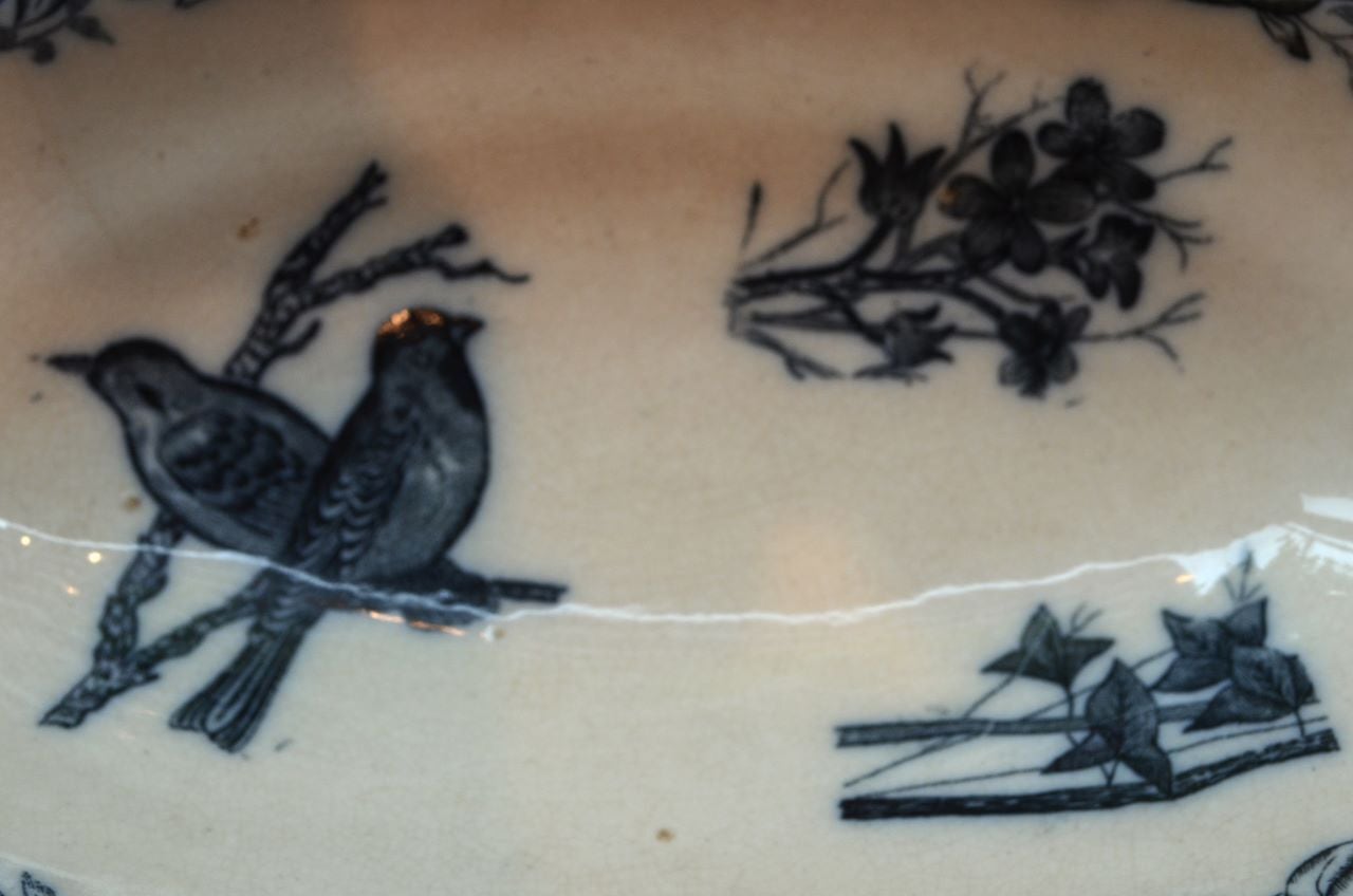 カラー : アイヴォリー地にブルーブラックの鳥と花柄、リムにもブルーブラックの葉