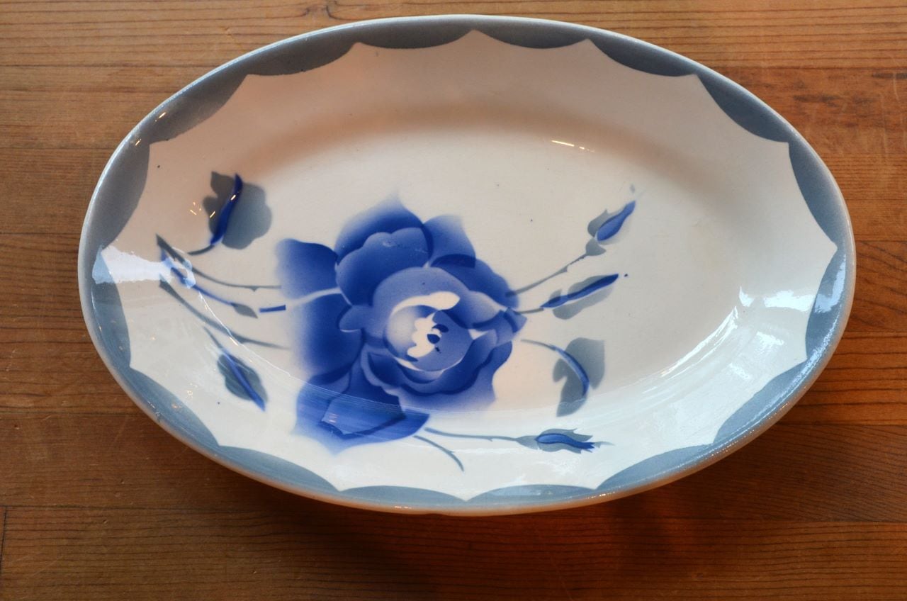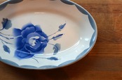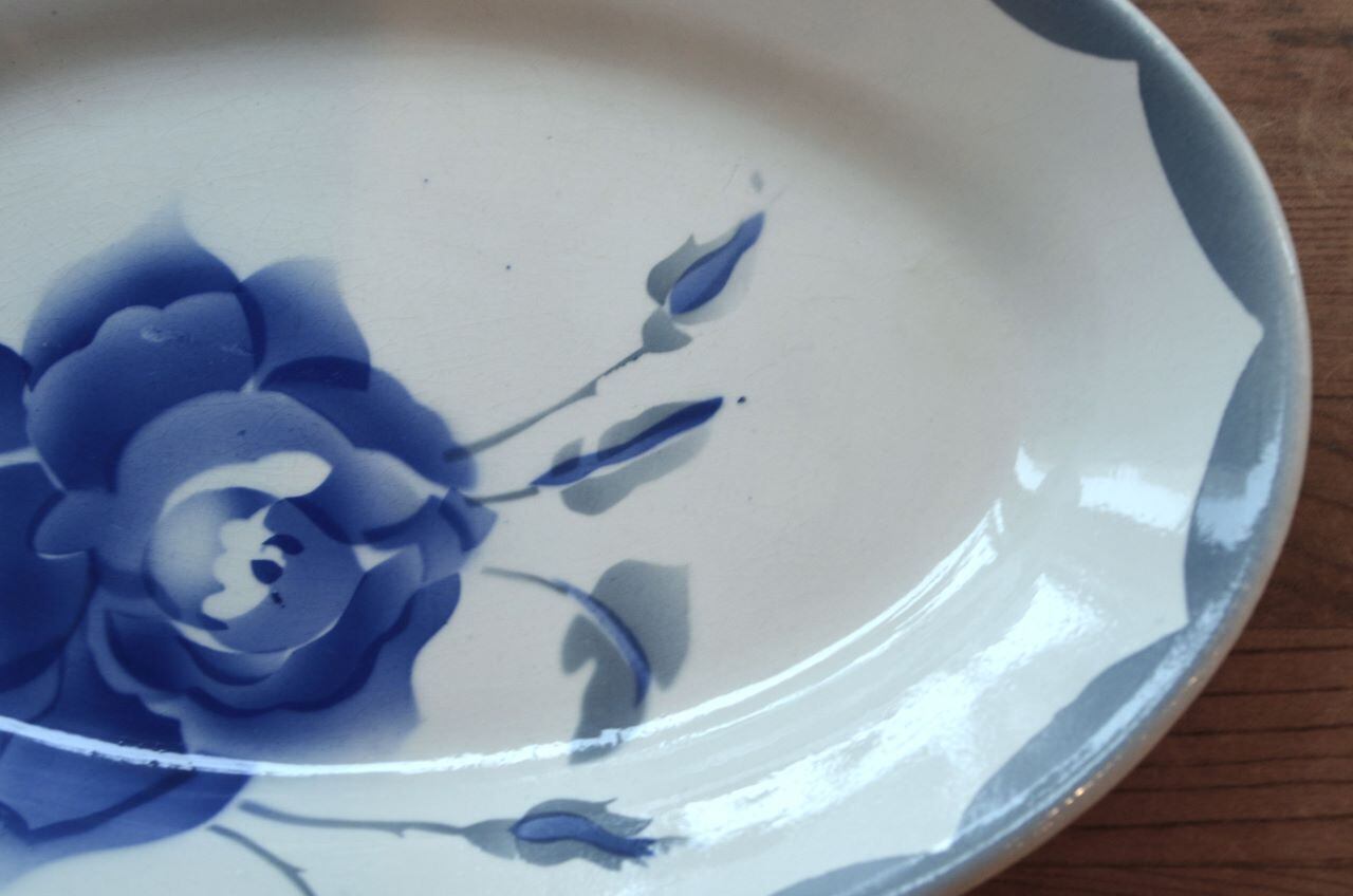 カラー : ホワイト地にブルーとブルーグレーのグラデーションがお洒落なローズ柄、リムはブルーグレー。