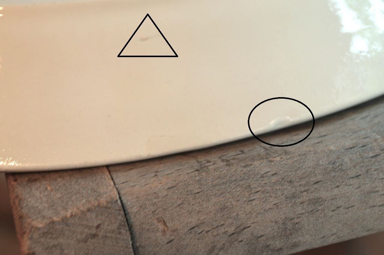 コンディション : 経年による、シミ、キズ、汚れ、貫入などあります。又、裏側にカケ(写真9)があり少し子擦れ感がありますが、表側には目立ったカケはありません。尚、裏側リムに製造時に欠けた個所に釉薬を塗ってる部分(写真8〇)やキズ(写真8△)があります。リムに若干の塗り残しなどありますが、全体的には大変綺麗で良好と思います。
