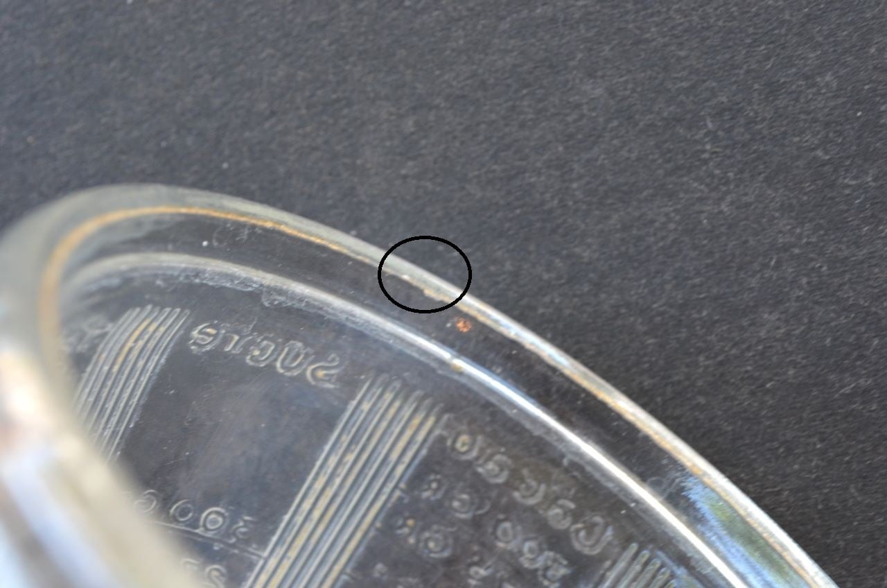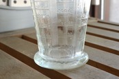 コンディション  :  経年による、シミ、キズ、汚れ、カルキ痕もあり、リム内側に極小さなカケが(写真18)あって、内側は若干の擦れ感があります。底部にも1か所(写真19)カケがありますが、こちらはあまり気にならないと思います。又、数か所極小さな気泡が入っていますが、その内1か所(写真12)は0.1×0.7cm程です。もう1か所は0.1×0.5cm程で、内側がカケ(写真13)ています。全体的には悪くはないと思います。尚、アルファベットが読みずらい部分があります。
