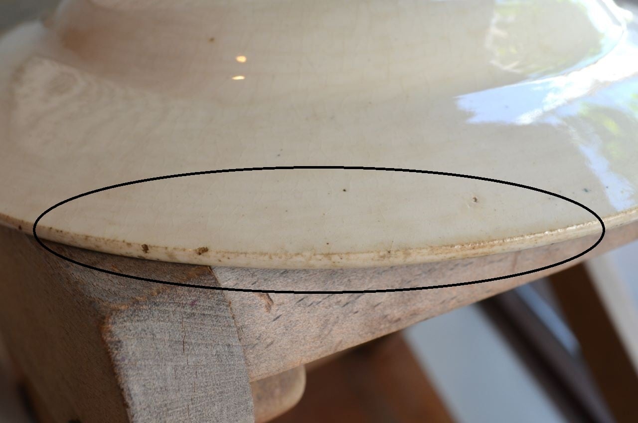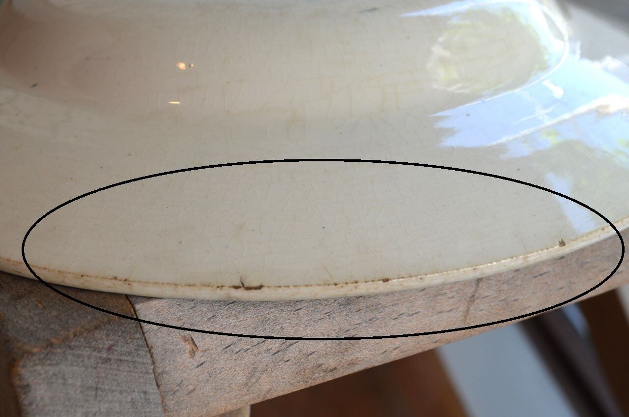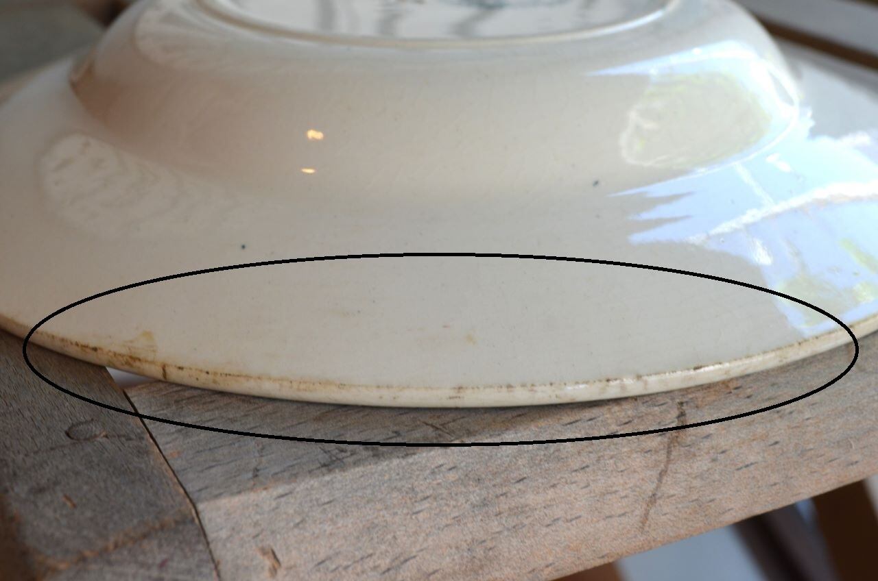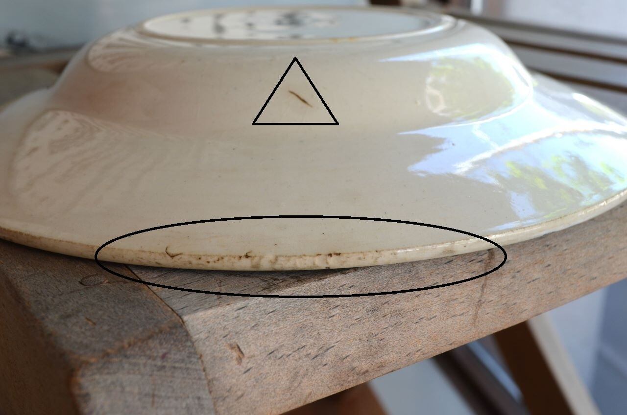 コンディション : 経年による、シミ、キズ、汚れ、貫入などあり、特にシミは全体に広がっていて、逆にそれ程目立たないと思います。又、リム(写真4~9〇)にカケが数か所あり、ヒビもあり、全体的に擦れ感があり黒ずんでいます。尚、写真5△はキズです。人気のこちらのプレートは悪くはないと思いますが、カケなど気になる方はご遠慮ください。