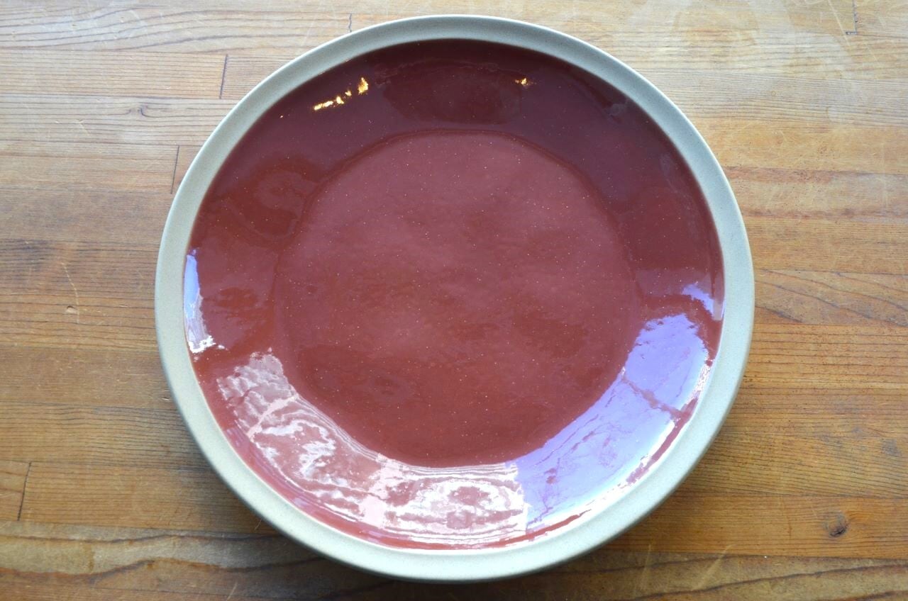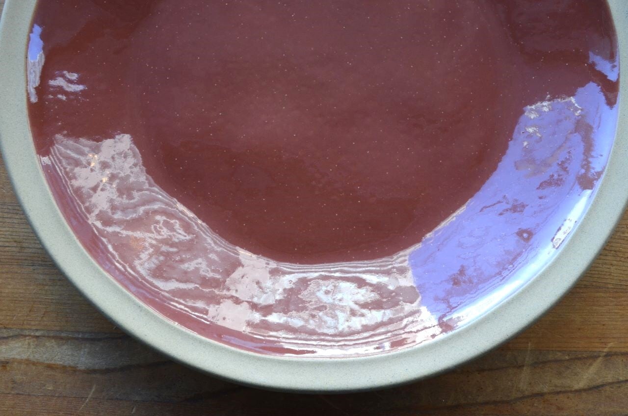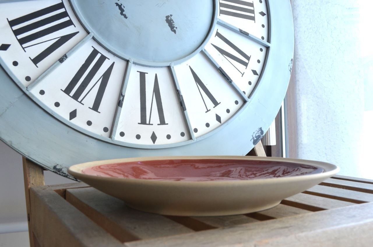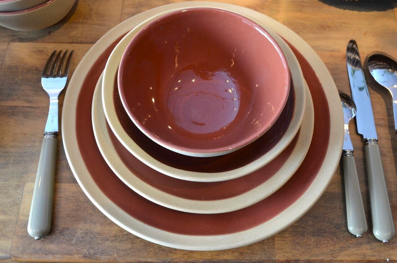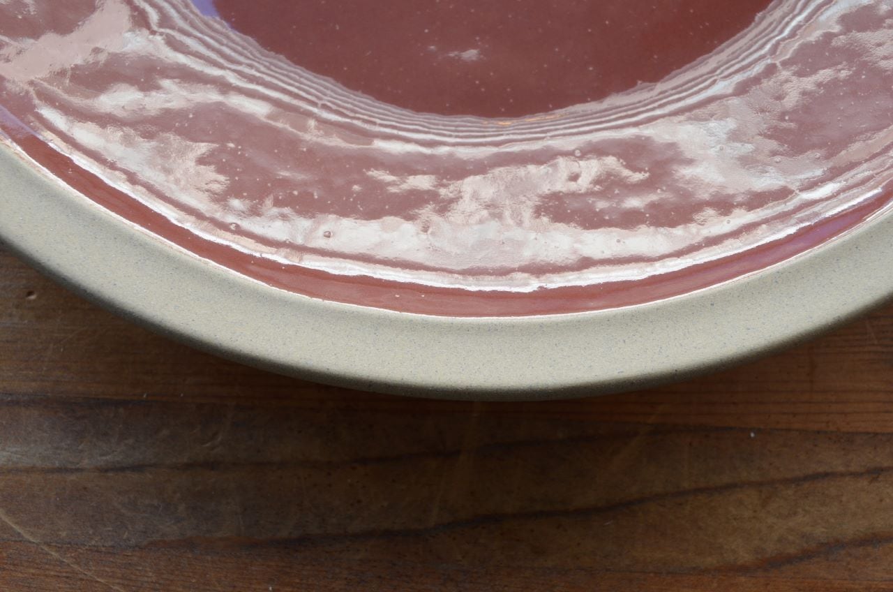 特徴 : 内側はトマト色でその上に釉薬を塗っていますが、リム(写真8)と外側(写真5)は釉薬を塗っていない素地のままでザラついた感じです。全体的にはとても柔らかでお洒落なプレートです。ワンプレートディッシュにしたり、和食にも合いそうです。