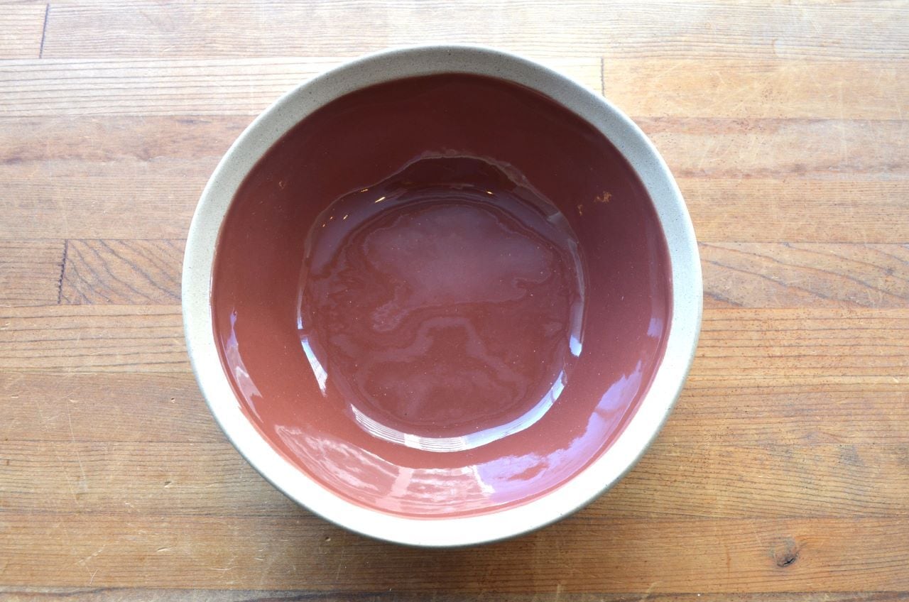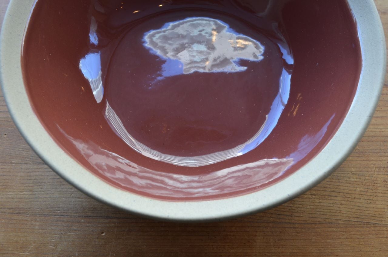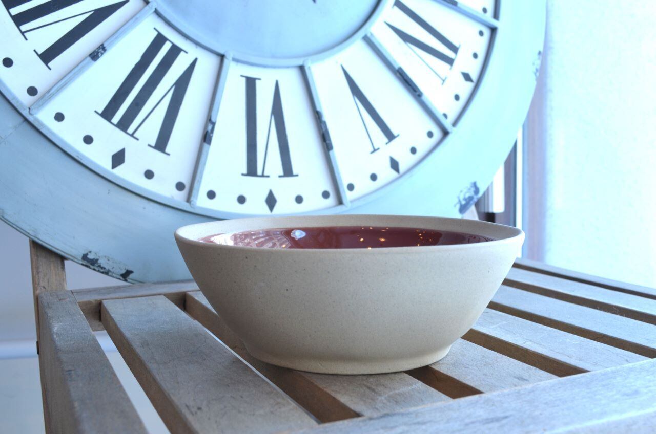 特徴 : 内側はトマト色でその上に釉薬を塗っていますが、リム(写真2)と外側(写真8)は釉薬を塗っていない素地のままでザラついた感じです。全体的にはとても柔らかでお洒落な、和食にも合いそうなスーププレートです。