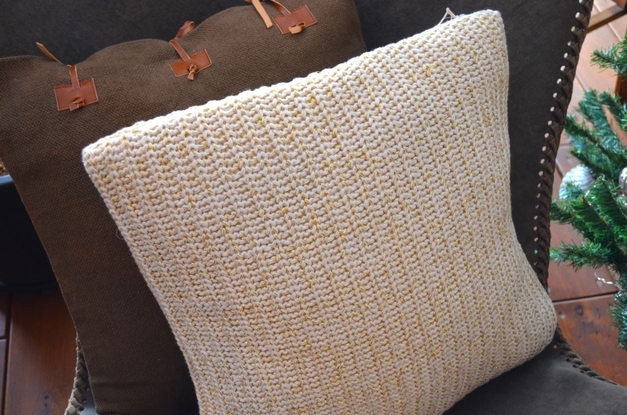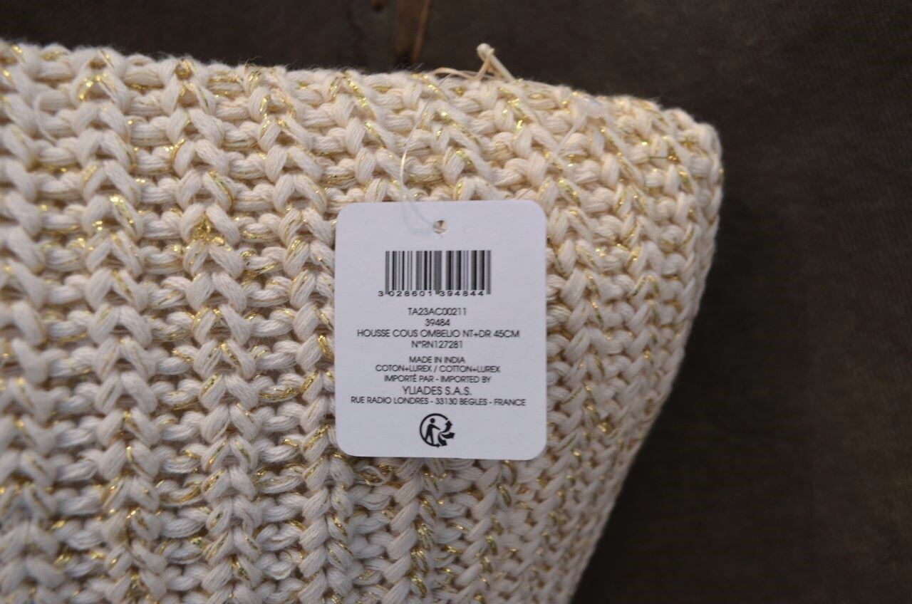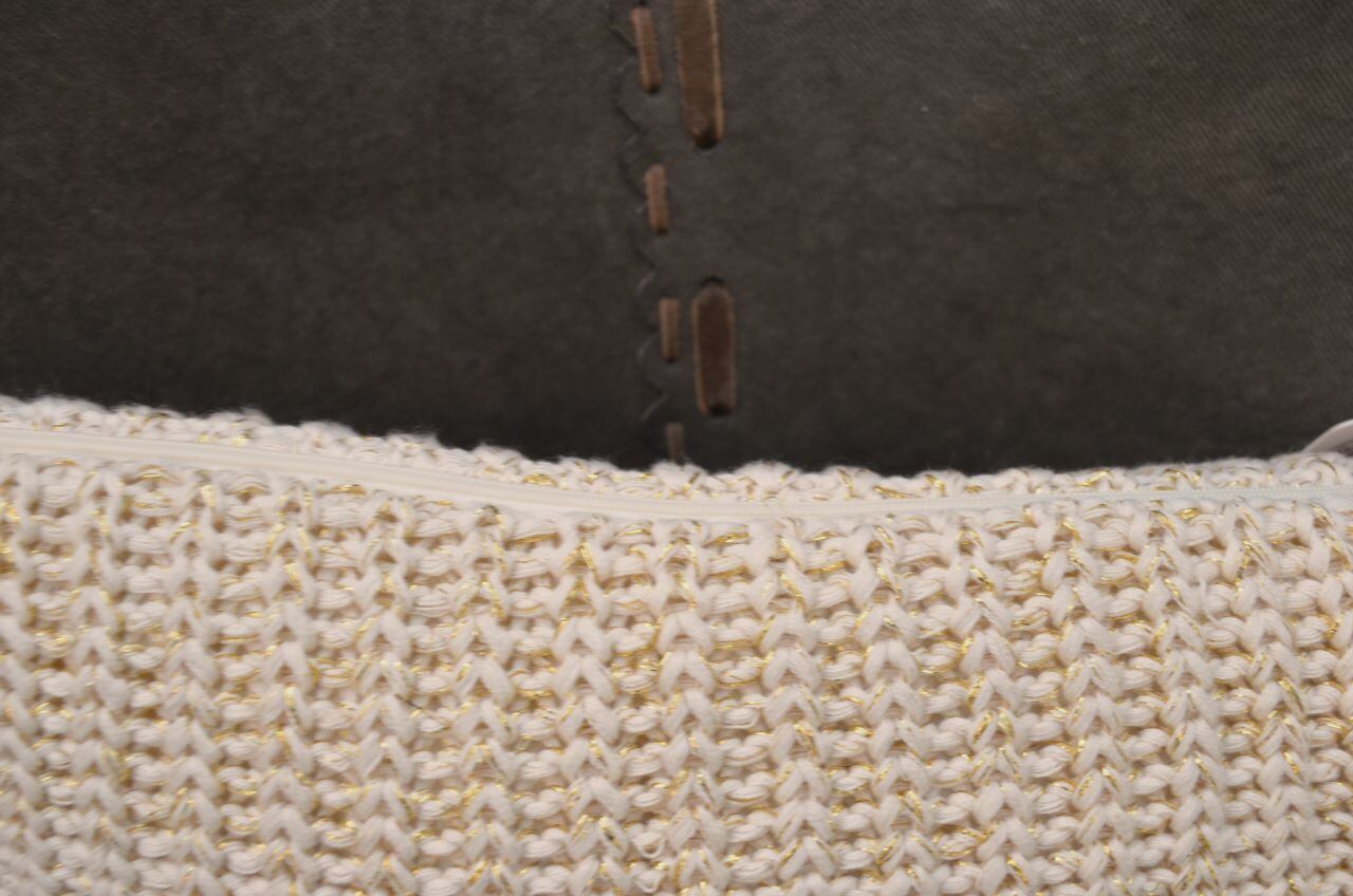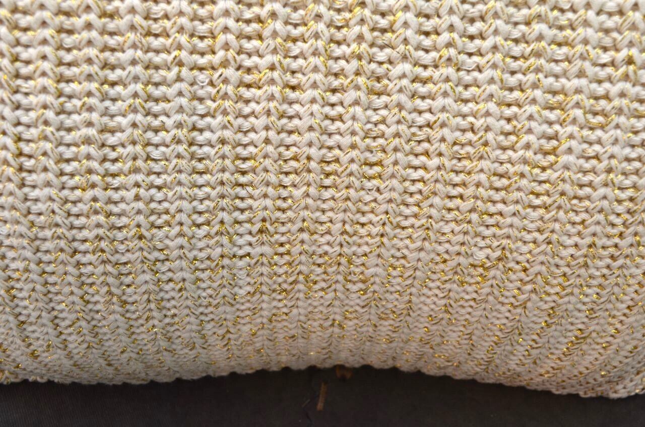 特徴 : クリーム色に柔らかく光るゴールドを入れた糸で編んでいて、クリスマスシーズンにぴったりのクッションです。肌触りも柔らかです。