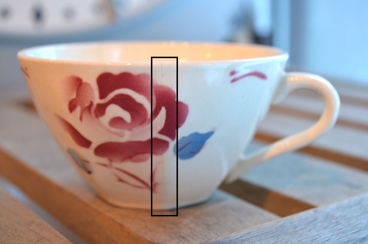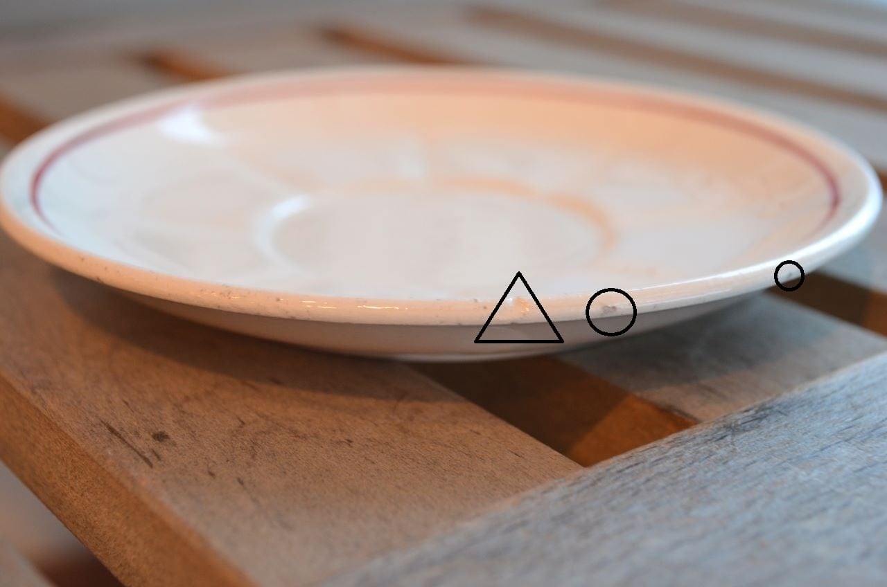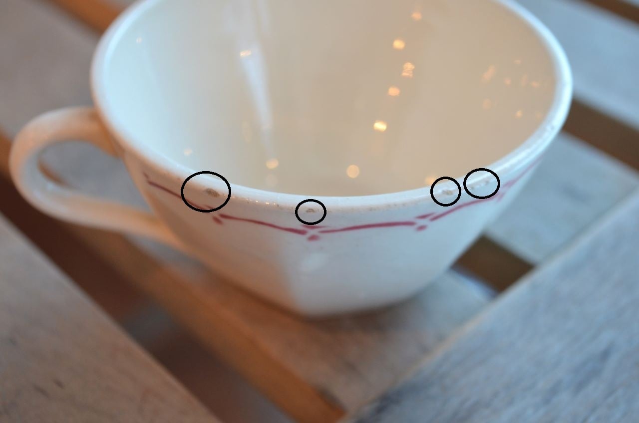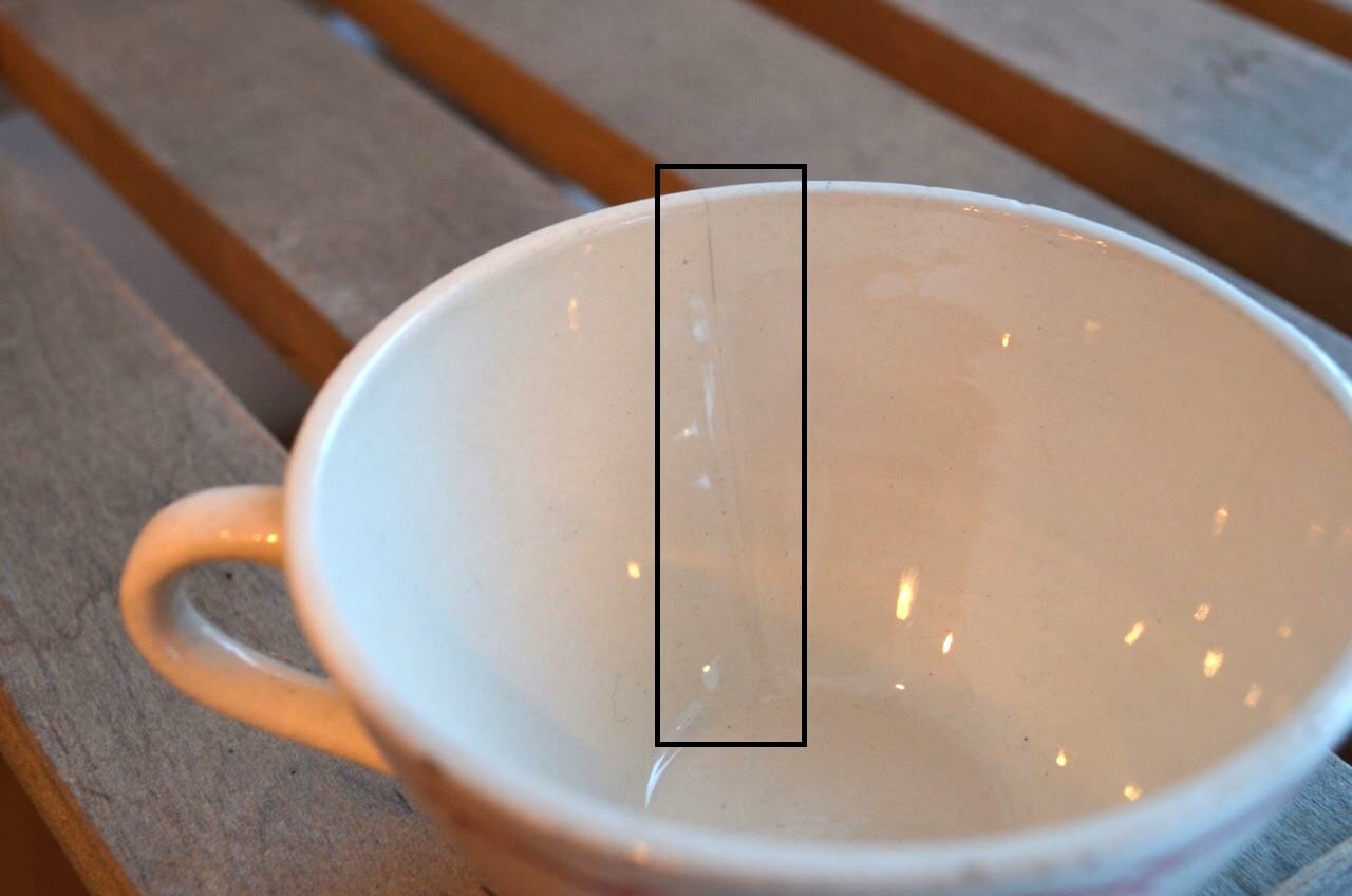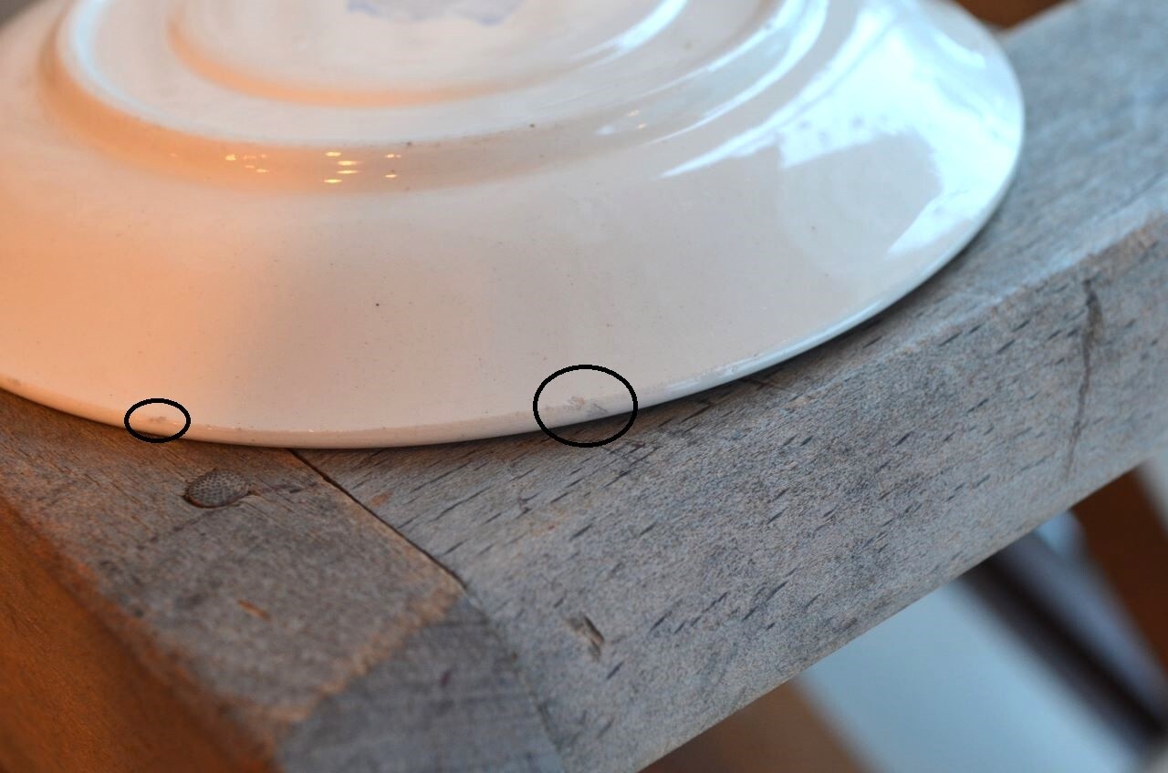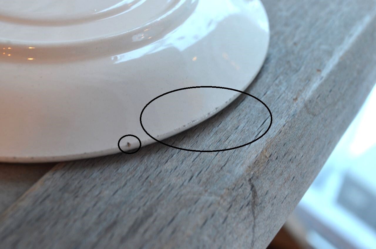 コンディション : 経年による、シミ、キズ、汚れ、貫入などあり、カップのリムに小さなカケが数か所(写真7,8〇)あります。又、リムから下部迄、長いヒビ(写真4,5▭)があり、内側にも通しています。ソーサーはリムに数か所極小さなカケ(13~16〇)があり、1か所製造時に少し大きめのカケ(0.3×0.4cm)に釉薬を塗った部分(写真13△)があります。全体的には、ヒビは現時点では大丈夫でしたが、液体を入れると染み出す恐れがありますので、気になる方はご遠慮ください。