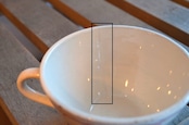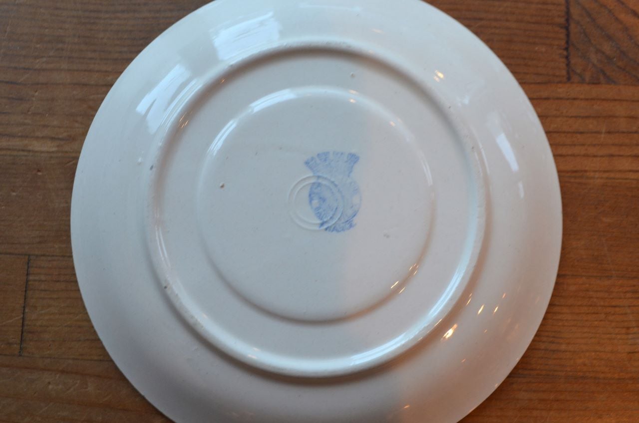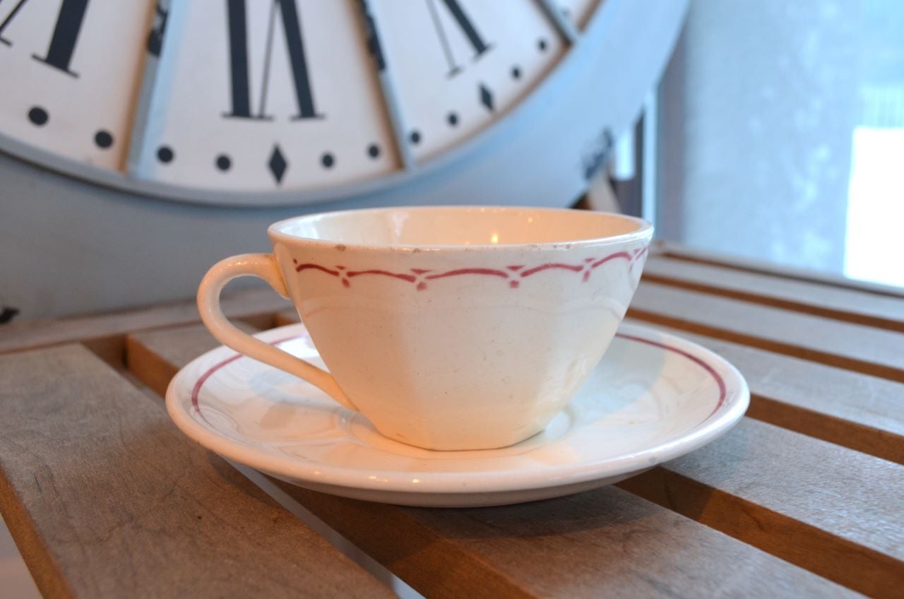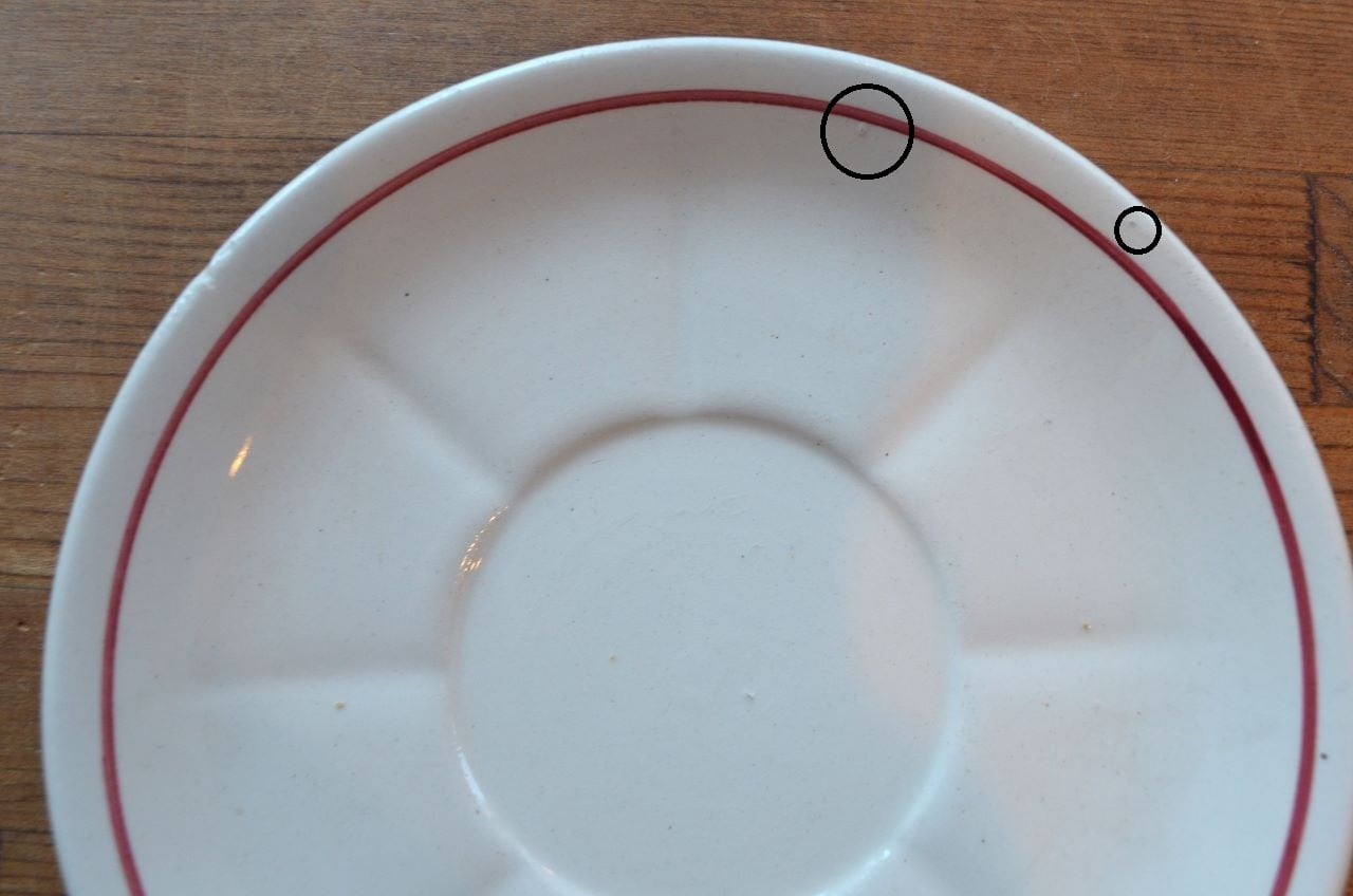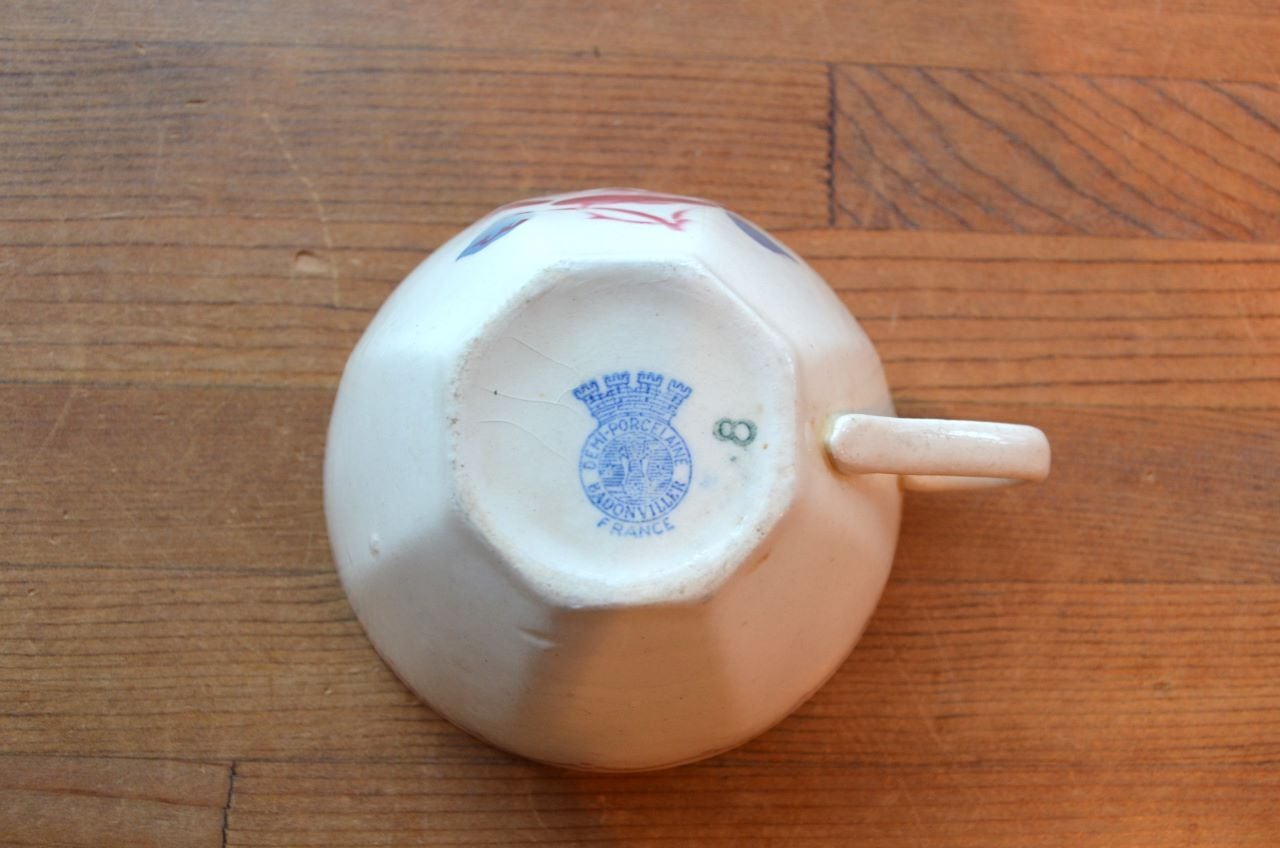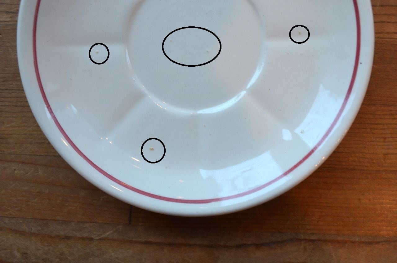 コンディション : 経年による、シミ、キズ、汚れ、貫入などあり、カップのリムに小さなカケが数か所(写真7,8〇)あります。又、リムから下部迄、長いヒビ(写真4,5▭)があり、内側にも通しています。ソーサーはリムに数か所極小さなカケ(13~16〇)があり、1か所製造時に少し大きめのカケ(0.3×0.4cm)に釉薬を塗った部分(写真13△)があります。全体的には、ヒビは現時点では大丈夫でしたが、液体を入れると染み出す恐れがありますので、気になる方はご遠慮ください。