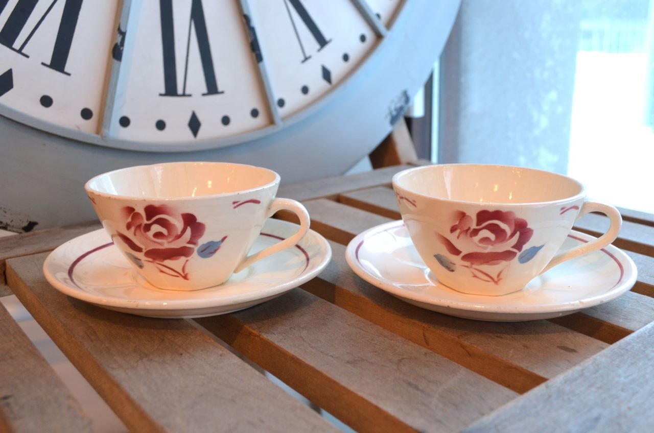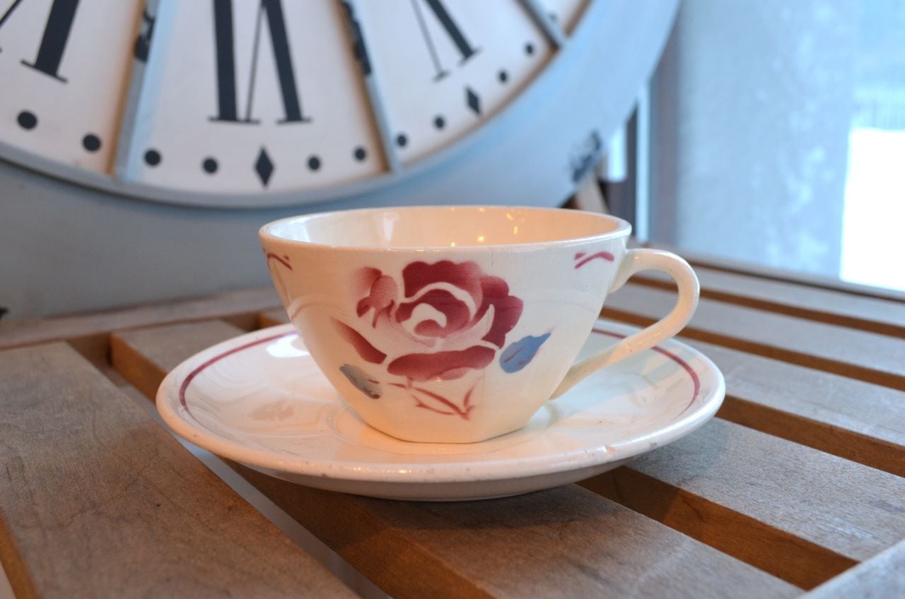 カラー : カップは、アイヴォリー地にピンクのローズ柄、葉はブルーグレー。ソーサーはアイヴォリー地にリムの内側にピンクのライン