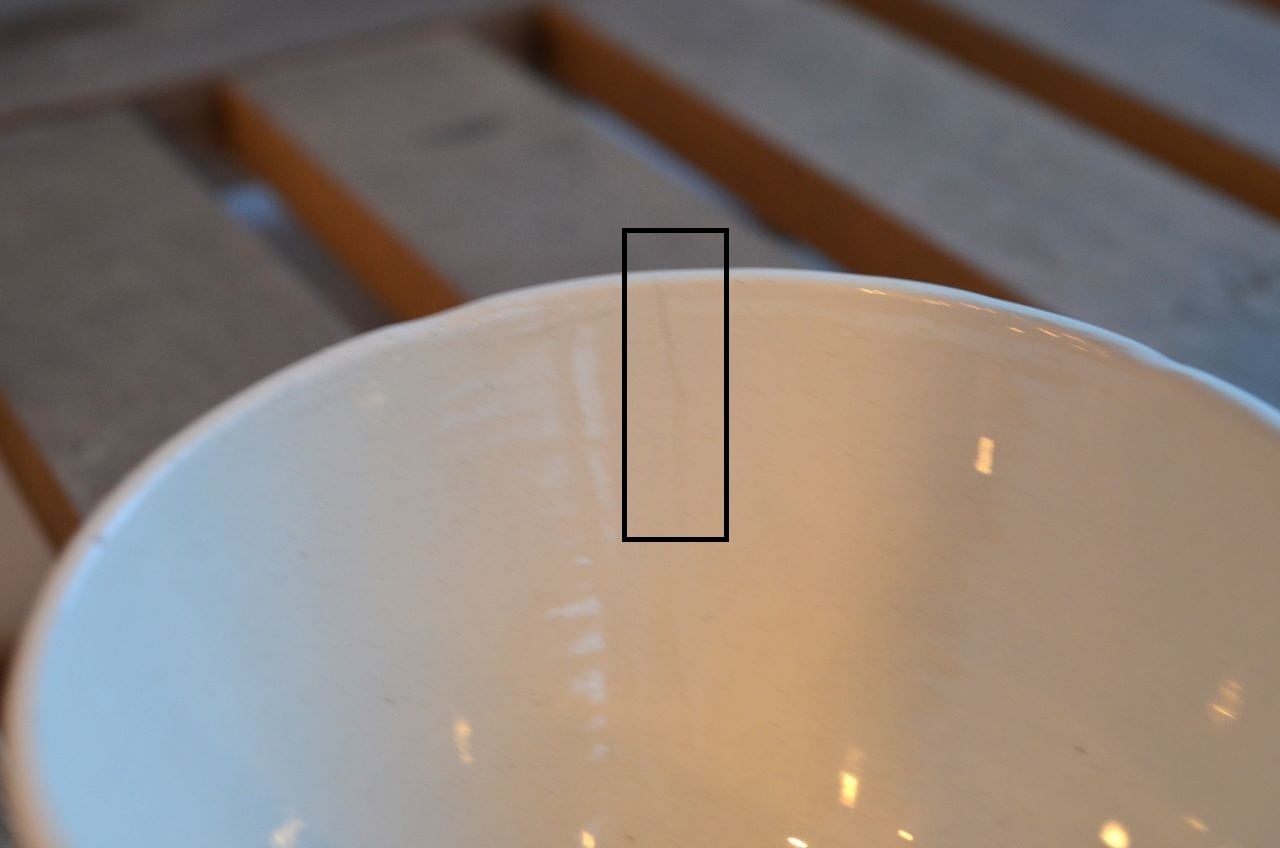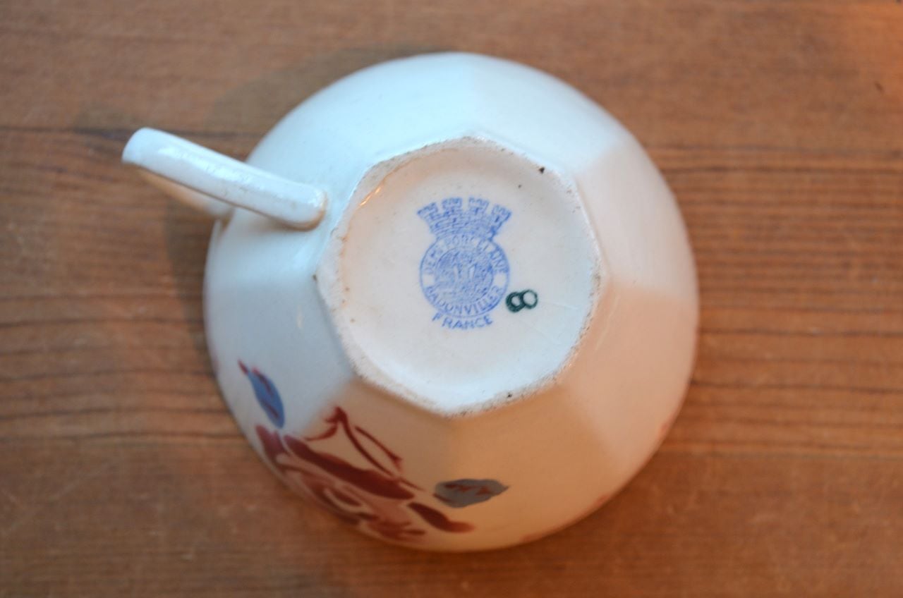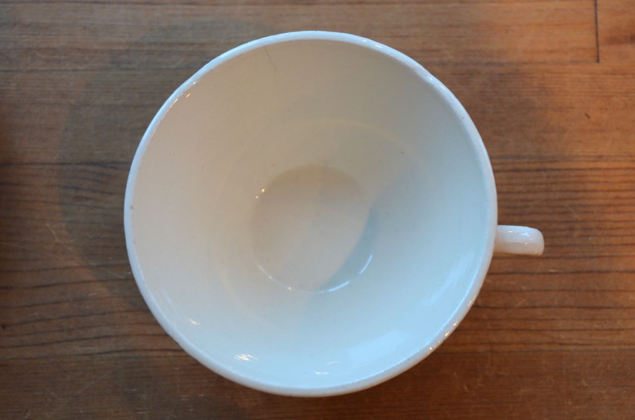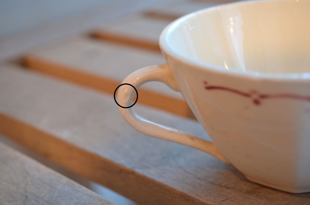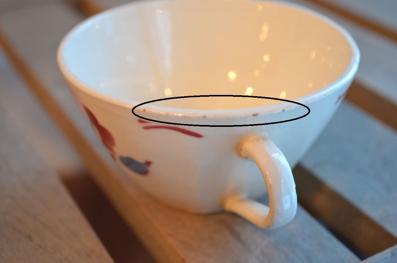 コンディション : 経年による、シミ、キズ、汚れ、貫入などあり、リムに極小さなカケ(写真5~7〇)が数か所あります。又、リムから底部にかけて3.0cm程のヒビ(写真9,10▭)が内側まで通しいて、現段階では大丈夫でしたが、液体を入れると染み出す恐れがあります。ソーサーは窯キズ以外には目立ったカケはありませんが、1か所製造時に付いたカケに釉薬を塗った部分(写真16〇)があり、持ち手(写真8〇)にも同様に製造時のものが見られます。それ程気にならないと思います。全体的には悪くはないと思いますが、ヒビが気になる方はご遠慮ください。
