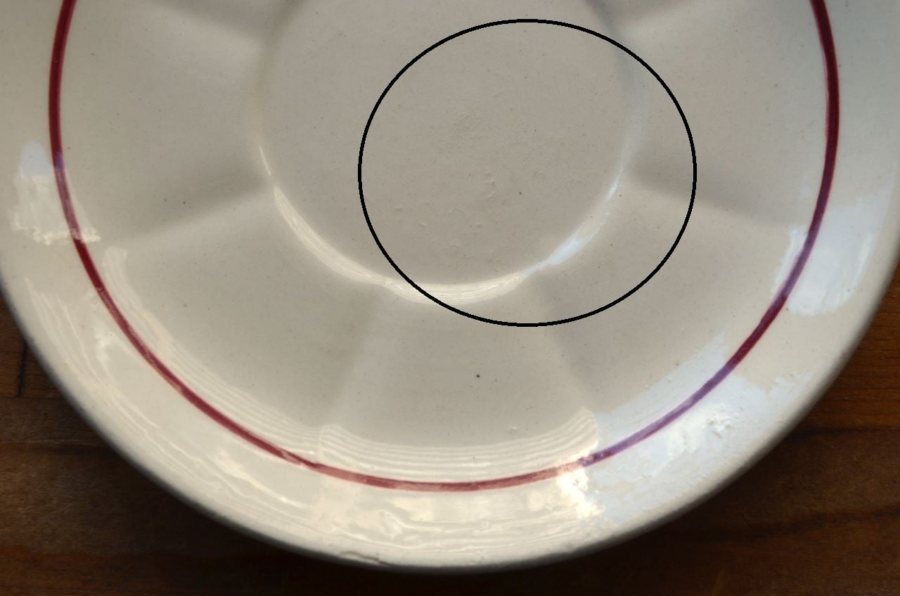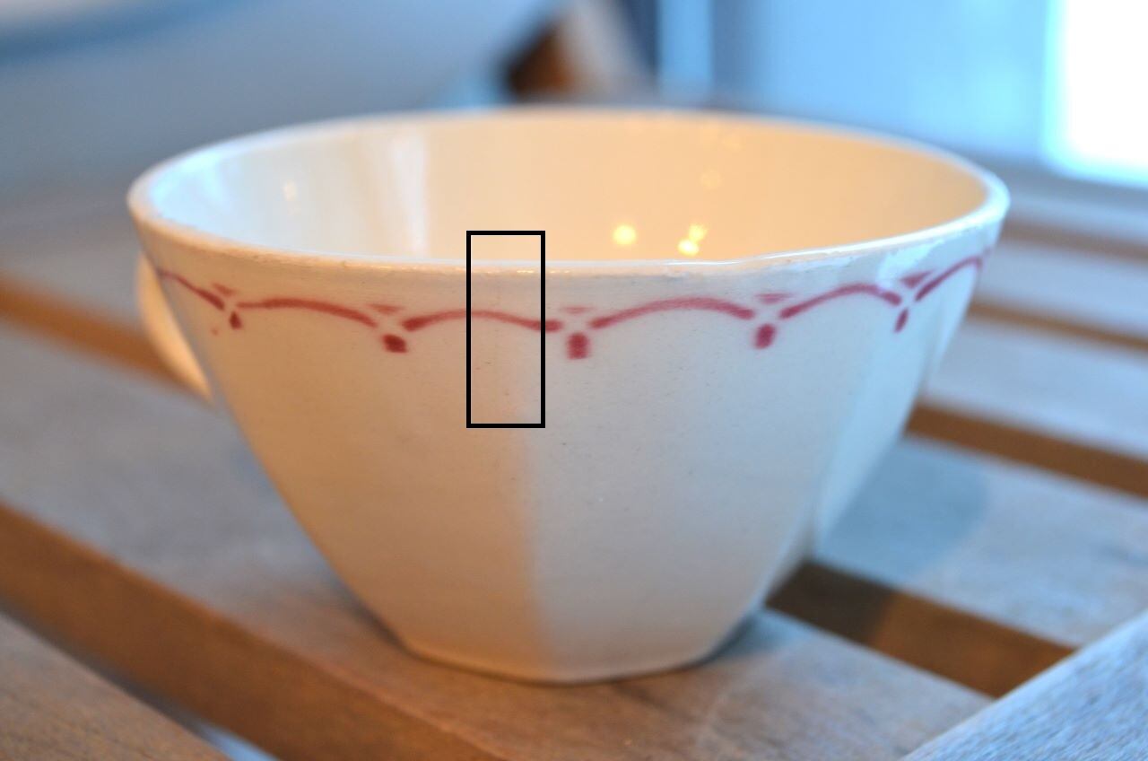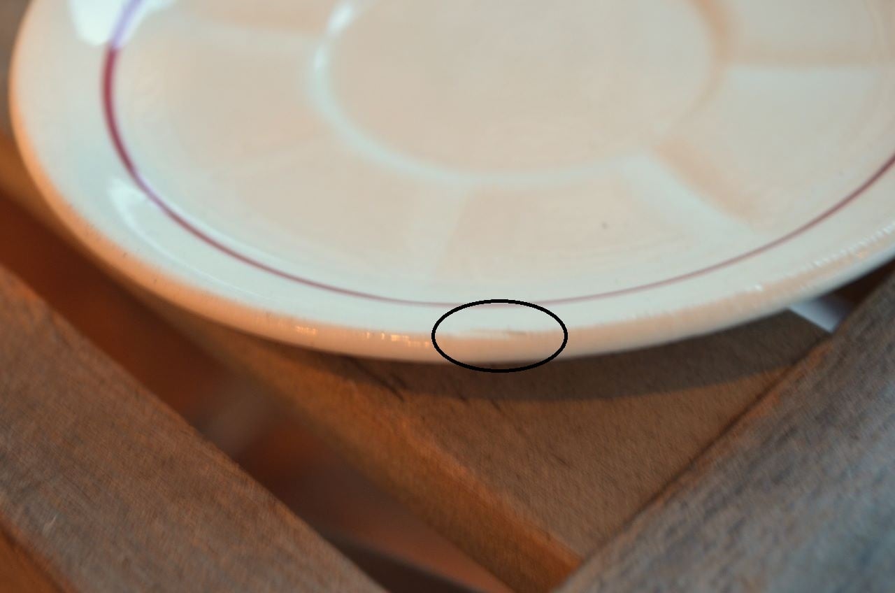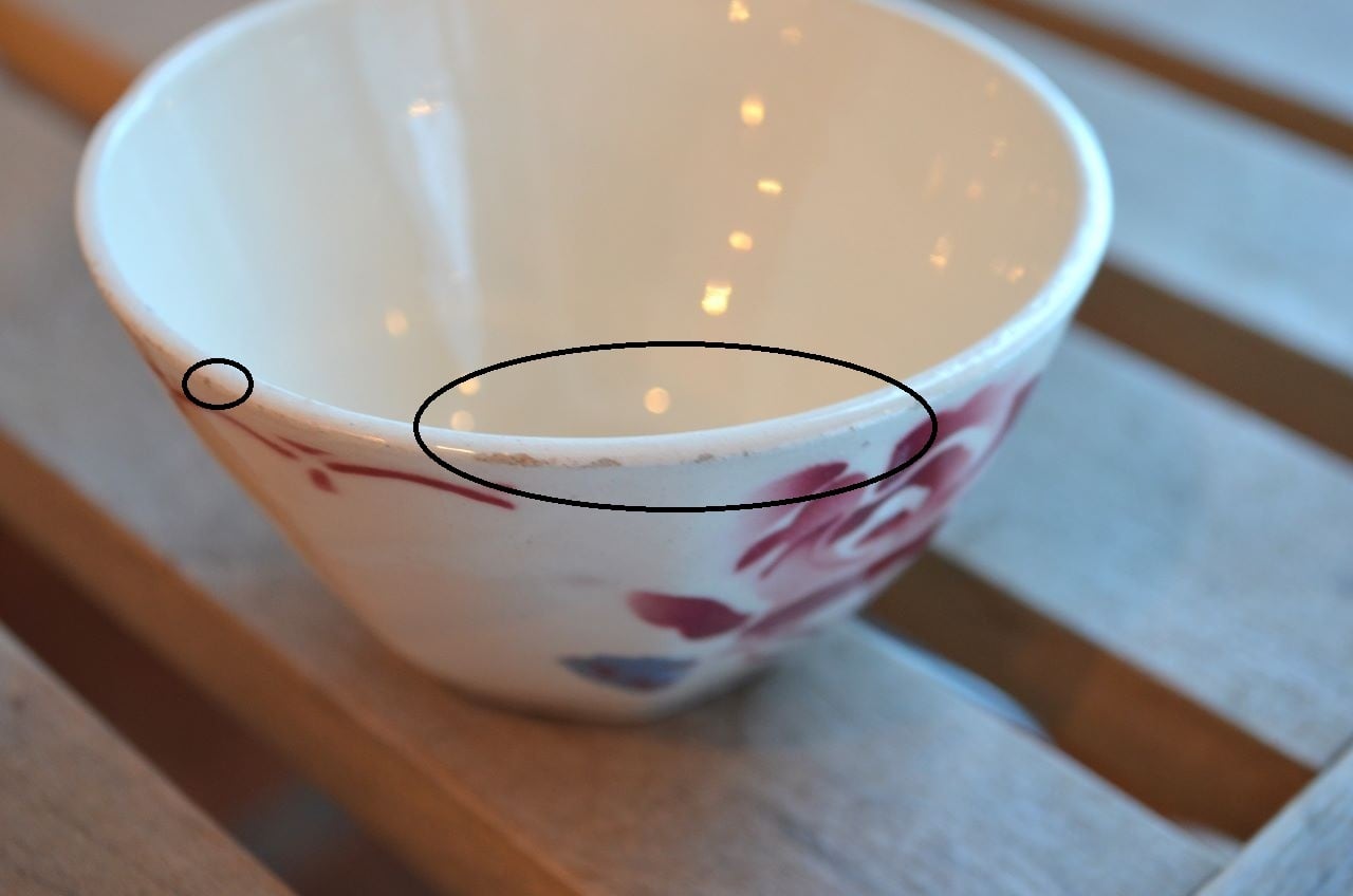 コンディション : 経年による、シミ、キズ、汚れ、貫入などあり、リムに極小さなカケ(写真5~7〇)が数か所あります。又、リムから底部にかけて3.0cm程のヒビ(写真9,10▭)が内側まで通しいて、現段階では大丈夫でしたが、液体を入れると染み出す恐れがあります。ソーサーは窯キズ以外には目立ったカケはありませんが、1か所製造時に付いたカケに釉薬を塗った部分(写真16〇)があり、持ち手(写真8〇)にも同様に製造時のものが見られます。それ程気にならないと思います。全体的には悪くはないと思いますが、ヒビが気になる方はご遠慮ください。