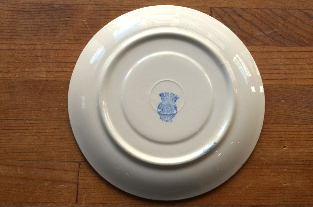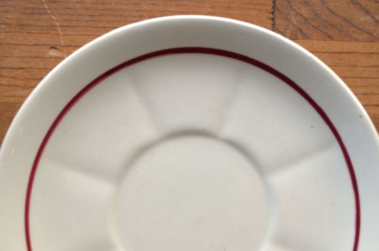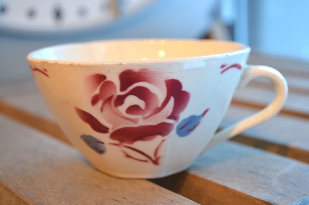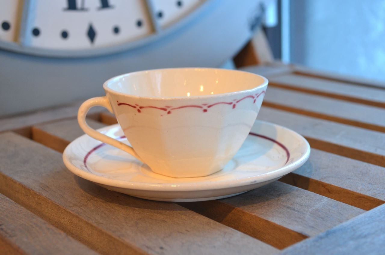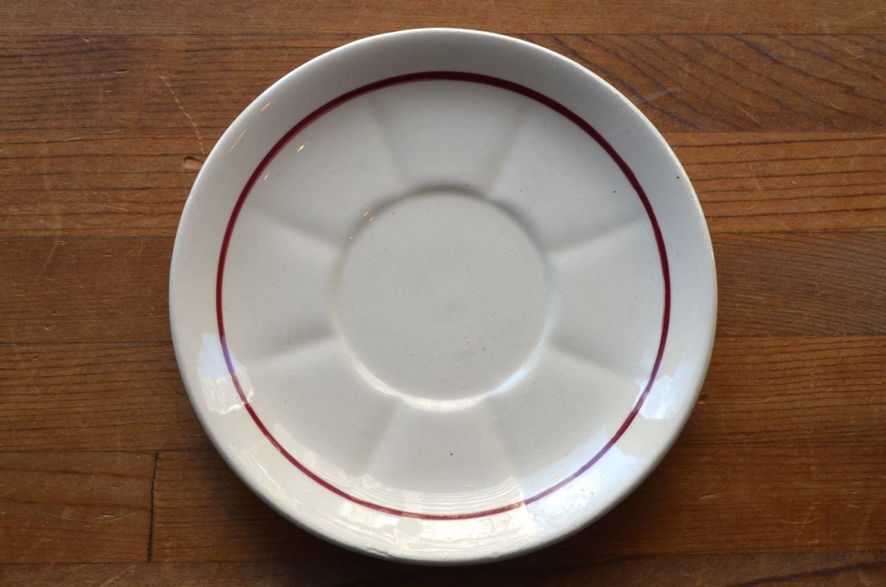 コンディション : 経年による、シミ、キズ、汚れ、貫入などあり、リムに極小さなカケ(写真5~7〇)が数か所あります。又、リムから底部にかけて3.0cm程のヒビ(写真9,10▭)が内側まで通しいて、現段階では大丈夫でしたが、液体を入れると染み出す恐れがあります。ソーサーは窯キズ以外には目立ったカケはありませんが、1か所製造時に付いたカケに釉薬を塗った部分(写真16〇)があり、持ち手(写真8〇)にも同様に製造時のものが見られます。それ程気にならないと思います。全体的には悪くはないと思いますが、ヒビが気になる方はご遠慮ください。