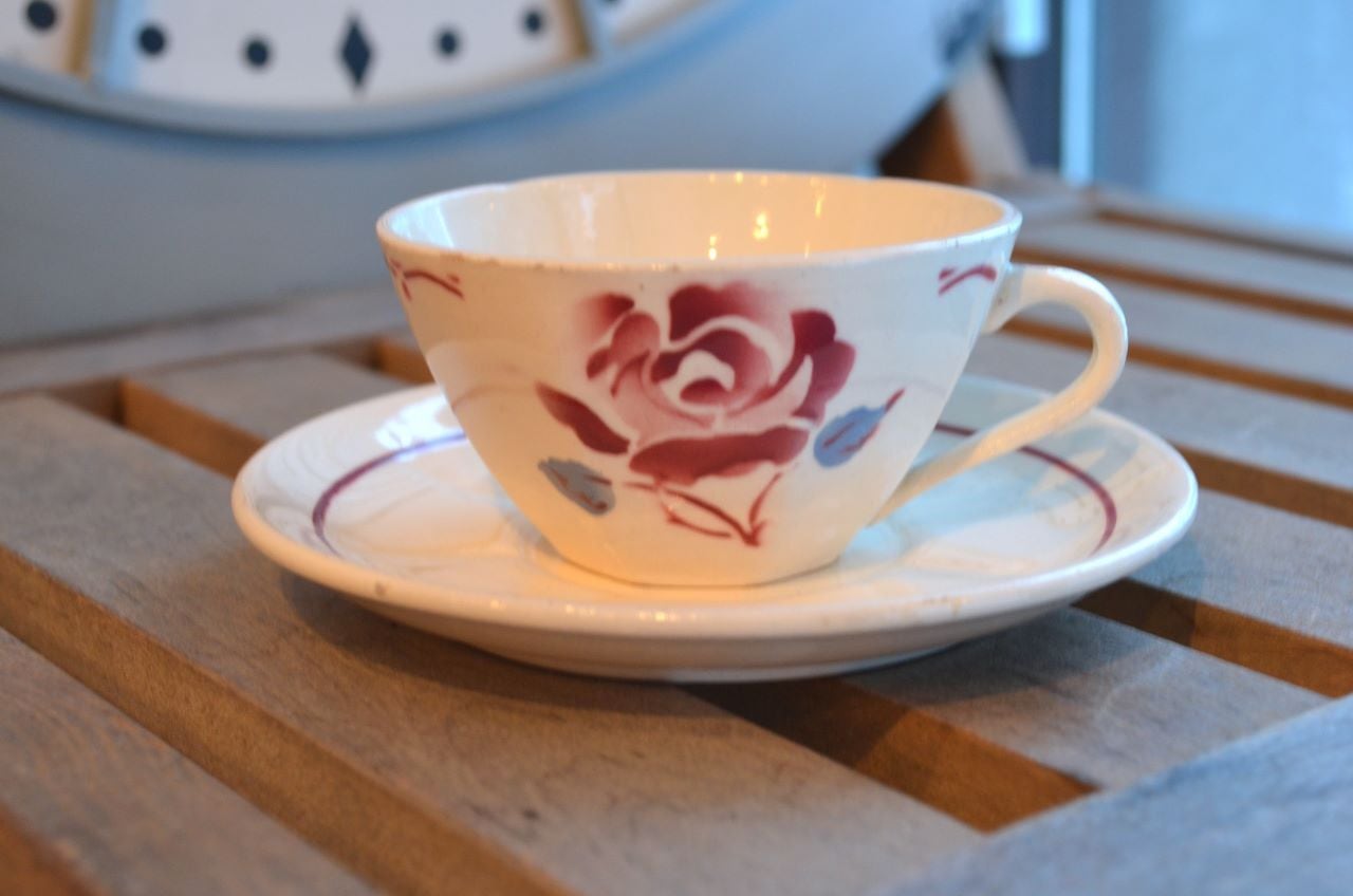 カラー : カップは、アイヴォリー地にピンクのローズ柄、葉はブルーグレー。ソーサーは、アイヴォリー地にリム内側にピンクのライン。