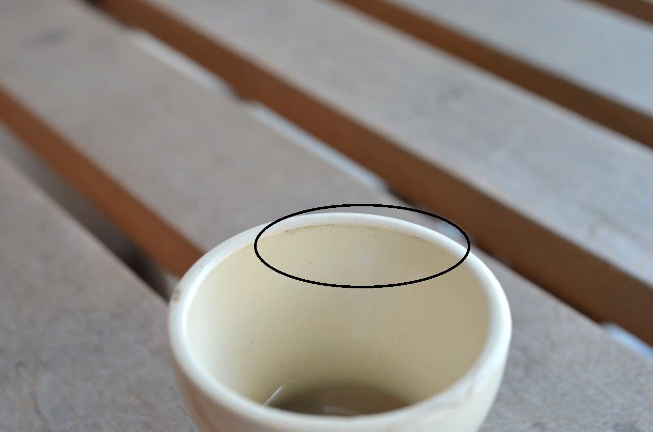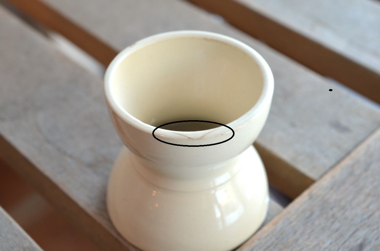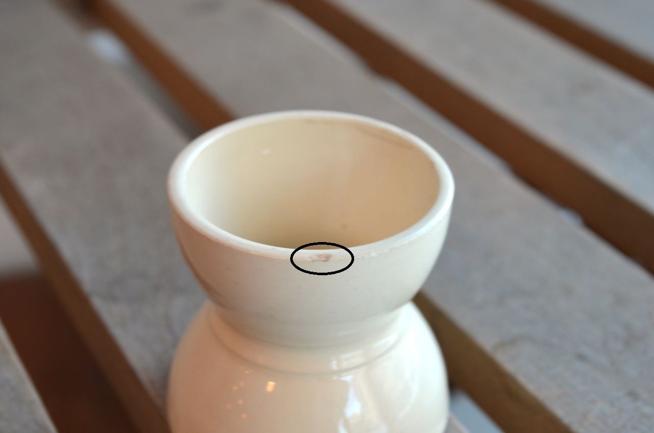 コンディション : 経年による、シミ、キズ、汚れ、貫入などあり、上部リムに1か所カケ(写真5〇)があり、同じく上部リムにヒビ(写真6,7〇)があります。又、内側に若干の擦れ感があります。下部(写真9)は若干の擦れ感があり、写真はありませんが、製造時に付いたキズに釉薬を塗った部分がありますが、あまり目立たないと思います。全体的には良好と思います。