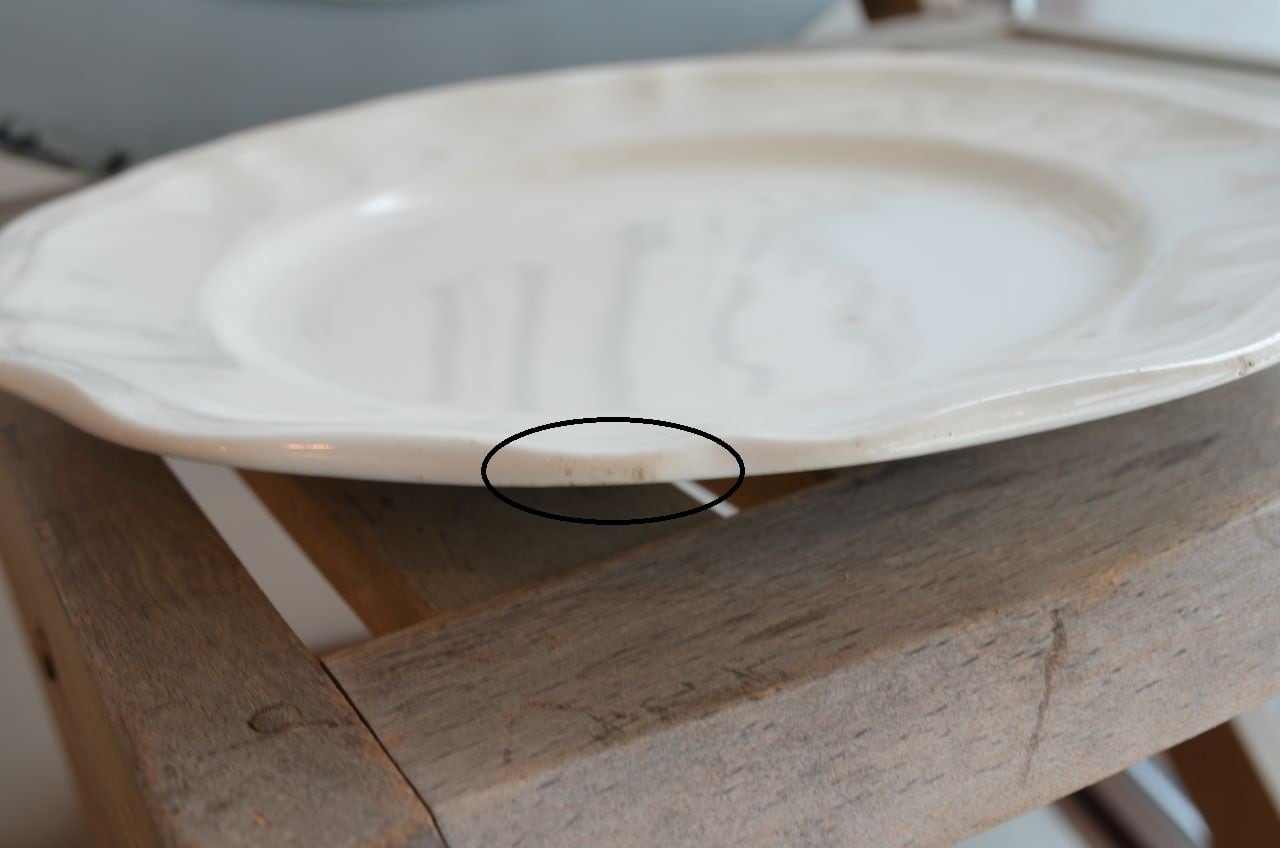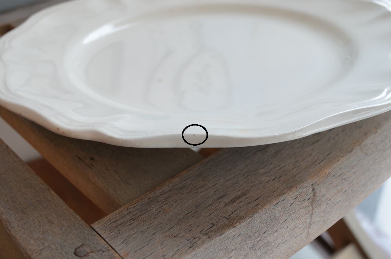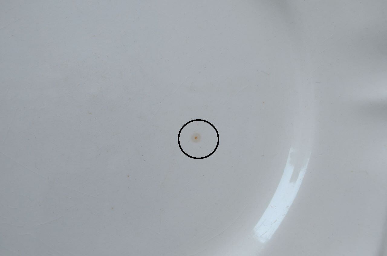 コンディション : 経年による、シミ、キズ、汚れ、貫入などあり、特にシミ(写真4〇)が表面にあり、小さいですが比較的目立っています。又、リムにもシミ(写真5,6〇)が見られます。窯キズの横に極小さなカケ(写真7〇)が複数見られ、他にもリムに極小さなカケ(写真8,9〇)があります。全体的にはわるくはないと思います。