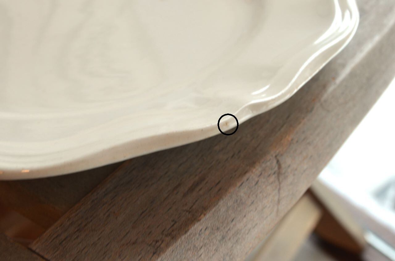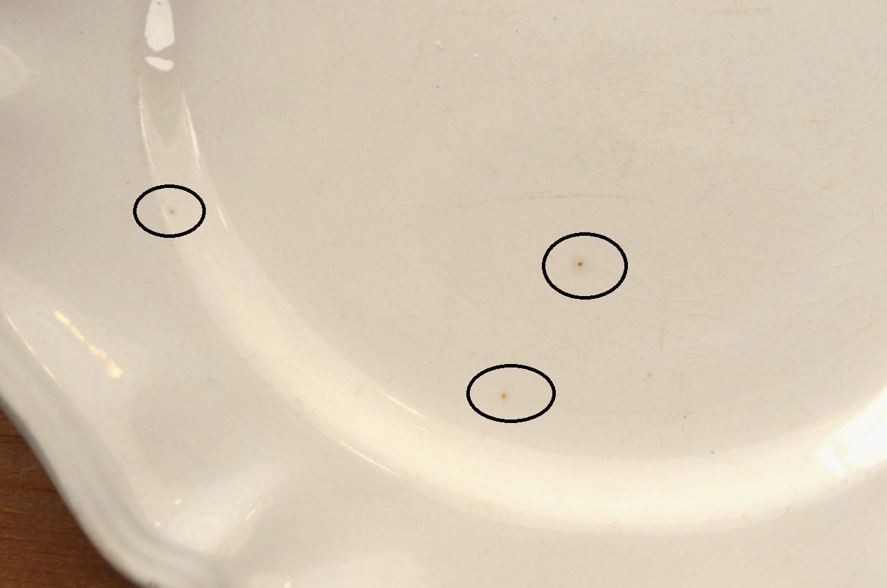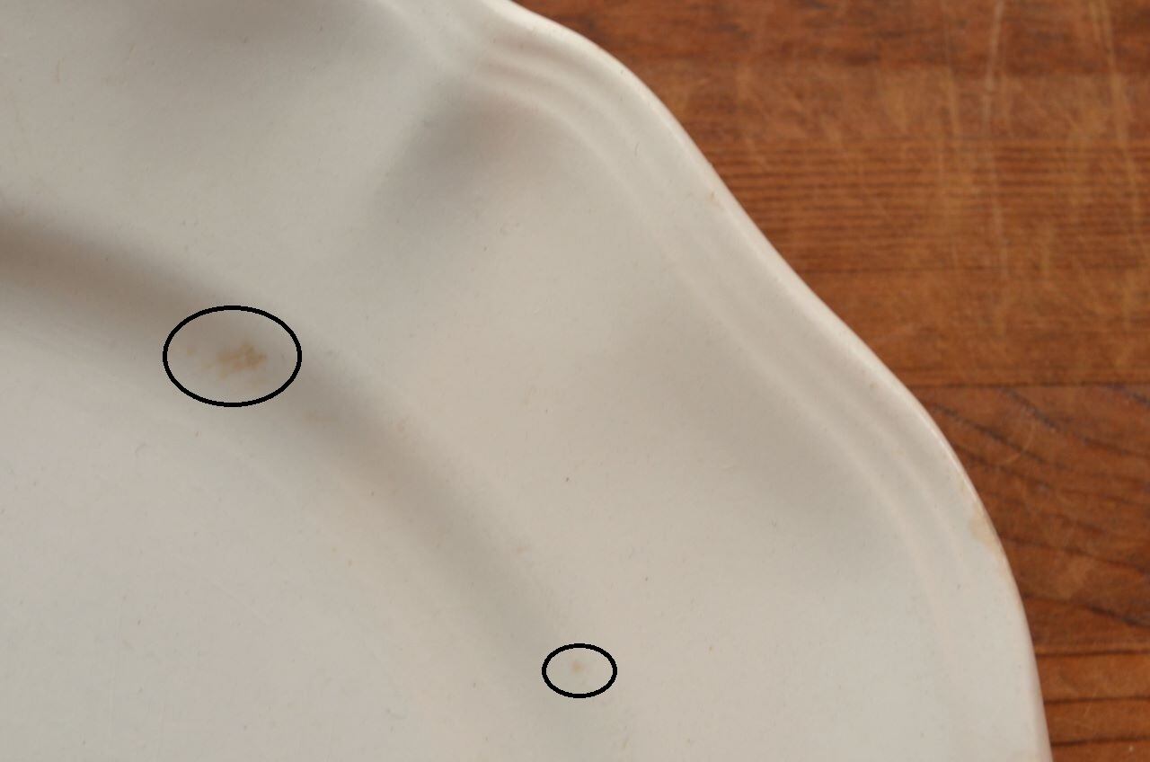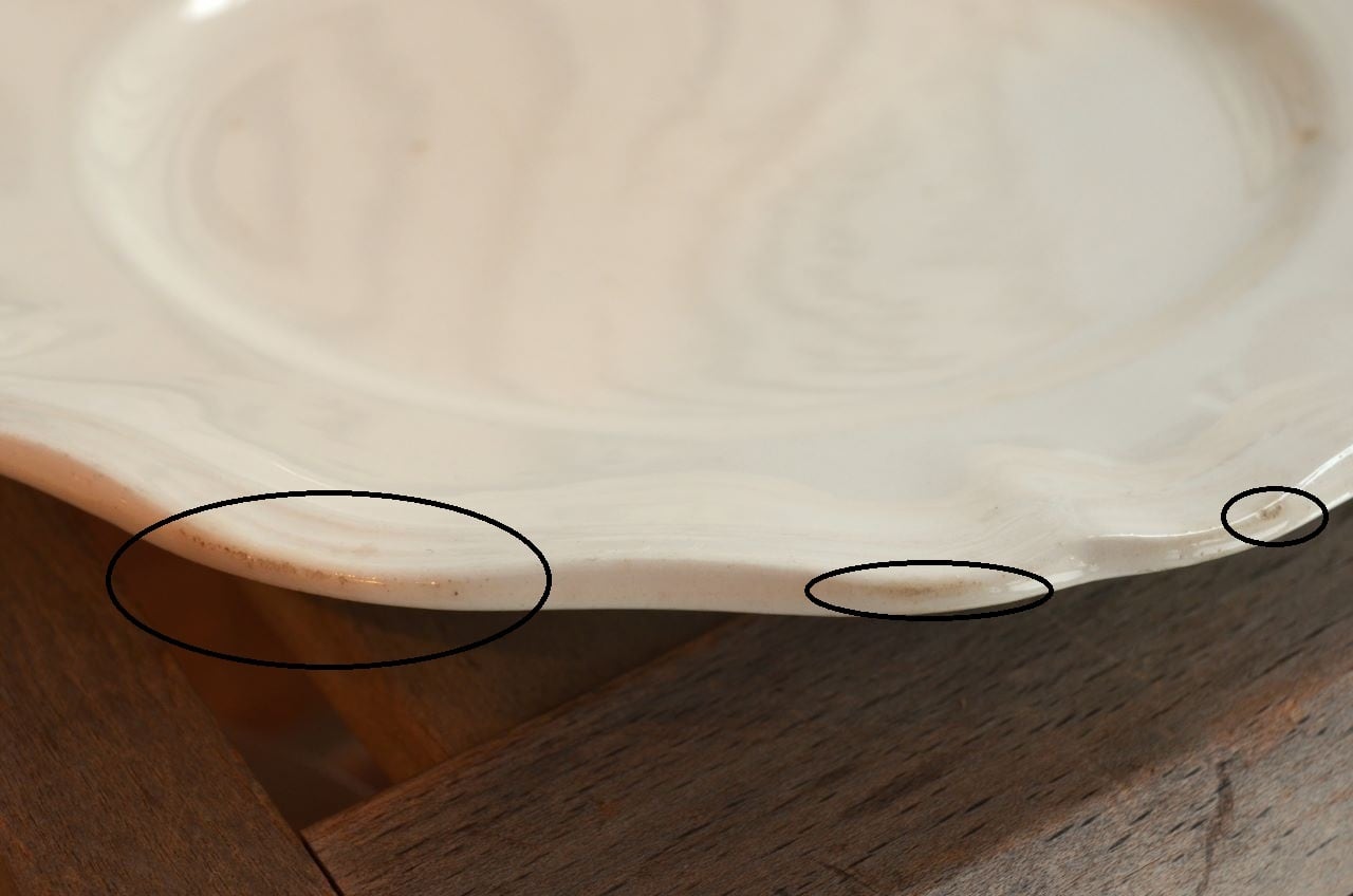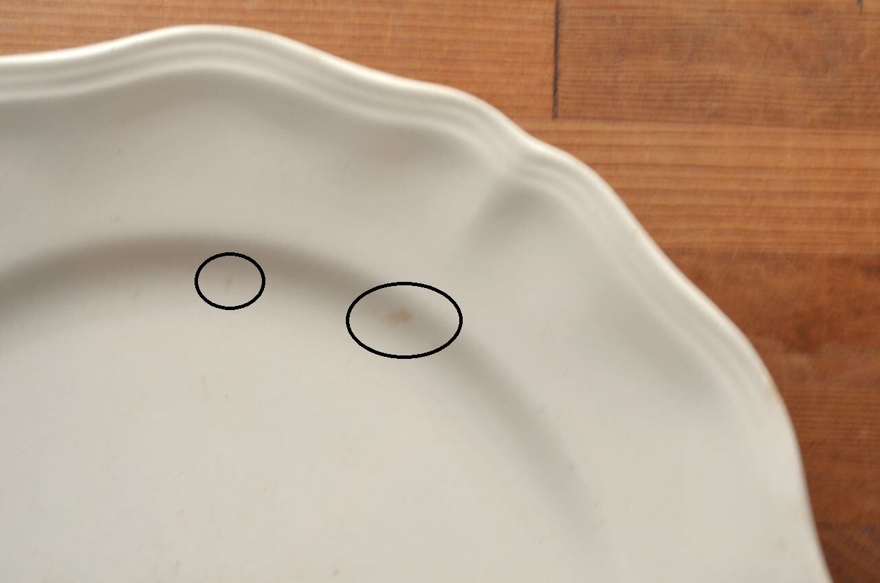 コンディション : 経年による、シミ、キズ、汚れ、貫入などあり、特にシミ(写真4~7〇)は表面に複数あります。又、リムに窯キズ以外に複数極小さなカケがあり、そこに(シミ写真8,10〇)が入り込んでいますが、それ程気にならないと思います。全体的には悪くはないと思いますが、シミが気になる方はご遠慮ください。