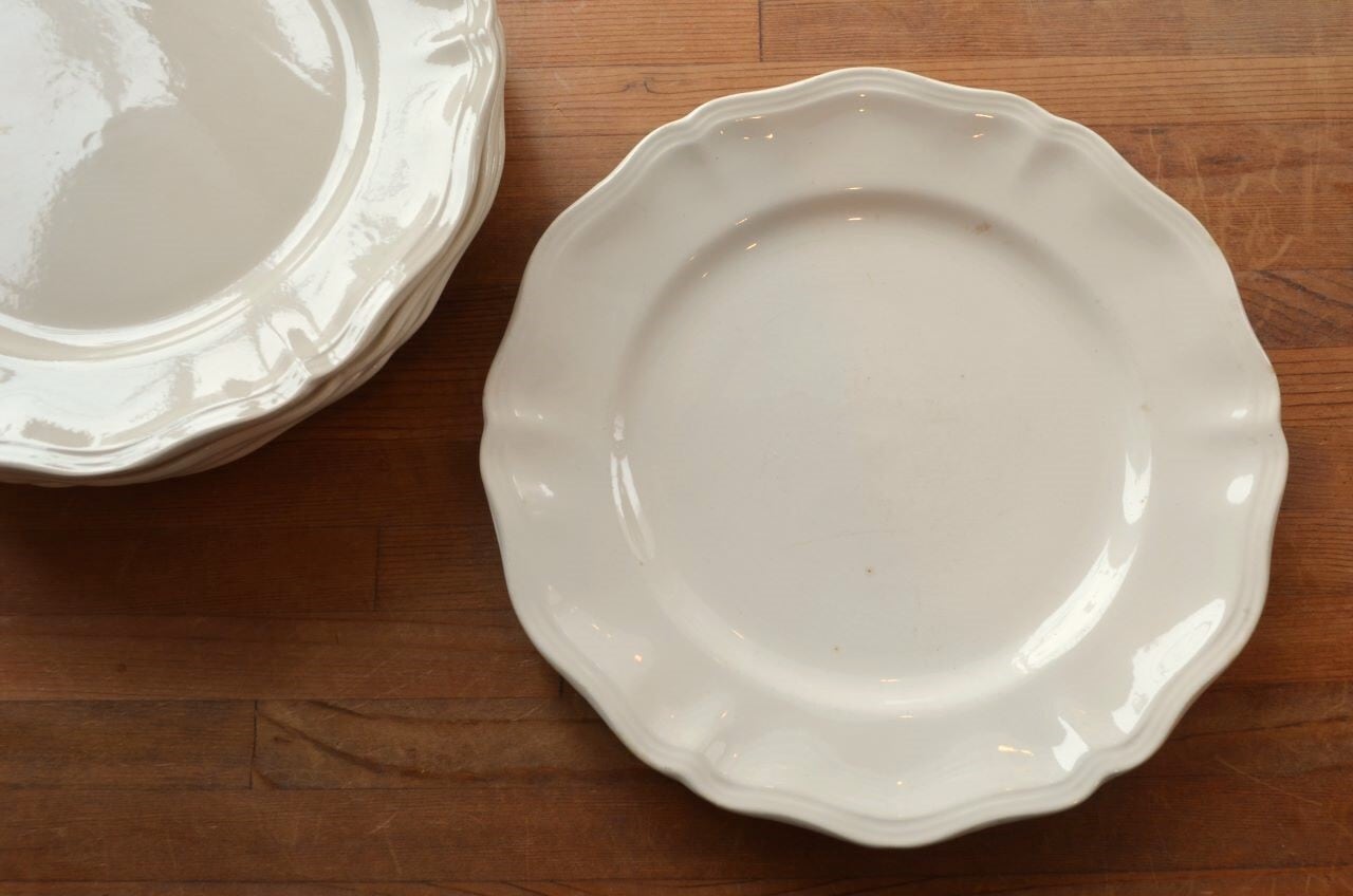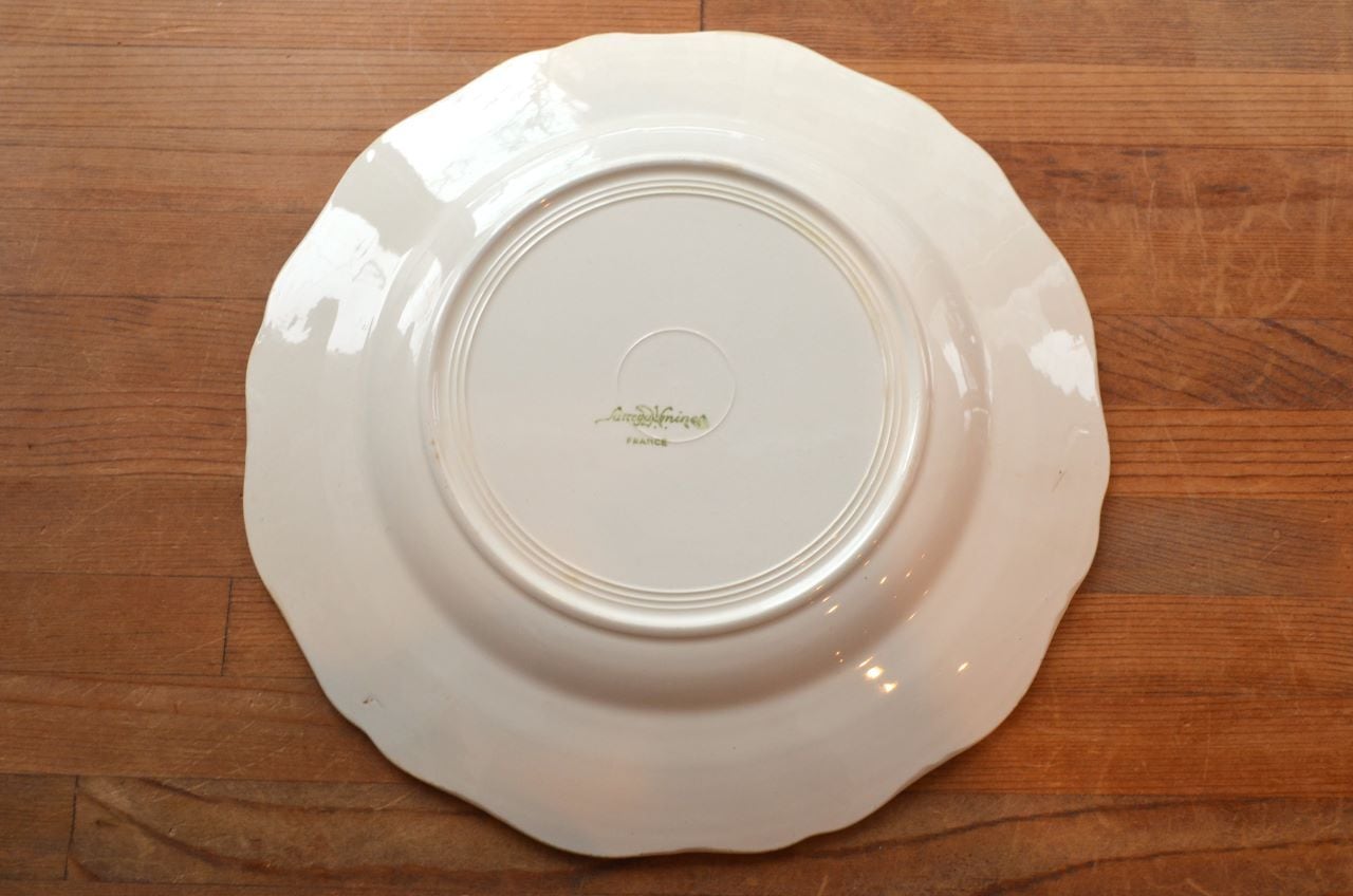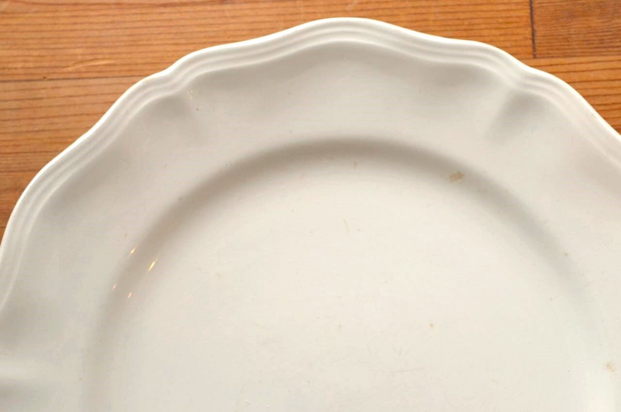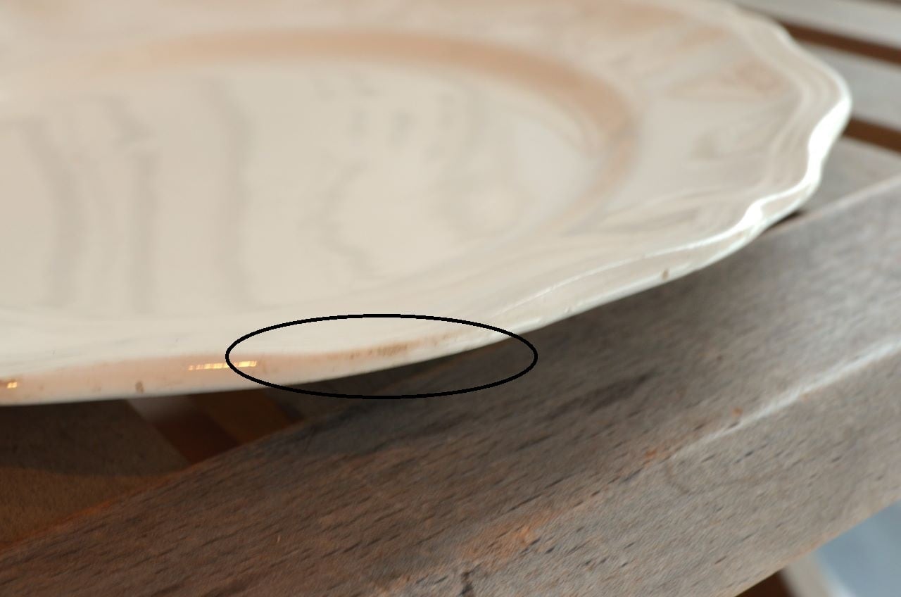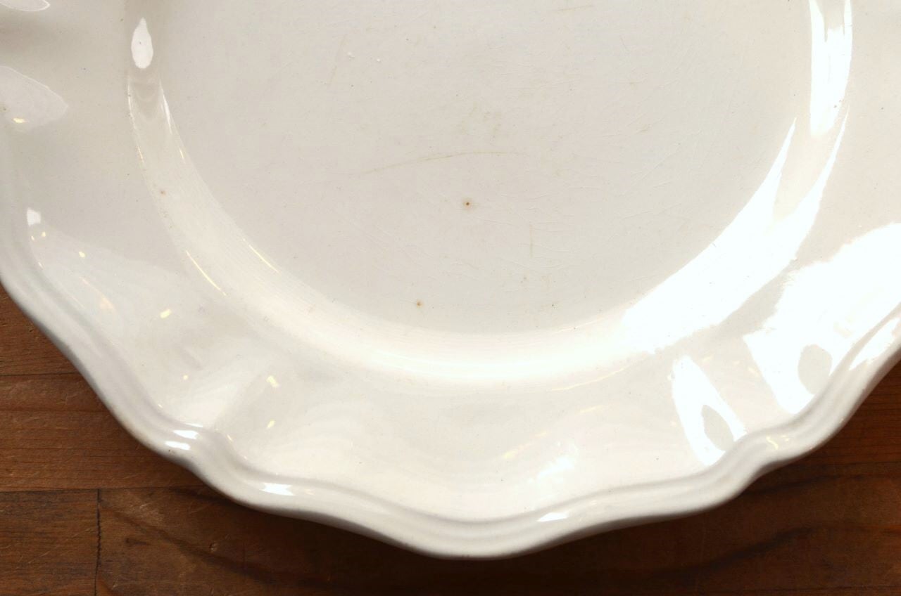 コンディション : 経年による、シミ、キズ、汚れ、貫入などあり、特にシミ(写真4~7〇)は表面に複数あります。又、リムに窯キズ以外に複数極小さなカケがあり、そこに(シミ写真8,10〇)が入り込んでいますが、それ程気にならないと思います。全体的には悪くはないと思いますが、シミが気になる方はご遠慮ください。