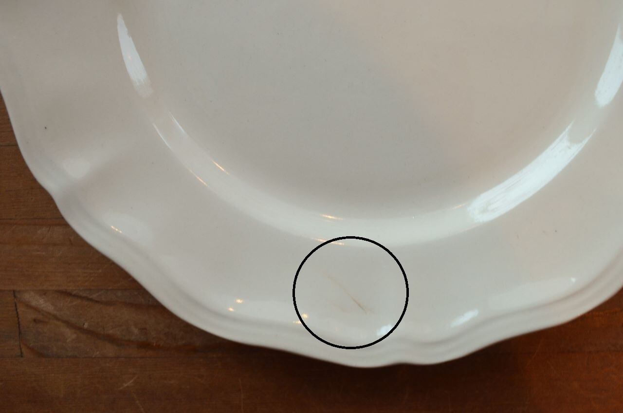 コンディション : 経年による、シミ、キズ、汚れ、貫入などありますが、窯キズ以外に目立ったカケなどはありません。尚、表面にブラウンの線(写真4〇)が付いています。全体的には大変綺麗で良好です。
