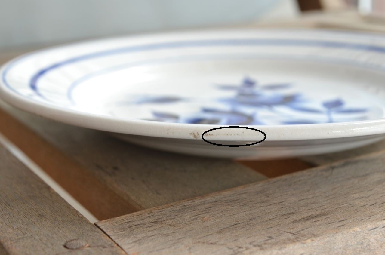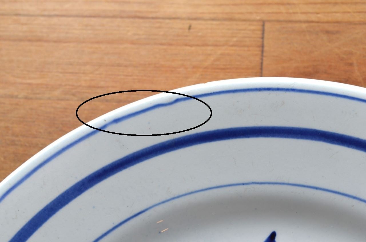 コンディション : 経年による、シミ、キズ、汚れ、貫入などありますが、目立ったカケなどはありませんが、リムの窯キズ横に若干の擦れ感(写真8)があります。又、表面に色が飛んでる部分(写真6△等)があり、製造時に付いた凸の先が割れてる部分(写真6〇)があります。写真7は、ラインが少し歪んでいます。全体的には大変綺麗で良好と思います。