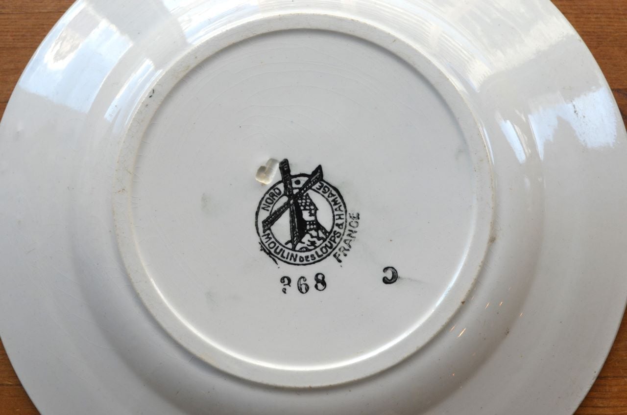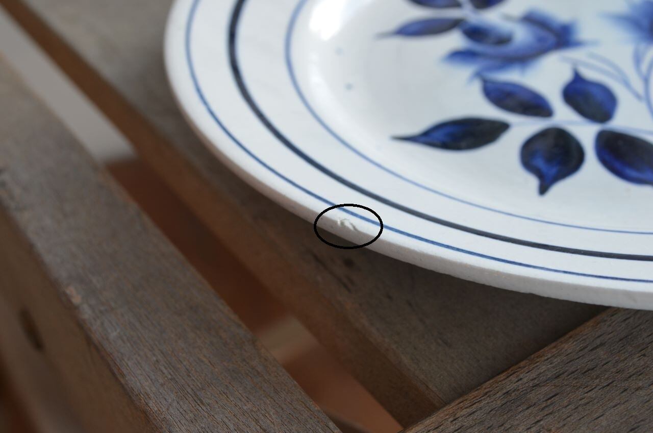 コンディション : 経年による、シミ、キズ、汚れ、貫入などあり、リムに1か所製造時に付いたカケに釉薬を塗っている部分(写真7)があり、リムの窯キズ横に擦れた感じの小さなカケ(写真6)が1か所あります。又、表面リム下に製造時に付いた極小さな凹凸(写真8〇)があり、ブルーの色が飛んでる部分(写真8△)もあります。全体的には大変綺麗で良好と思います。