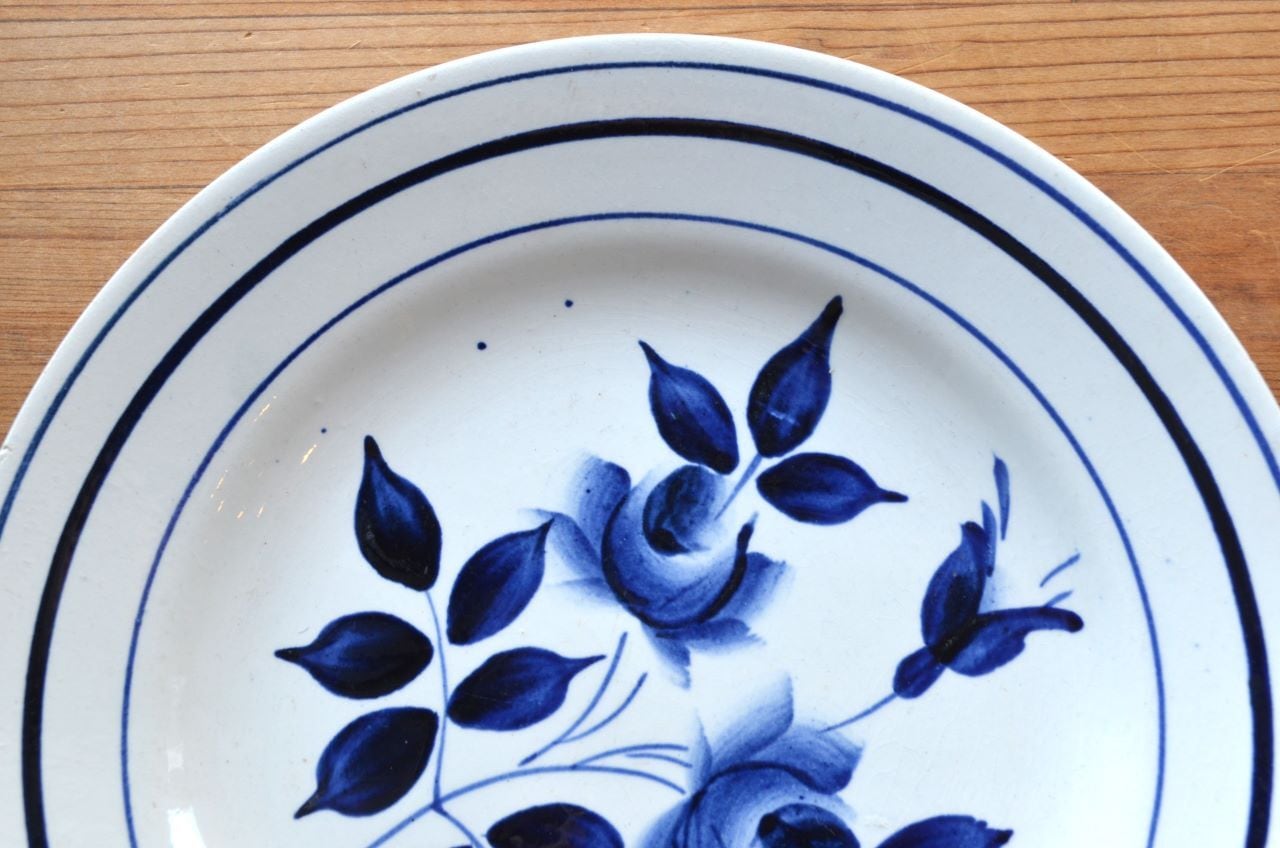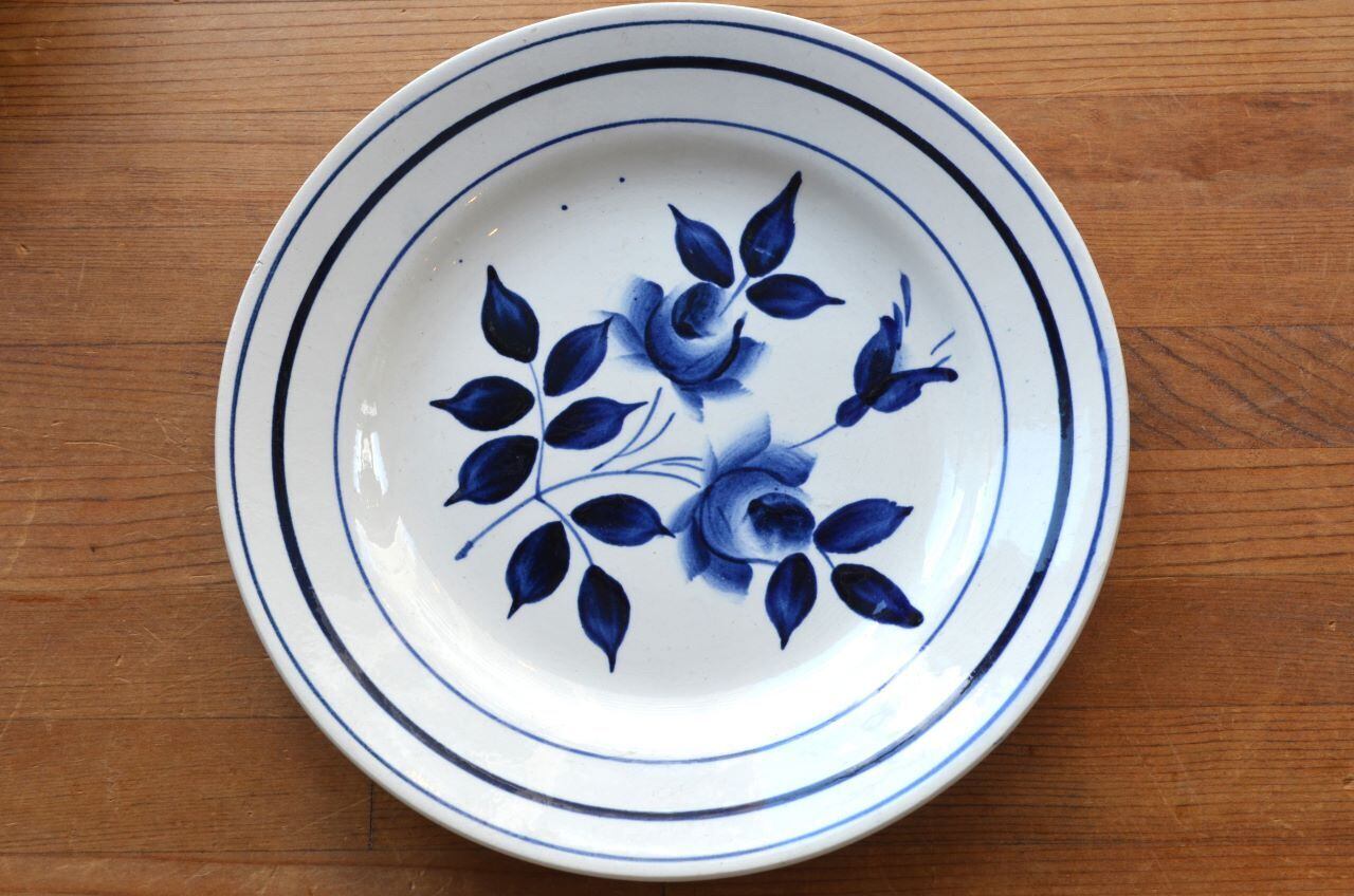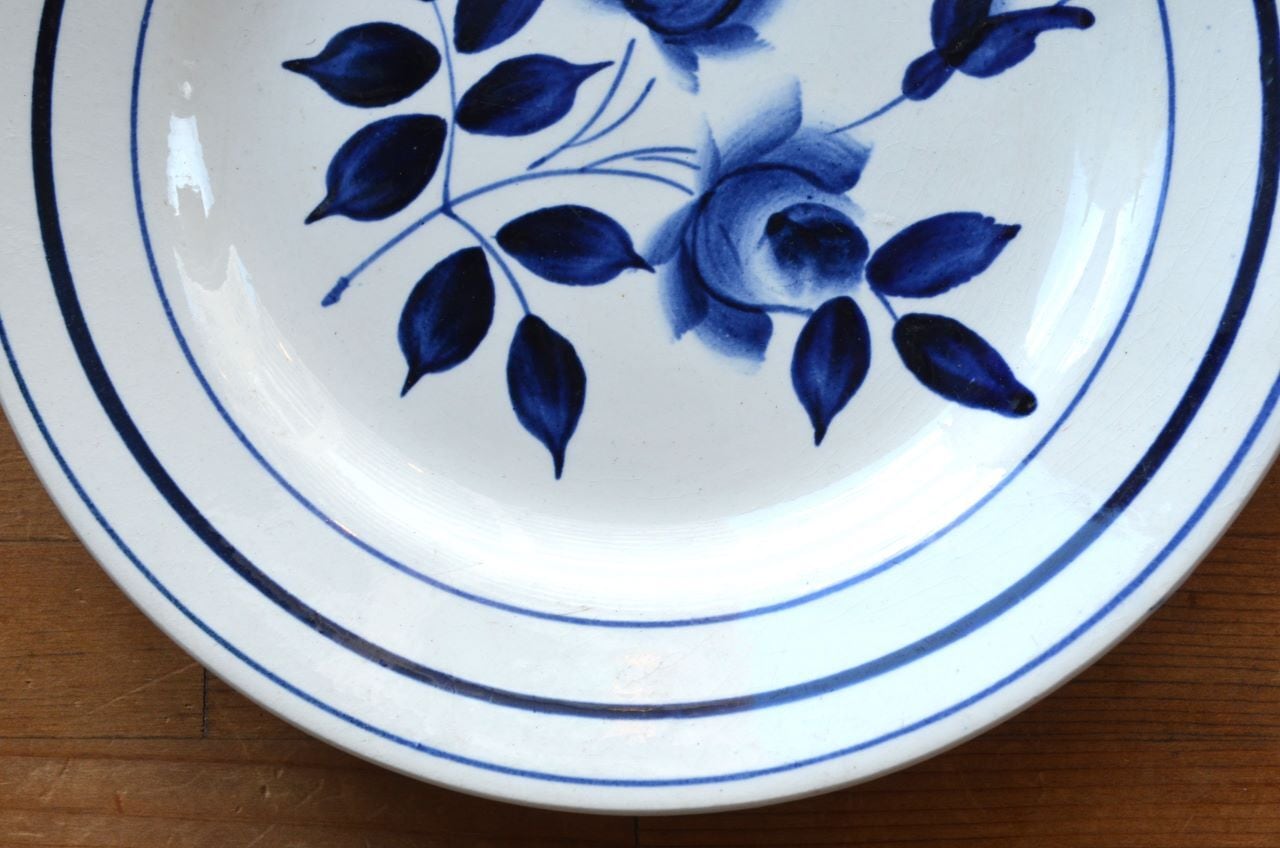 カラー : ホワイト地にダークブルーのローズ柄、中心部などは濃淡のグラデーション。リム下にも3本のブルーの濃淡のライン。