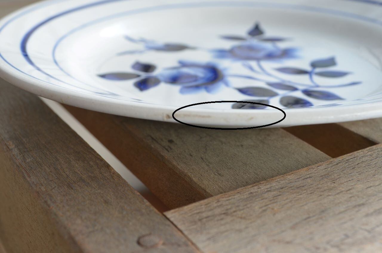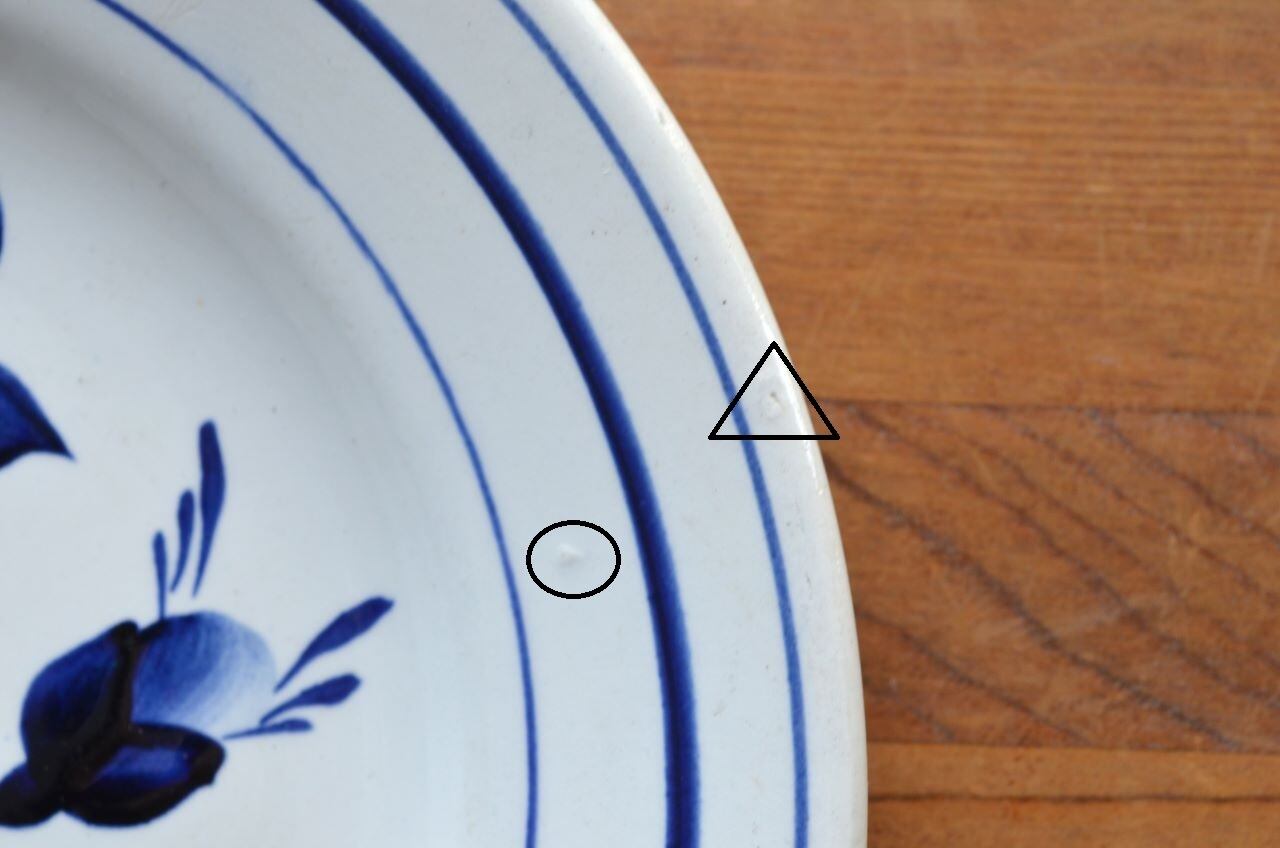 コンディション : 経年による、シミ、キズ、汚れ、貫入などあり、リムに1か所擦れた感じのカケ(写真9)があり、リムの窯キズ横も擦れ感(写真10)があります。又、色の滲み(写真8)やラインの歪み(写真4)が若干あります。尚、表面に製造時に付いた凹(写真6△)凸(写真6〇,7〇)がありますが、全体的には大変綺麗で良好と思います。