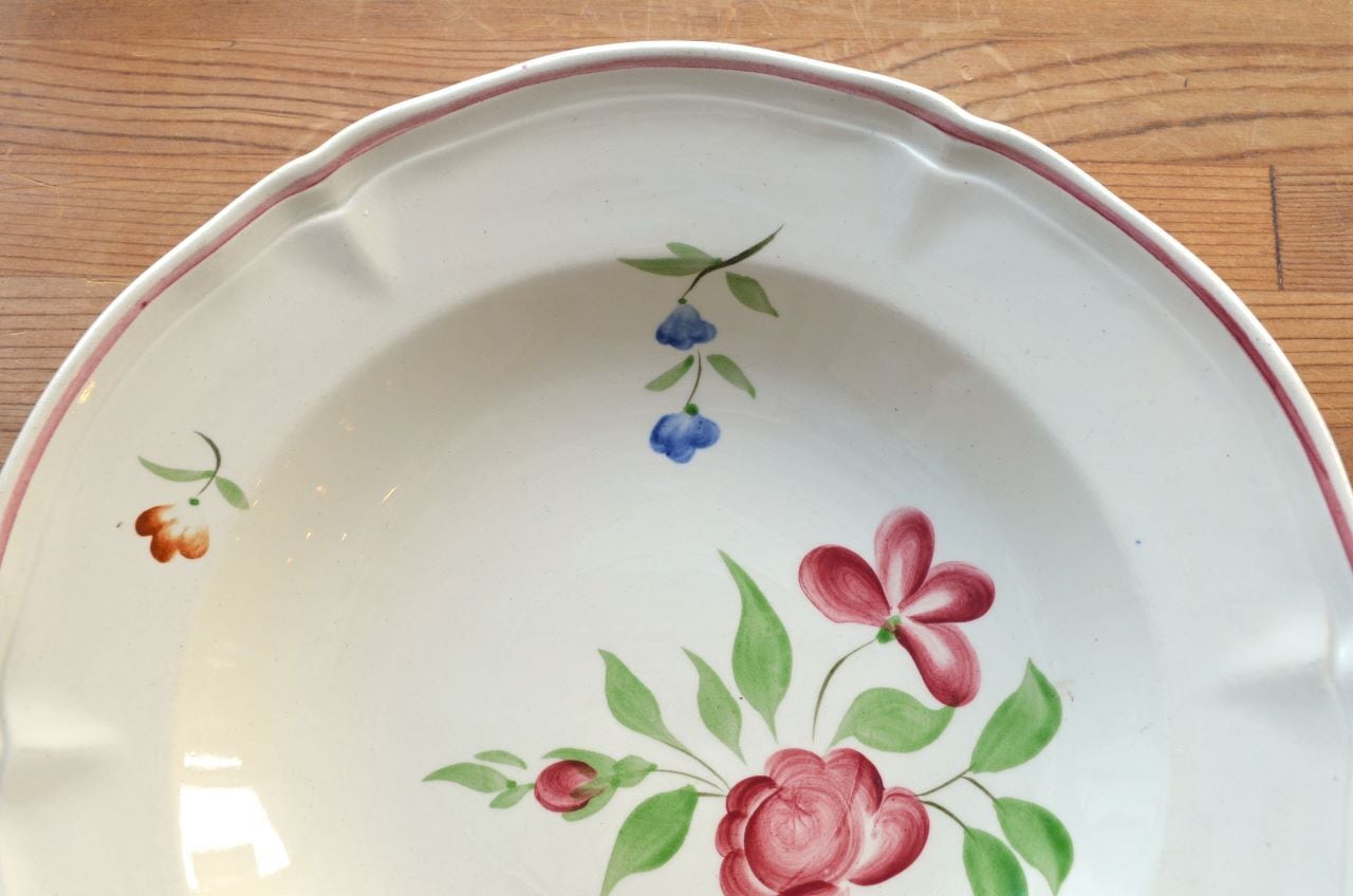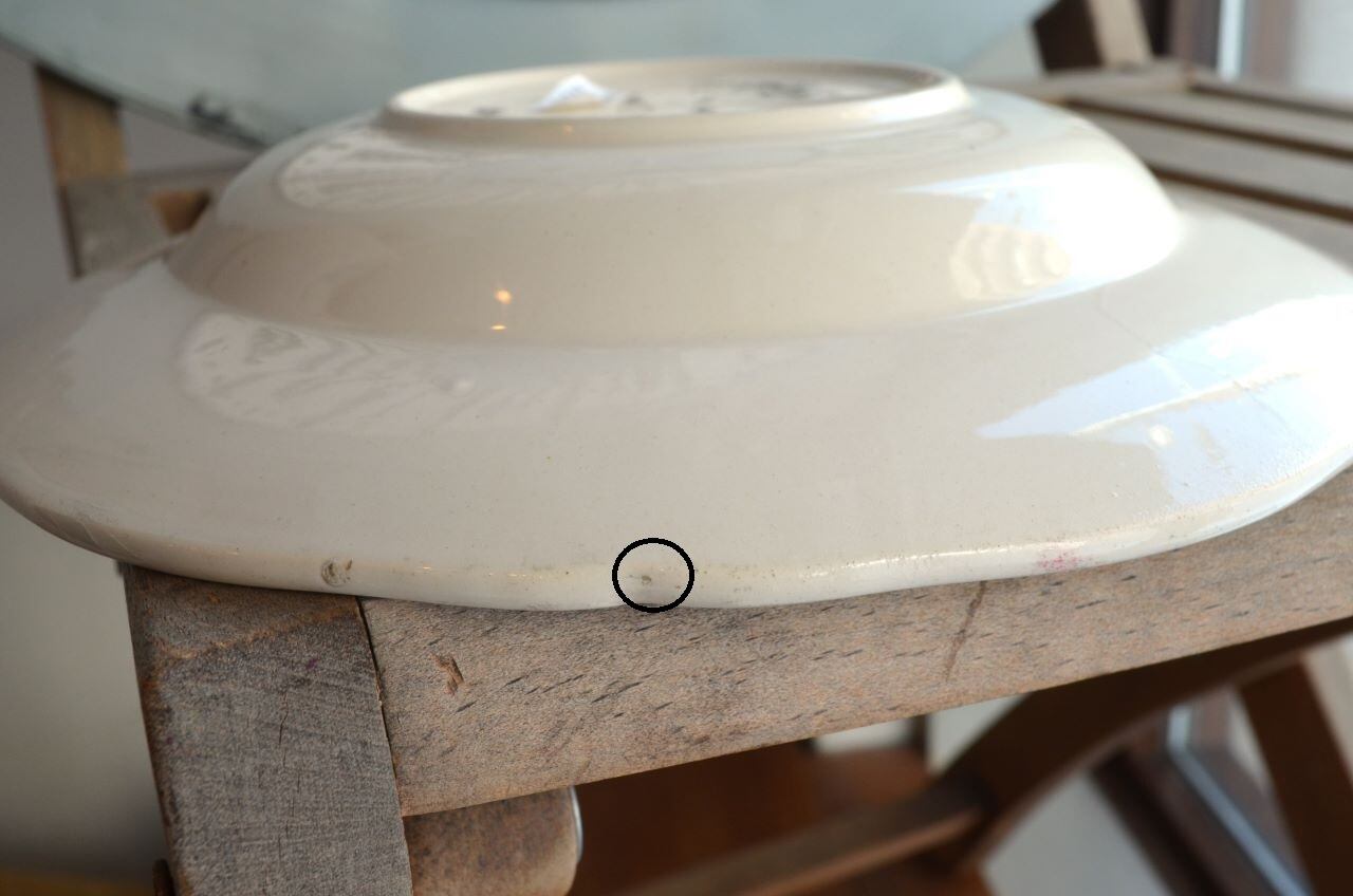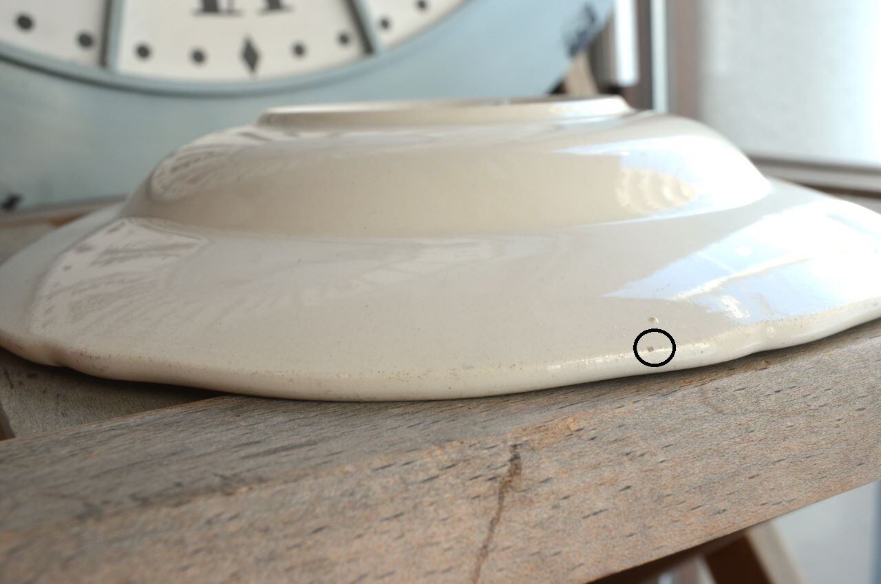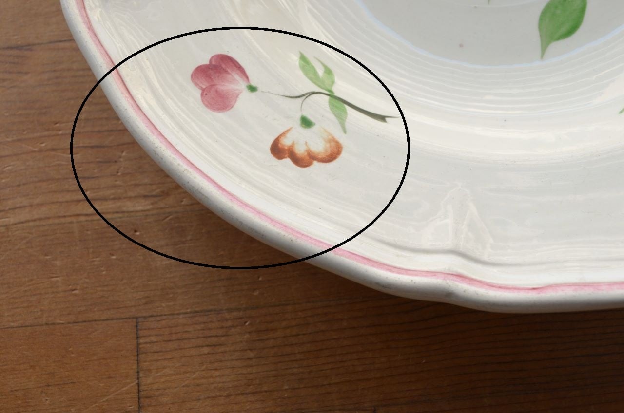 コンディション : 経年による、シミ、キズ、汚れ、貫入などあり、窯キズ以外にリムや裏側に極小さなカケ(写真7,8)が数か所ありますが、あまり気にならないと思います。又、リムに若干の擦れ感(写真6)があります。全体的には大変綺麗で良好でレアなスーププレート思います。