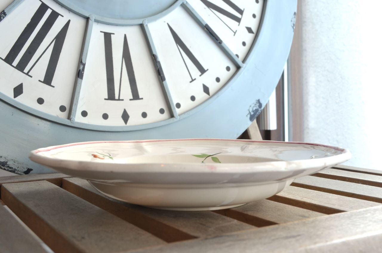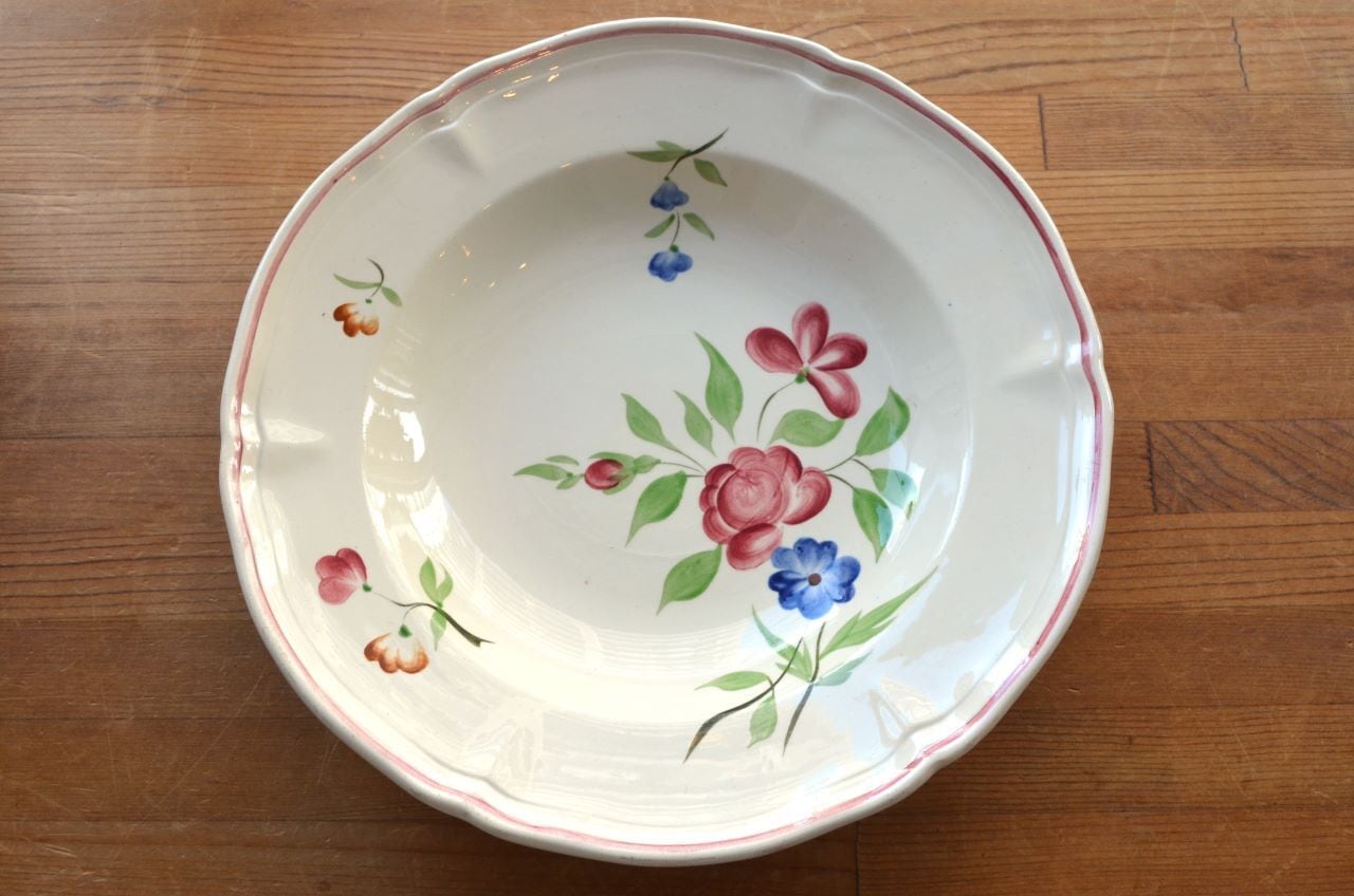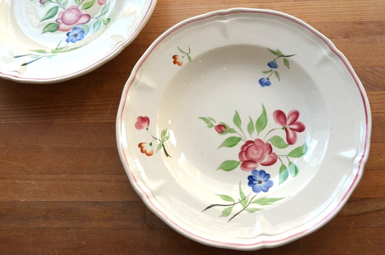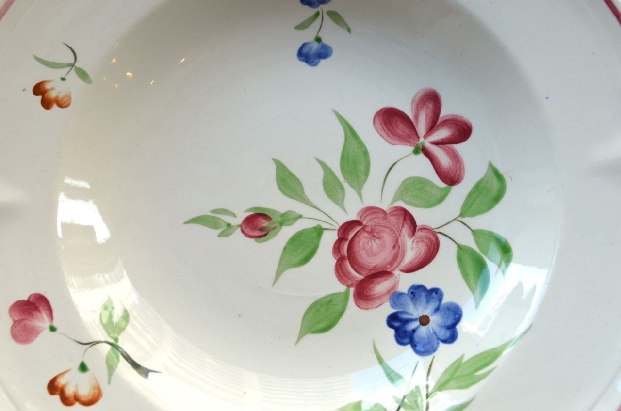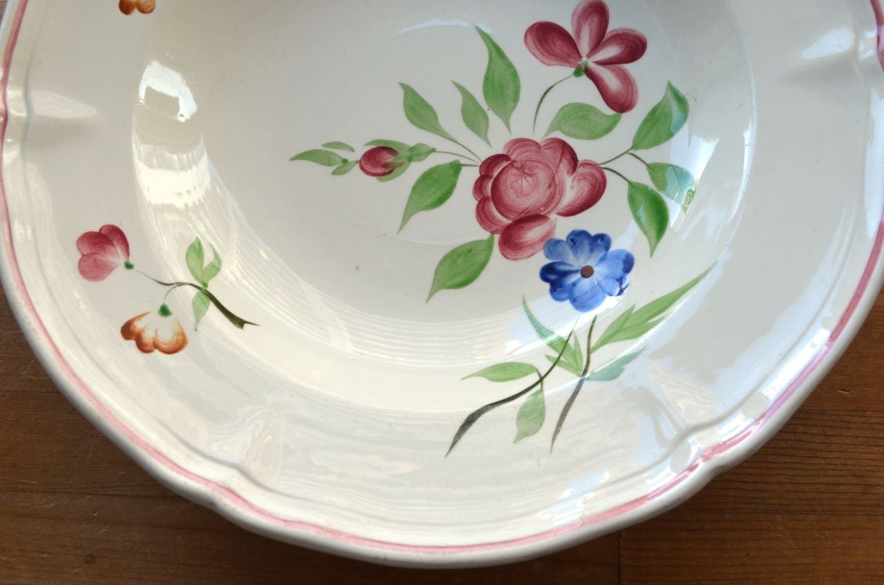 コンディション : 経年による、シミ、キズ、汚れ、貫入などあり、窯キズ以外にリムや裏側に極小さなカケ(写真7,8)が数か所ありますが、あまり気にならないと思います。又、リムに若干の擦れ感(写真6)があります。全体的には大変綺麗で良好でレアなスーププレート思います。