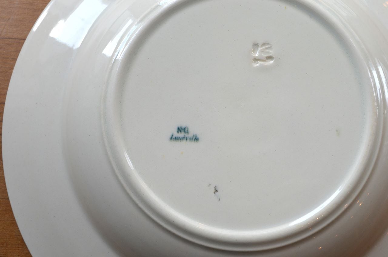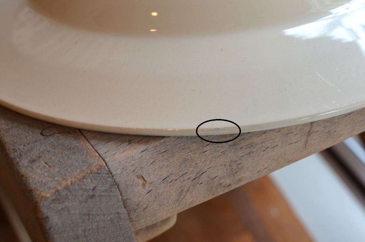 コンディション : 経年による、シミ、キズ、汚れ、貫入などあり、裏側リムにカケ(写真6〇)がありますが、それ程気にならないと思います。全体的には、薄いブルーグレーのお色が優しく、大変綺麗で良好と思います。