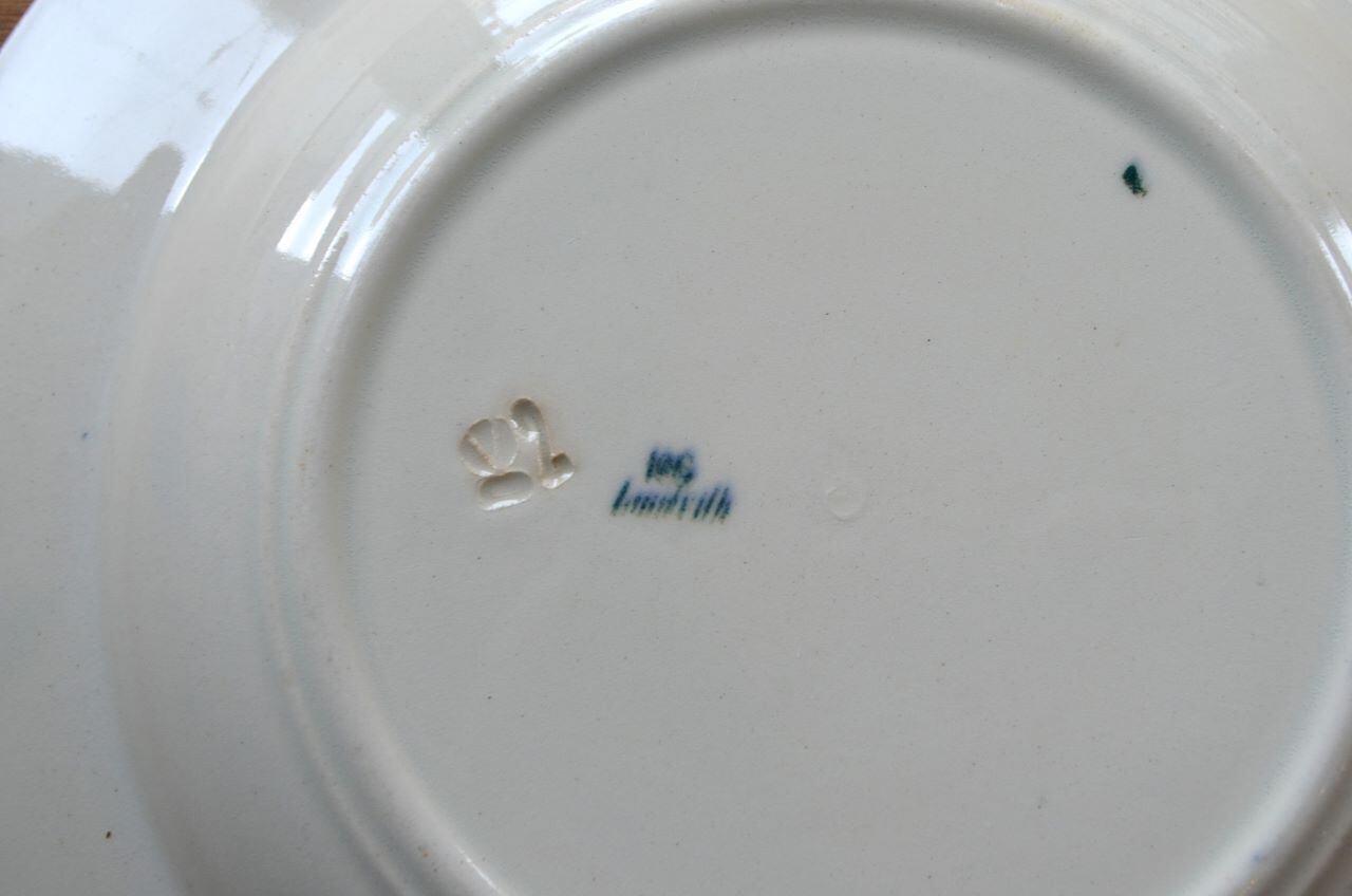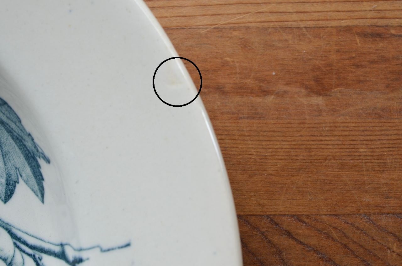 コンディション : 経年による、シミ、キズ、汚れ、貫入などあり、リムの窯キズ(写真6〇)が若干大きく、その横に7.0mm程のヒビ(写真6▭)が入っています。又、写真7の〇は釉薬の塗り残しです。全体的には、薄いブルーグレーのお色が優しく、大変綺麗で良好と思います。