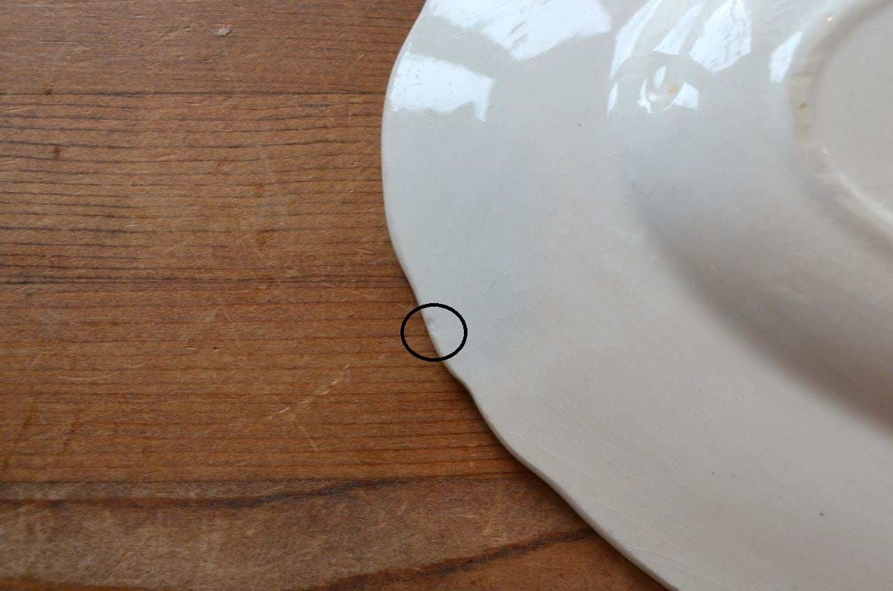 コンディション : 経年による、シミ(写真9〇)、キズ(写真8〇)、汚れ、貫入などあり、写真2の左〇のキズは製造時に付いたものと思われ、その横の右〇の小さな黒い点も、写真8の▭も製造時に付いたものです。尚、裏側リムにカケ(写真10〇)がありますが、ほとんど目立たないと思います。全体的には大変綺麗で良好と思います。