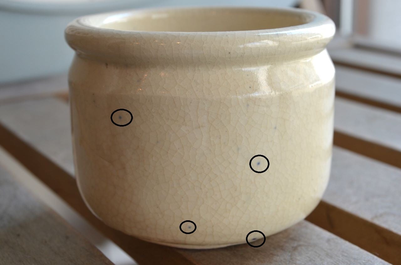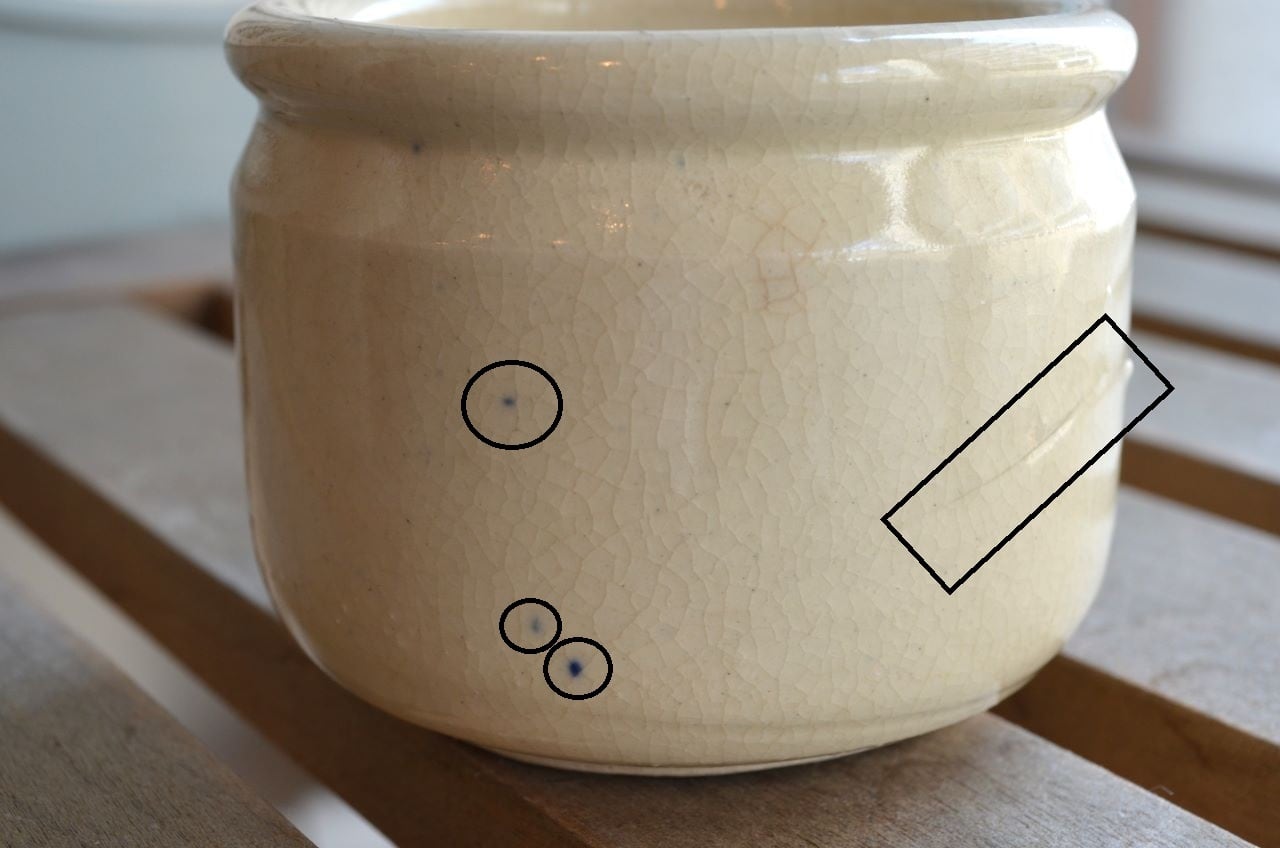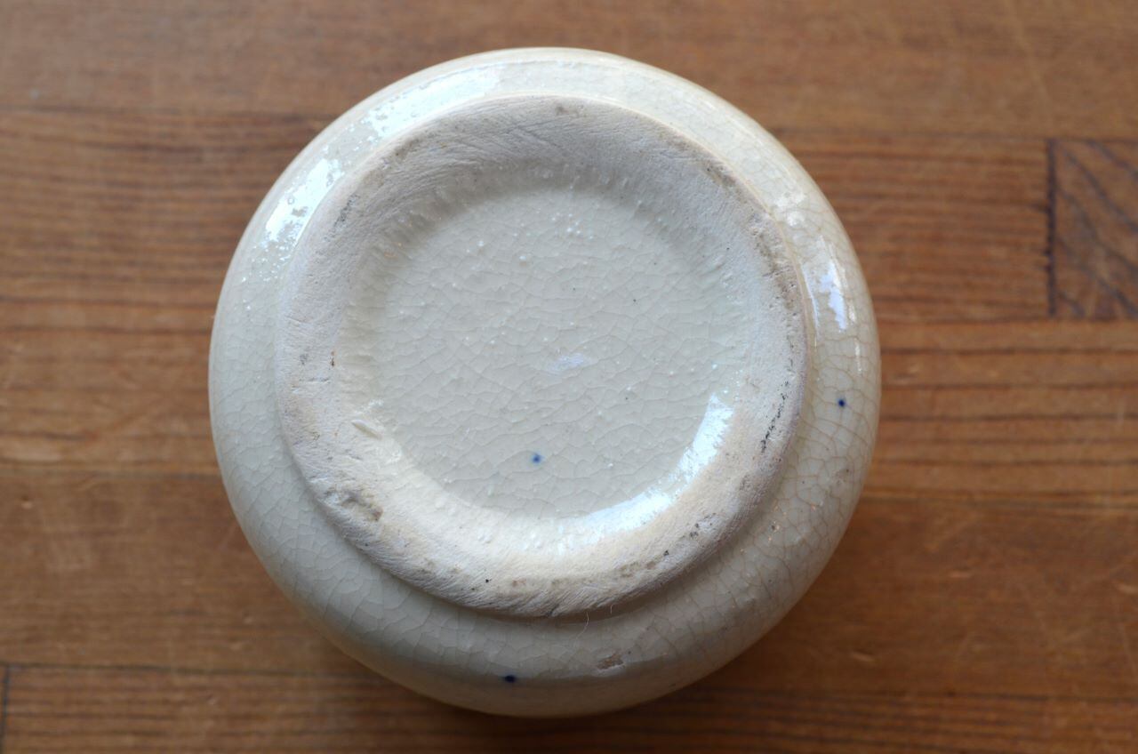 コンディション : 経年による、シミ、キズ(写貫4▭)などありますが、目立ったカケなどはなく、大変綺麗で良好です。尚、製造時に付いた青い点(写真2,3,4〇、写真5)や製造時の釉薬の塗り残し(写真2△)があります。