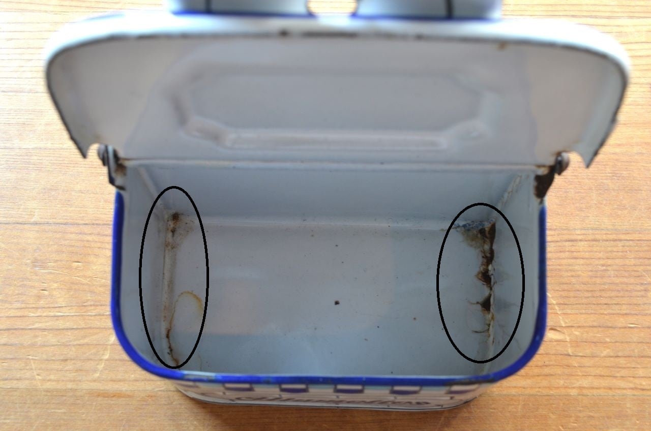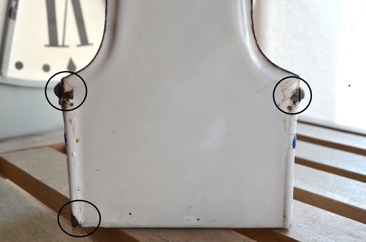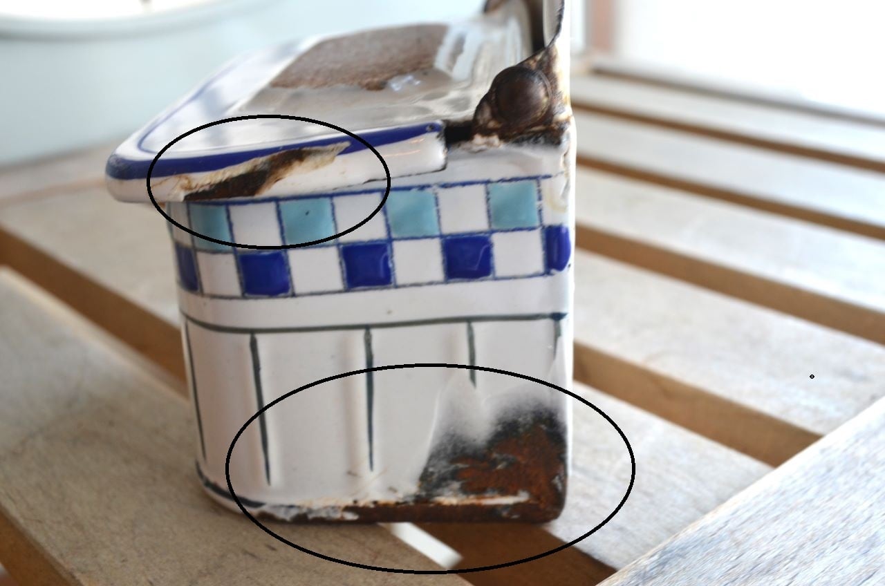 コンディション : 経年による、シミ、キズ、汚れ、サビ、ホーロー部分が剥がれている箇所(写真2,3,5~11)など多くあります。尚、上部の蓋中央のブラウン(写真4)はマッチを擦った為のもので、サビではありません。全体的には悪くはないと思いますが、サビなど気になる方はご遠慮ください。
