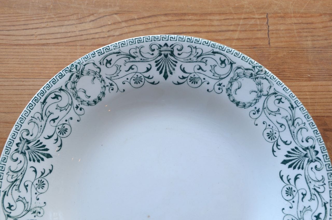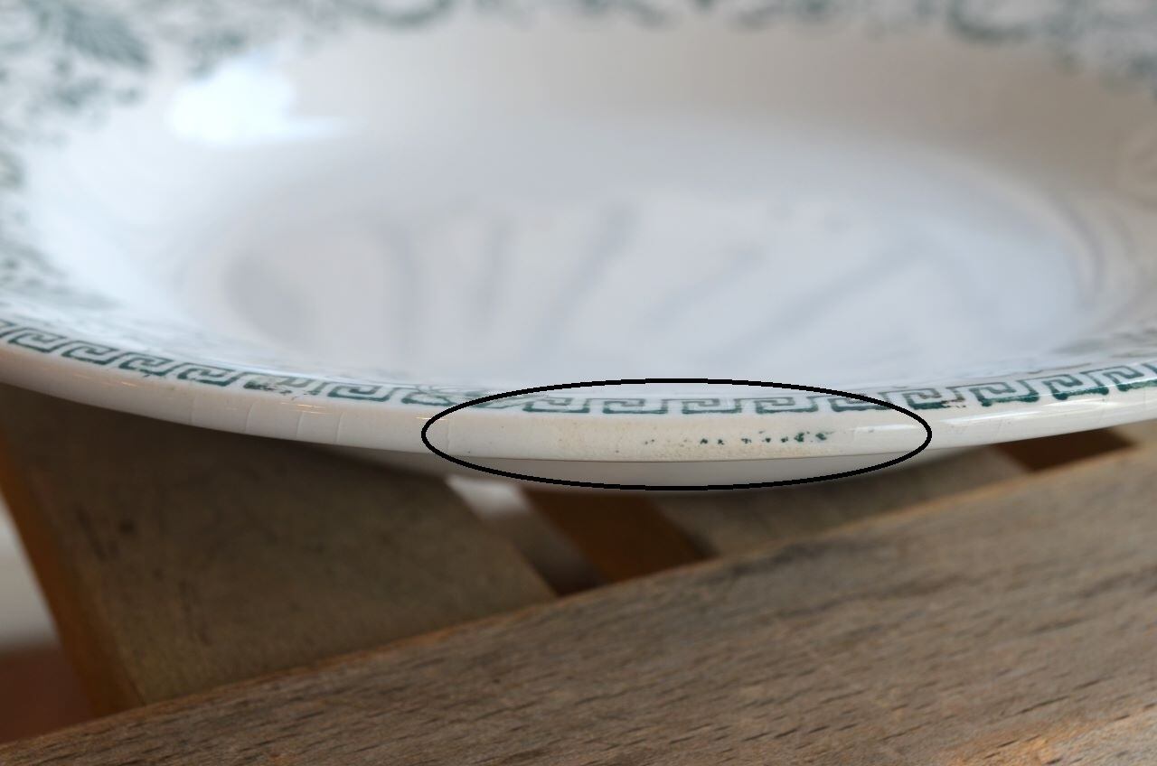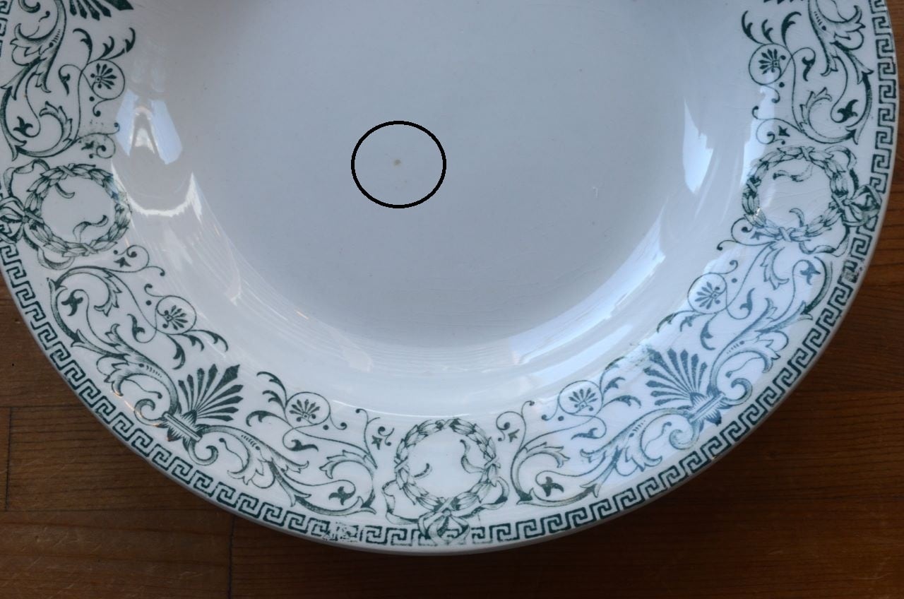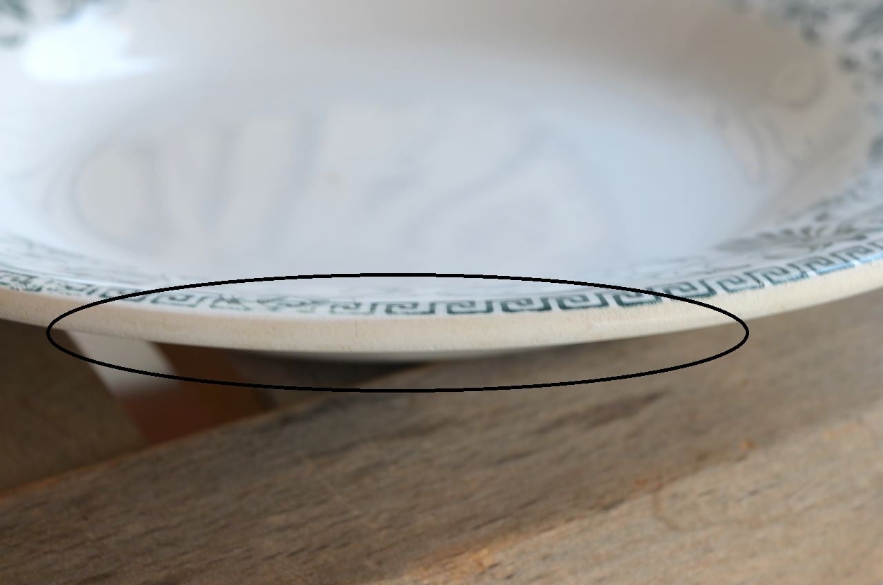 コンディション : 経年による、シミ(写真3〇)、キズ、汚れ、貫入などありますが、目立ったカケなどなく、大変綺麗で良好と思います。尚、写真6,7〇は若干の擦れ感があり、写真8▭は、製造時に付い極小さな穴です。いずれもそれ程気にならないと思います。アールヌーヴォーの時代の大変素敵なスーププレートです。
