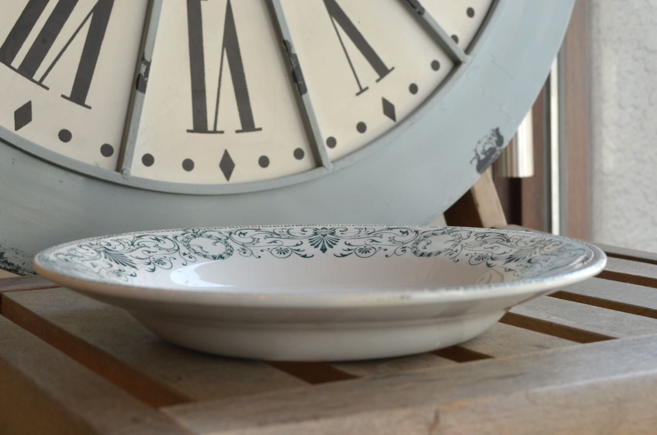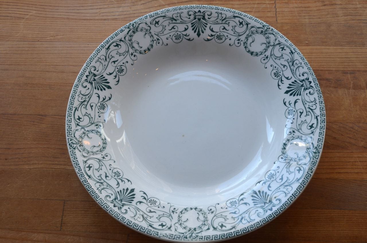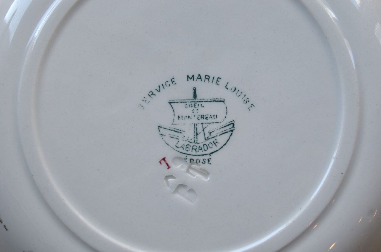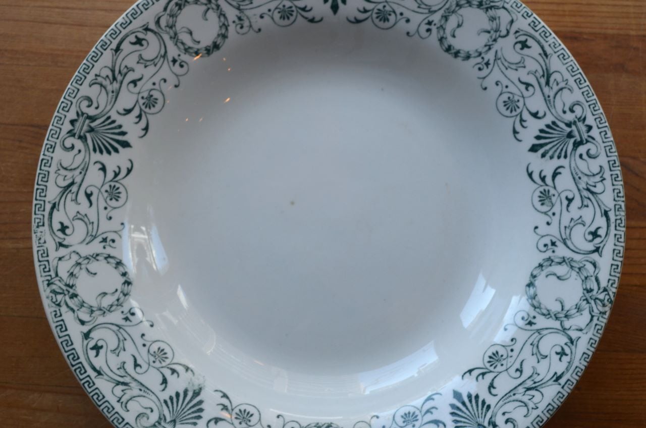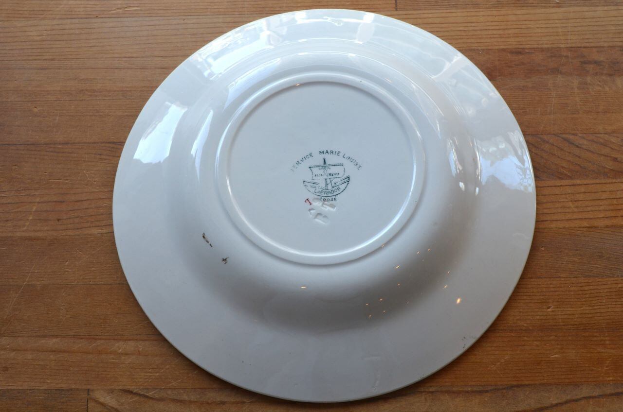 コンディション : 経年による、シミ(写真3〇)、キズ、汚れ、貫入などありますが、目立ったカケなどなく、大変綺麗で良好と思います。尚、写真6,7〇は若干の擦れ感があり、写真8▭は、製造時に付い極小さな穴です。いずれもそれ程気にならないと思います。アールヌーヴォーの時代の大変素敵なスーププレートです。