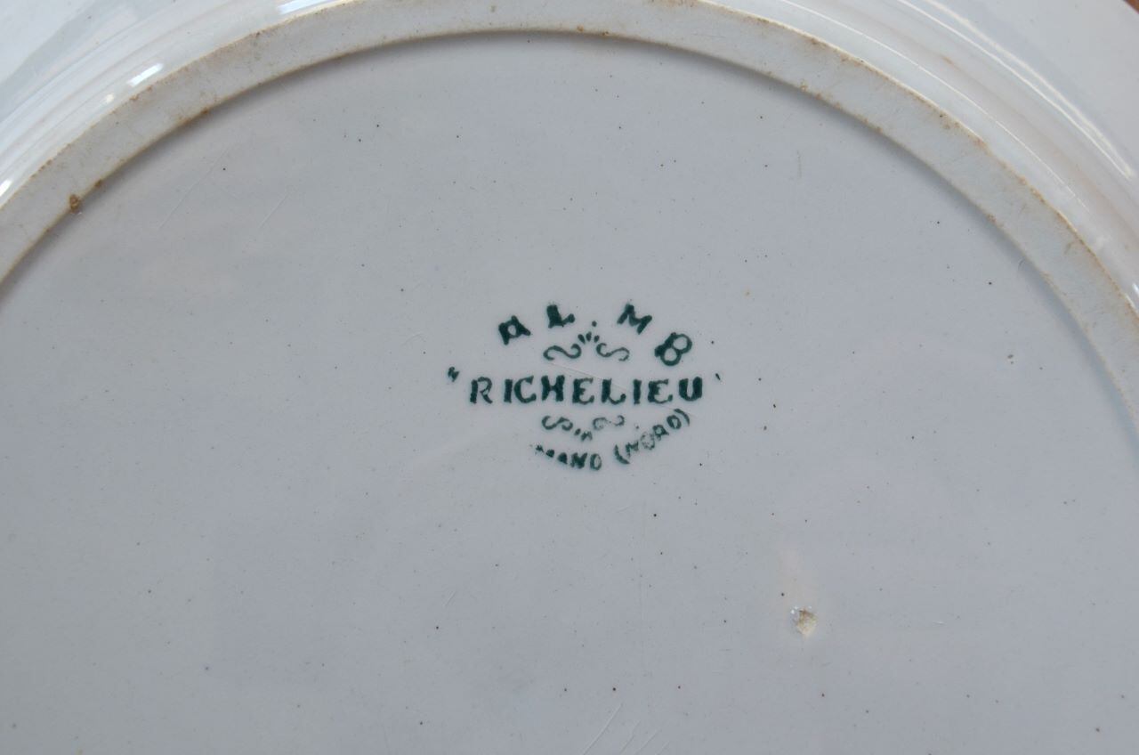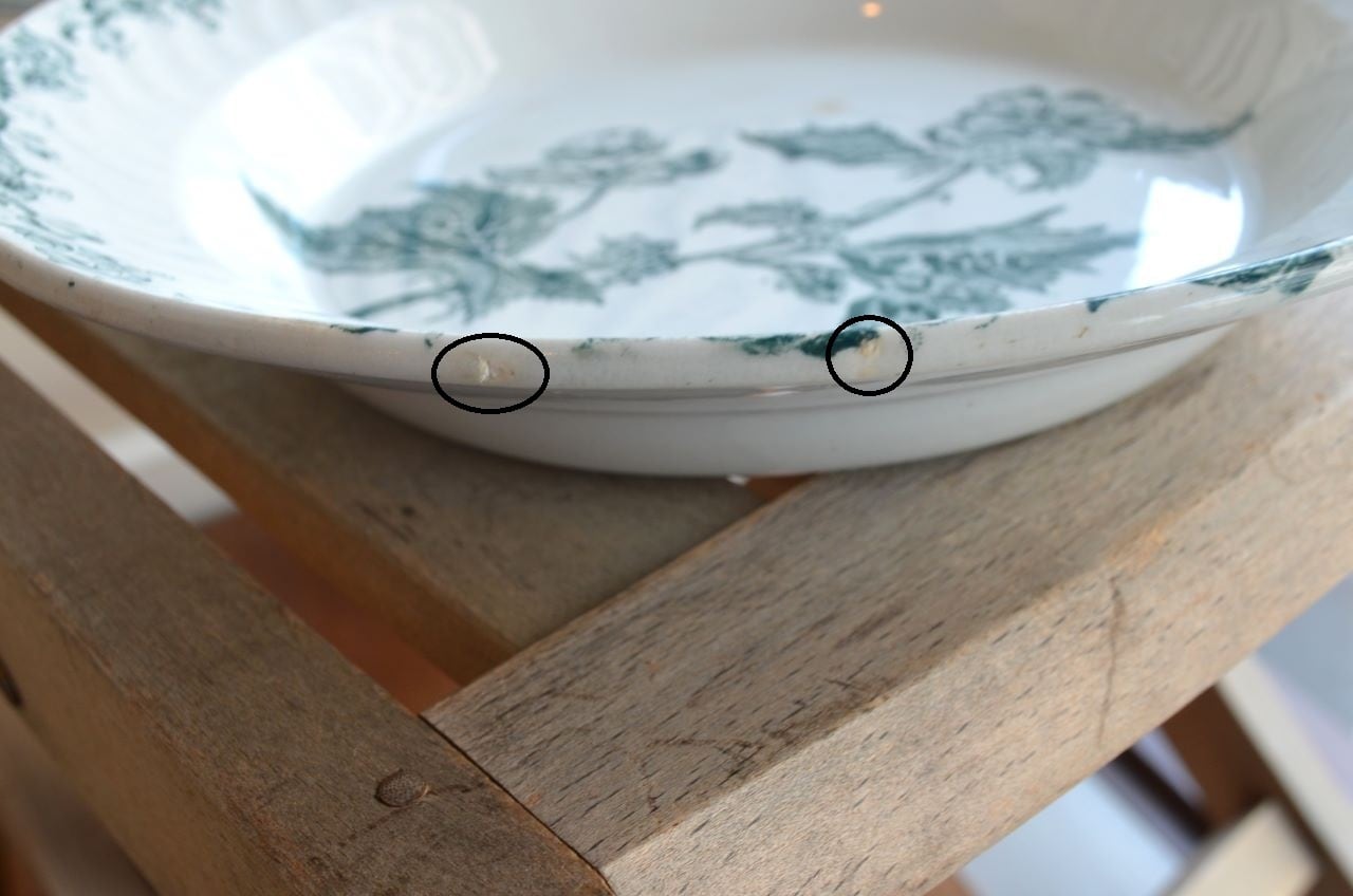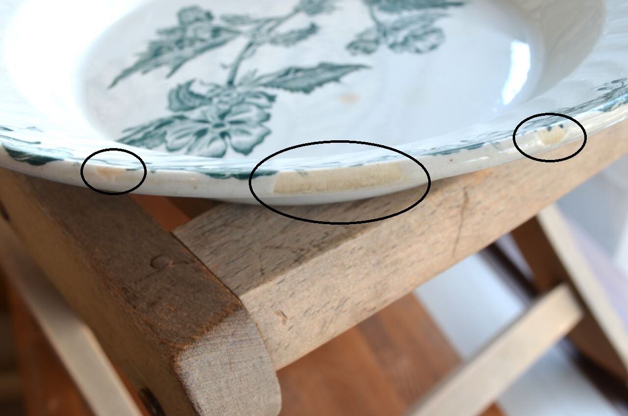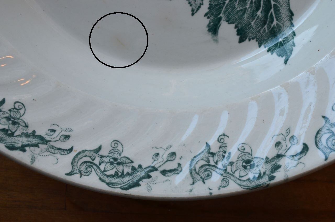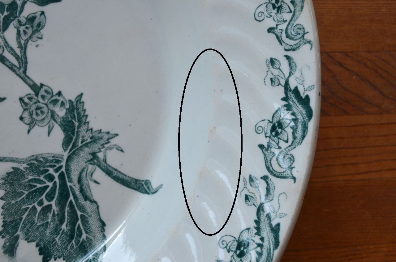 コンディション : 経年による、シミ、キズ、汚れ、貫入などあり、特に表面にφ8.0mm程のシミ(写真5〇)と、0.7mm程のキズ(写真6〇)から周りがブラウンがかっている部分があり、比較的目立っています。又、内側の立ち上がり部分全体に擦れ感(写真7〇)があります。更に、リムに大き目のカケが3か所(写真9〇)あり、窯キズ(写真10~12〇)も若干大きいですが、カケと窯キズはリムの模様でそれ程目立たないと思います。全体的には悪くはなく、リムのフラワー装飾も素敵なサラディエと思います。