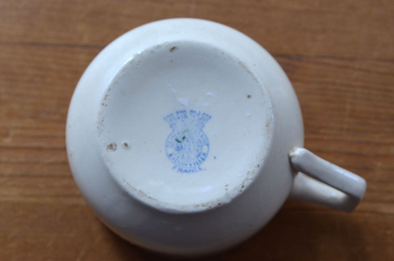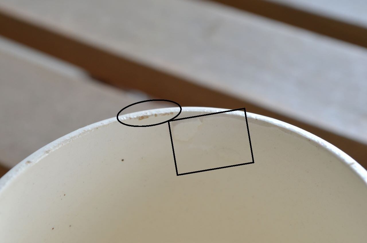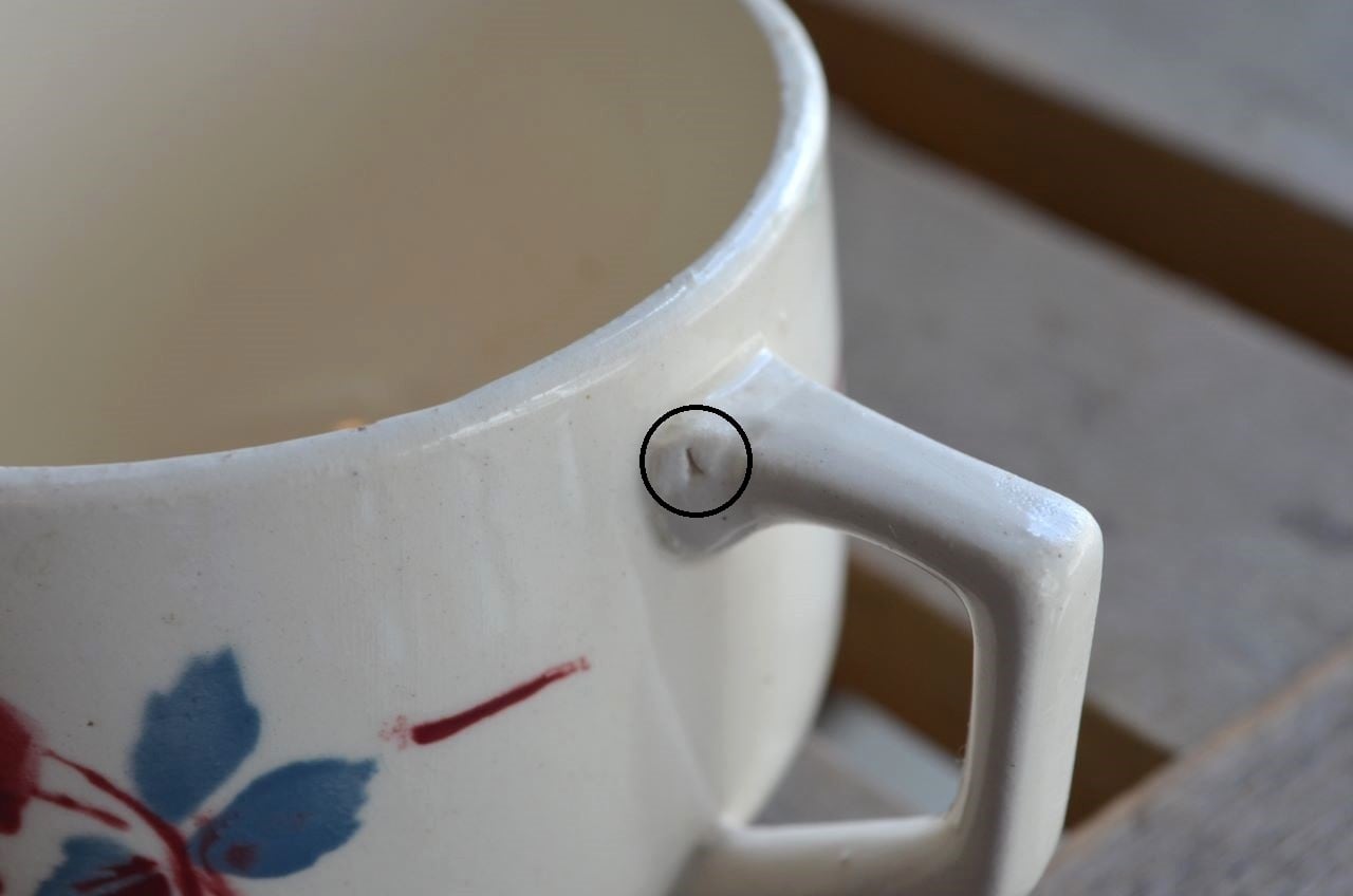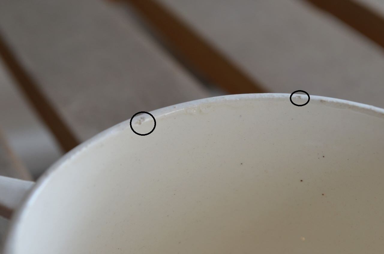 コンディション : 経年による、シミ、キズ、汚れ、貫入などあり、リムに窯キズ以外に数か所極小さなカケ(写真5~7〇)があります。又、写真8〇は製造時についたもので、内側にも製造時に付いた凸(写真5▭)があります。全体的には良好と思います。