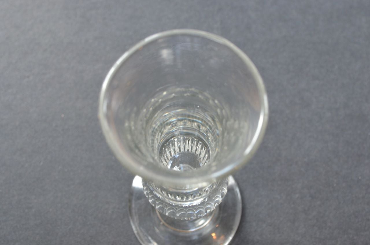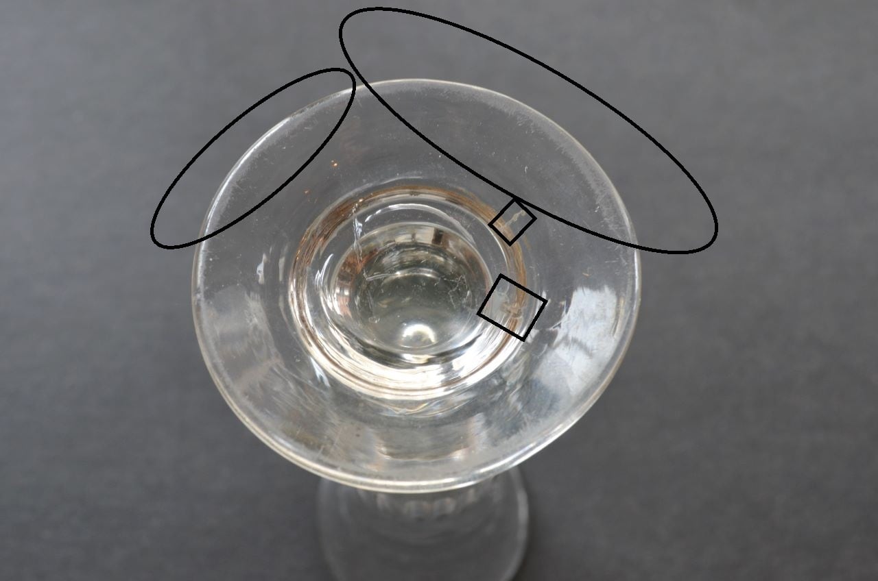コンディション : 経年による、シミ、キズ、汚れなどあり、本体下部のカット部分に数か所擦れた感じの極小さなカケ(写真5〇)があり、写真以外にも若干ありますます。又、底裏側は若干擦れて(写真6〇)いて、製造時に付いたと思われるキズ(写真6▭)が2か所あります。全体的には良好で、上下のカットが素敵なウォッカグラスと思います。