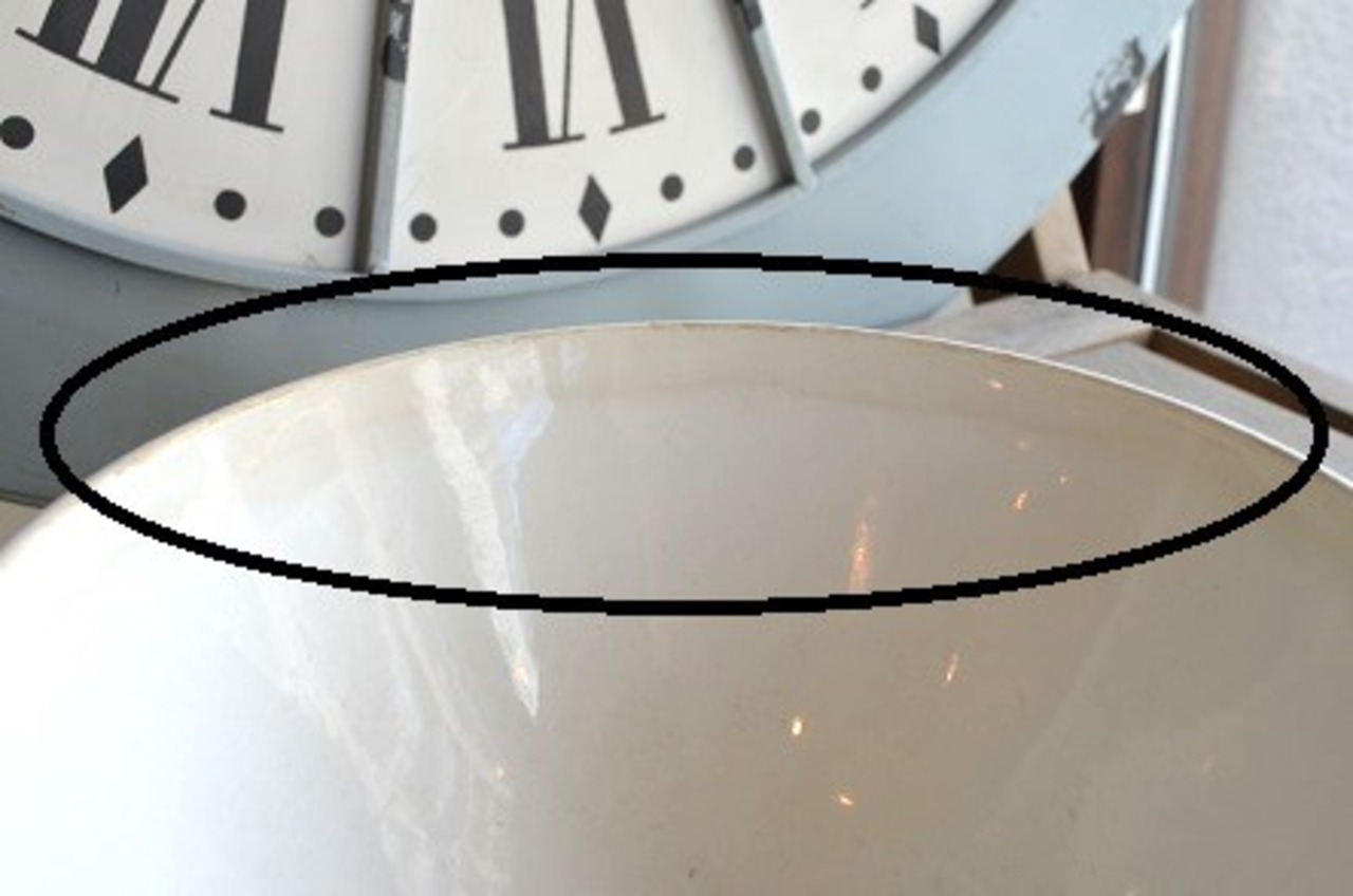 コンディション : 経年による、シミ、キズ、汚れ、貫入などあり、特にリムの内側上部を1.0cm程をシミ(写真4)が一周しています。又、リムの外側(写真2,3)にはかなりのカケがあり、内側にはカケや擦れ感(写真4)があります。全体的にはカケなどかなりありますが、この大きさは大変レアで、存在感があり、悪くはないと思います。但し、気になる方はご遠慮ください