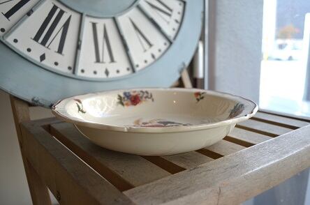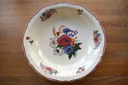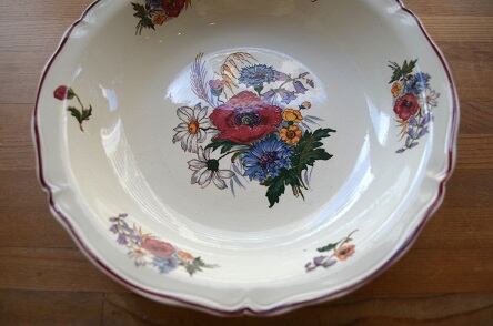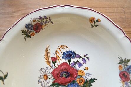 カラー : アイヴォリー地に、フランスの国旗のトリコロールの花、矢車菊(ブルー)、マーガレット(ホワイト)、ひなげし;ポピー(レッド)を中心に、ホタルブクロ;釣鐘草(パープル)、麦(イエロー)とキンポウゲ(?)(イエロー)が描かれています。又、花リムの内側にレッドのラインが入っています